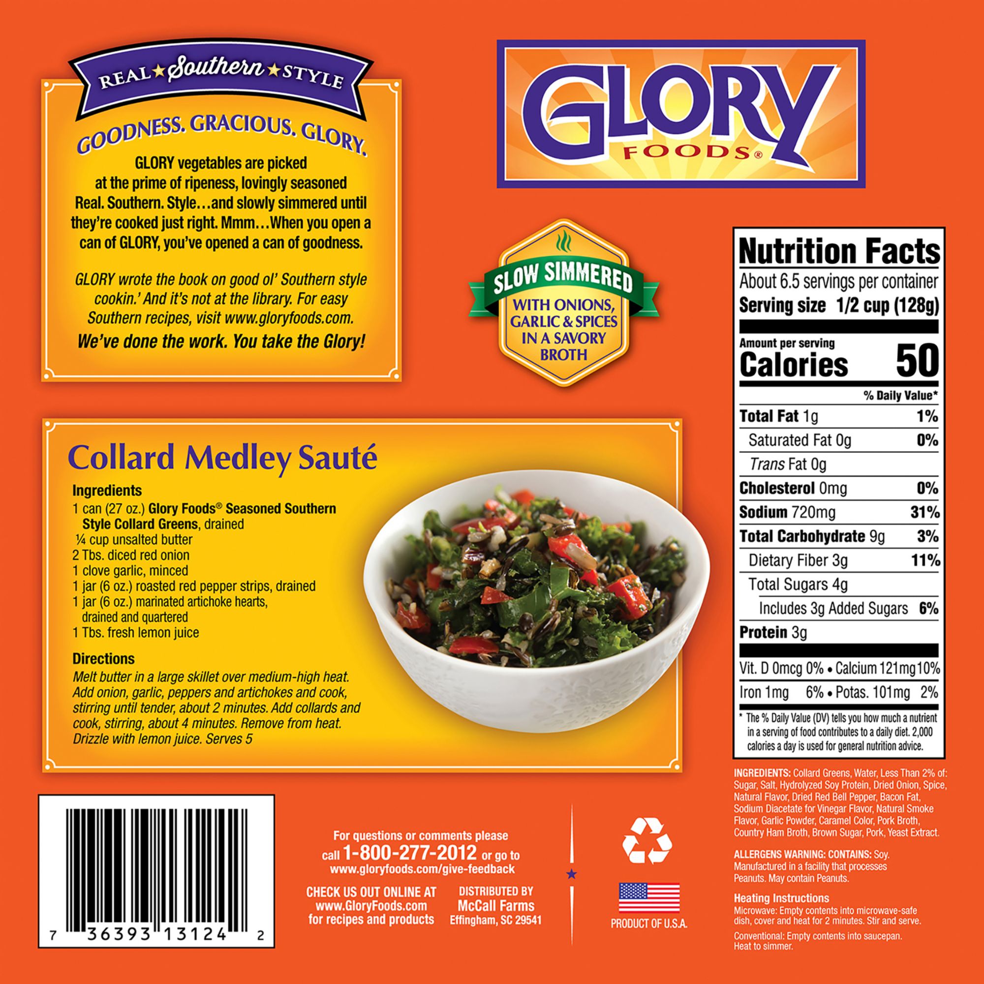 Glory Foods Seasoned Real Southern Style Collard Greens are slow simmered in a savory broth for real Southern style flavor. Cooked with Southern seasoning, onions, garlic and spices, these flavorful collard greens offer real Southern style food made easy. Glory canned collard greens are a simple, heat and eat item when you want Southern style greens in a hurry. These gluten free greens are low in cholesterol and saturated fat, making them a heart healthy choice for Southern style meals. Canned greens are also packed with nutrients like calcium and vitamin E. Eat these canned vegetables by themselves, serve them as a tasty side dish or use them to bring a little Southern style to your favorite recipe. You can even use these cooked collards to make irresistible smoked mac 'n cheese or greens over cornbread when you entertain. To pack in all the flavor and nutrients from fresh collard greens, these southern style greens are quickly canned after harvesting. Choose Glory Foods Seasoned Real Southern Style Collard Greens for real Southern style food that you can heat and eat in minutes.