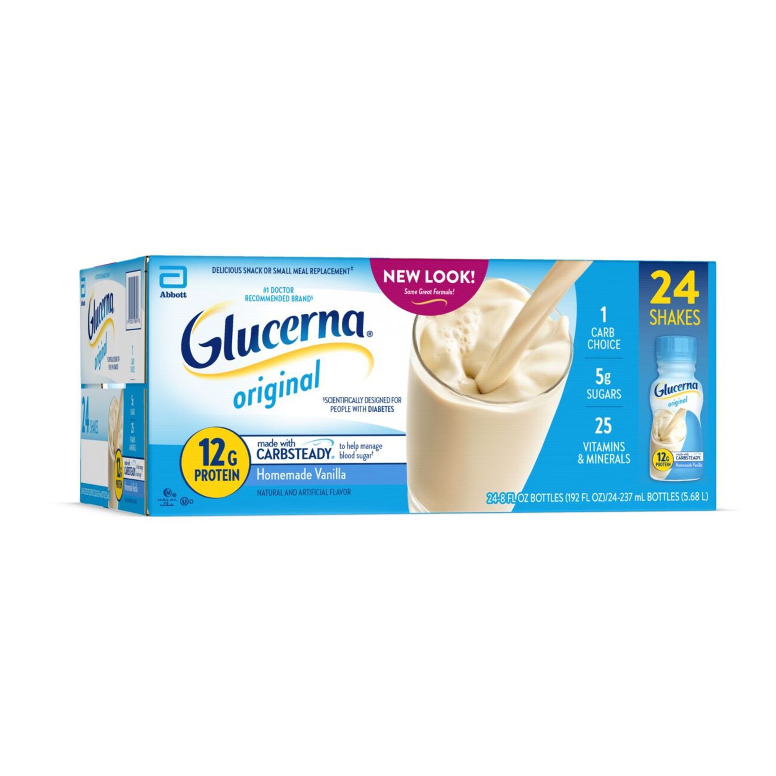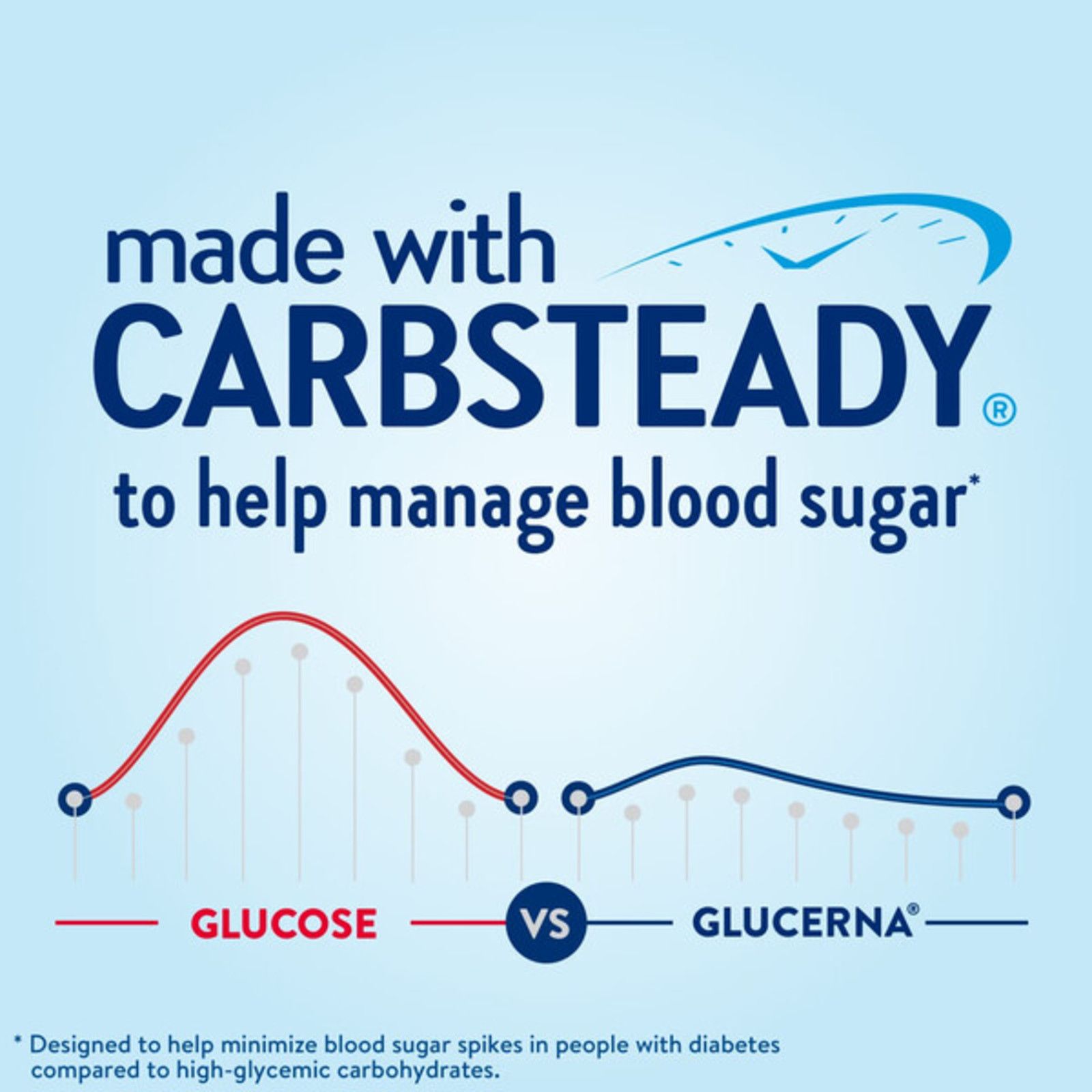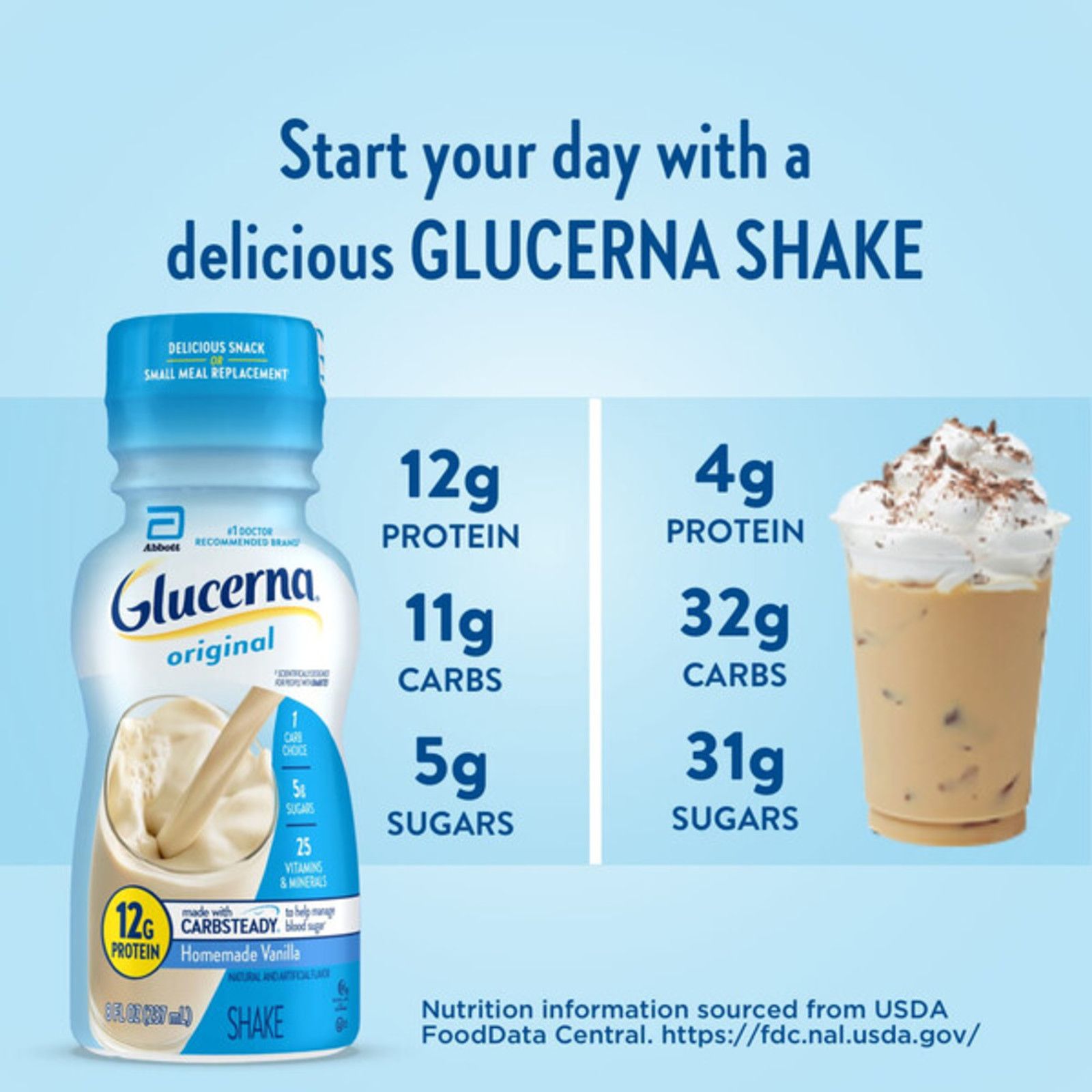 Glucerna Original nutrition shakes are scientifically designed to help people with diabetes manage blood sugar.* Our shakes have CARBSTEADY, unique blends of slow-release carbohydrates, as well as 12g of high-quality protein, vitamins A & D, zinc, and antioxidants (vitamins C & E). They make delicious grab-and-go meal or snack replacements.† Gluten-free and suitable for lactose intolerance, but not for people with galactosemia. Glucerna is the #1 nutrition brand recommended by doctors for people with diabetes. * Designed to help minimize blood sugar spikes compared to high-glycemic carbohydrates. † Replace one poor meal or snack choice.