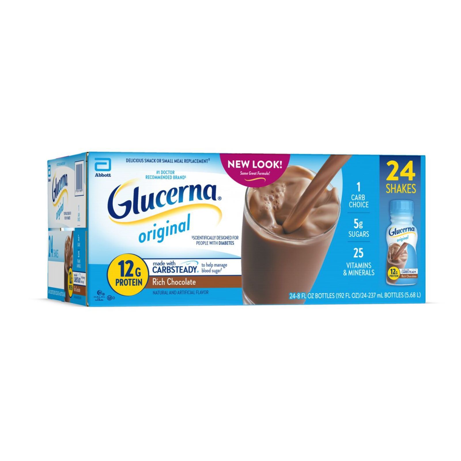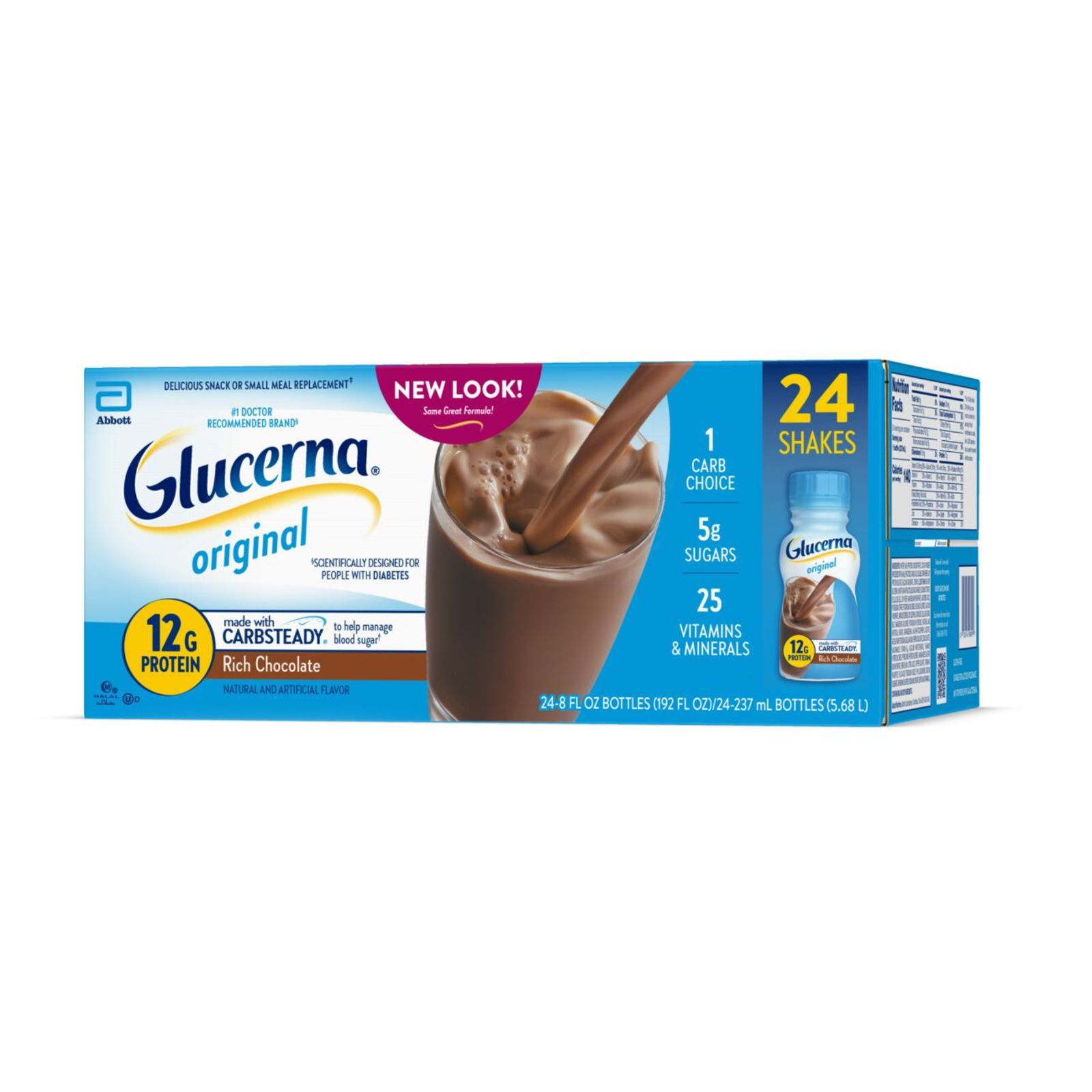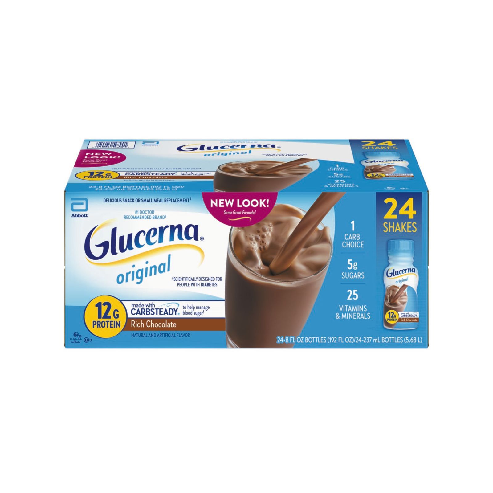 Glucerna Original nutrition shakes are scientifically designed to help people with diabetes manage blood sugar.* Our shakes have CARBSTEADY, unique blends of slow-release carbohydrates, as well as 12g of high-quality protein, vitamins A & D, zinc, and antioxidants (vitamins C & E). They make delicious grab-and-go meal or snack replacements.† Gluten-free and suitable for lactose intolerance, but not for people with galactosemia. Glucerna is the #1 nutrition brand recommended by doctors for people with diabetes. * Designed to help minimize blood sugar spikes compared to high-glycemic carbohydrates. † Replace one poor meal or snack choice.