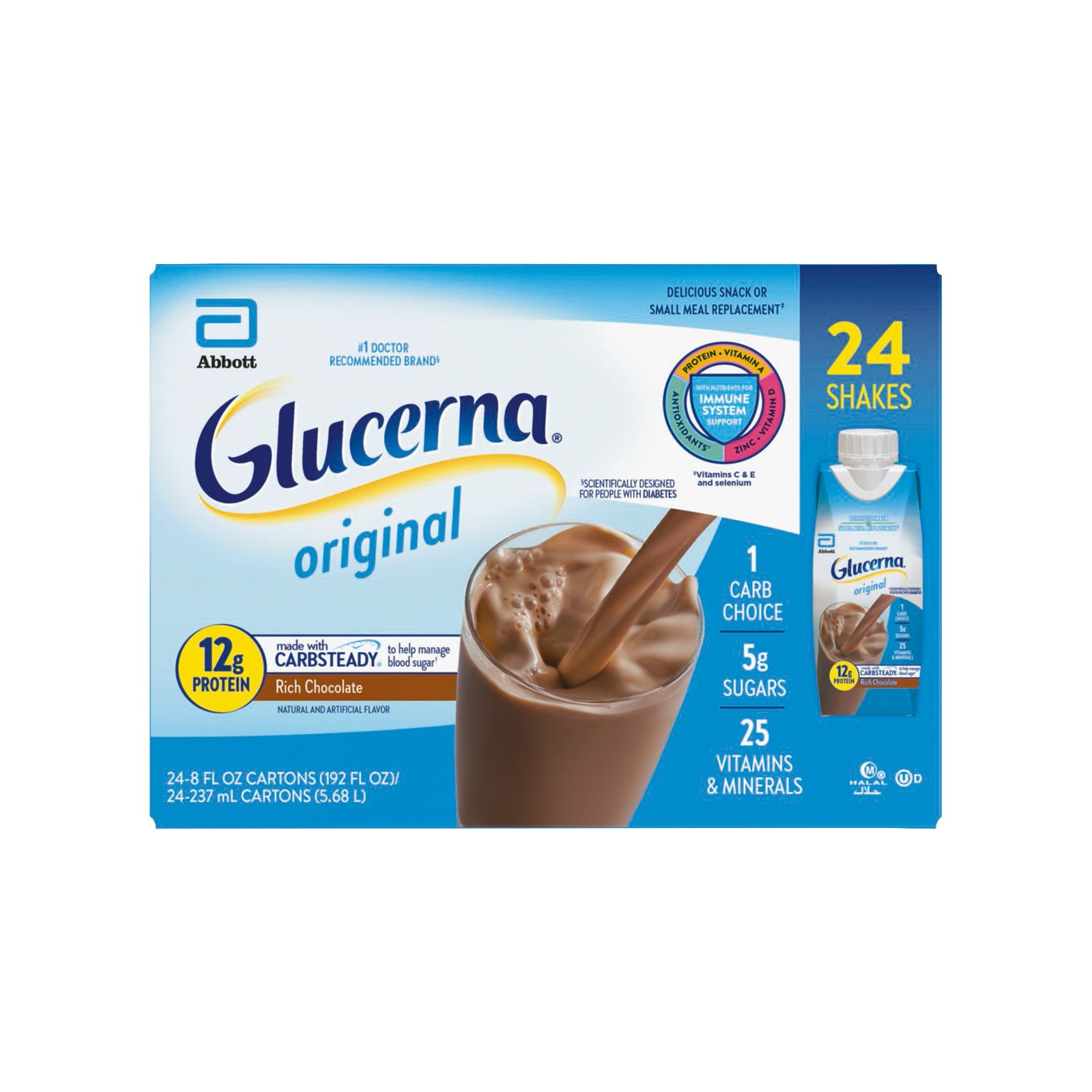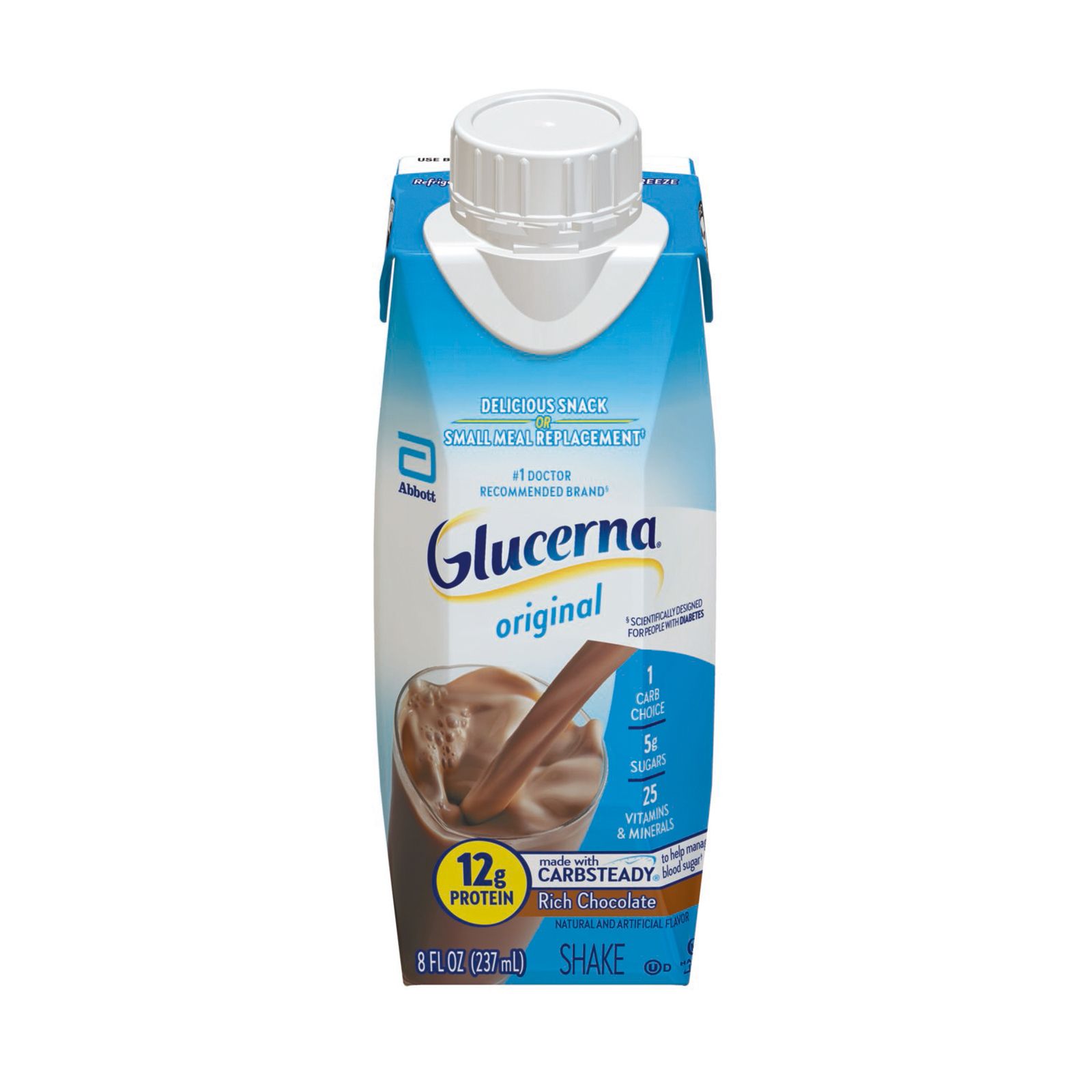 Glucerna Original nutrition shakes are scientifically designed to help people with diabetes manage blood sugar.* These shakes have Carbsteady, a unique blend of slow-release carbohydrates, as well as 12g of high-quality protein, vitamins A and D, zinc, and antioxidants (vitamins C and E). They make delicious grab-and-go meal or snack replacements.** These shakes are gluten-free and suitable for lactose intolerance, but not for people with galactosemia. Glucerna is the #1 nutrition brand recommended by doctors for people with diabetes.