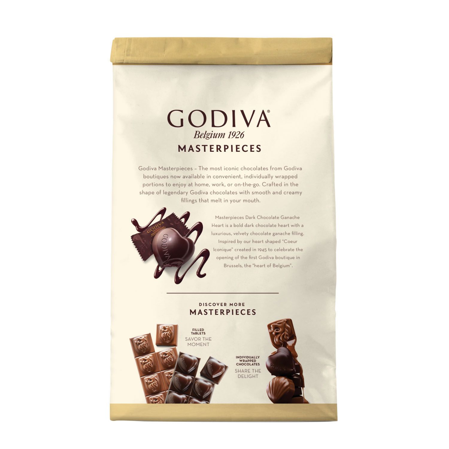 Godiva's Masterpieces Dark Chocolate Ganache Heart. Bold dark chocolate with velvety chocolate ganache filling. Individually wrapped pieces for sharing as well as enjoying on the go. Godiva has been a master in the art of Belgian style chocolate making since 1926.