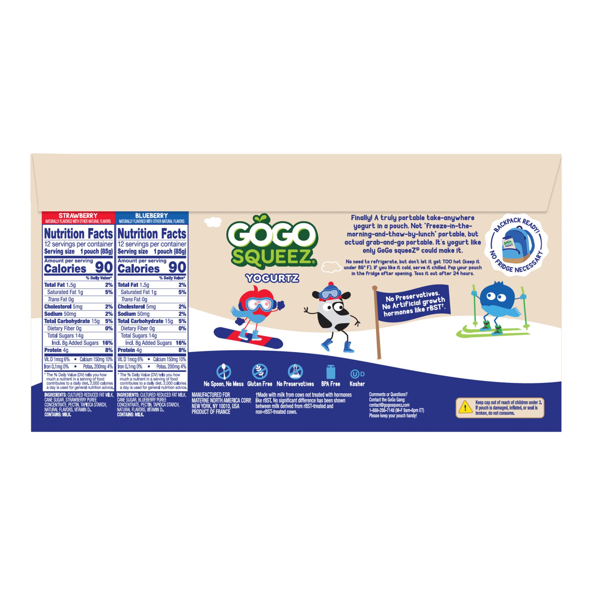 GoGo squeeZ yogurtZ yogurt pouches are made with real lowfat yogurt and fruit. Delivered in our iconic squeezable, portable snack pouches, GoGo squeeZ yogurtZ is safe to store at room temperature until opened. Our kitchen pantry friendly yogurt is a delicious snack for kids with no preservatives and no fridge needed! GoGo squeeZ yogurtZ yogurt pouches are kosher certified, nut free and gluten free snacks, are made with no artificial growth hormones like rBST* and are a good source of Calcium and Vitamin D. GoGo squeeZ pouches are BPA free and feature easy-open caps and a built-in straw. No spoon, and no mess!