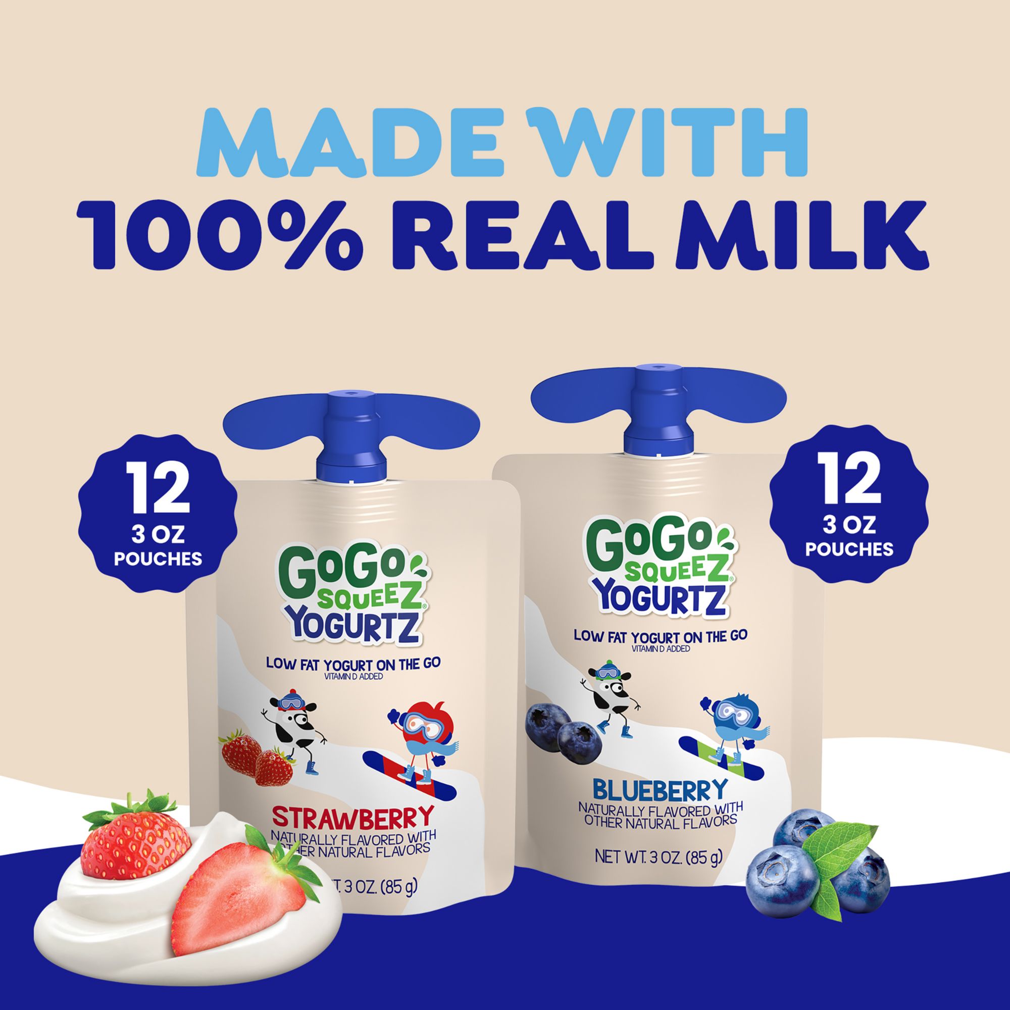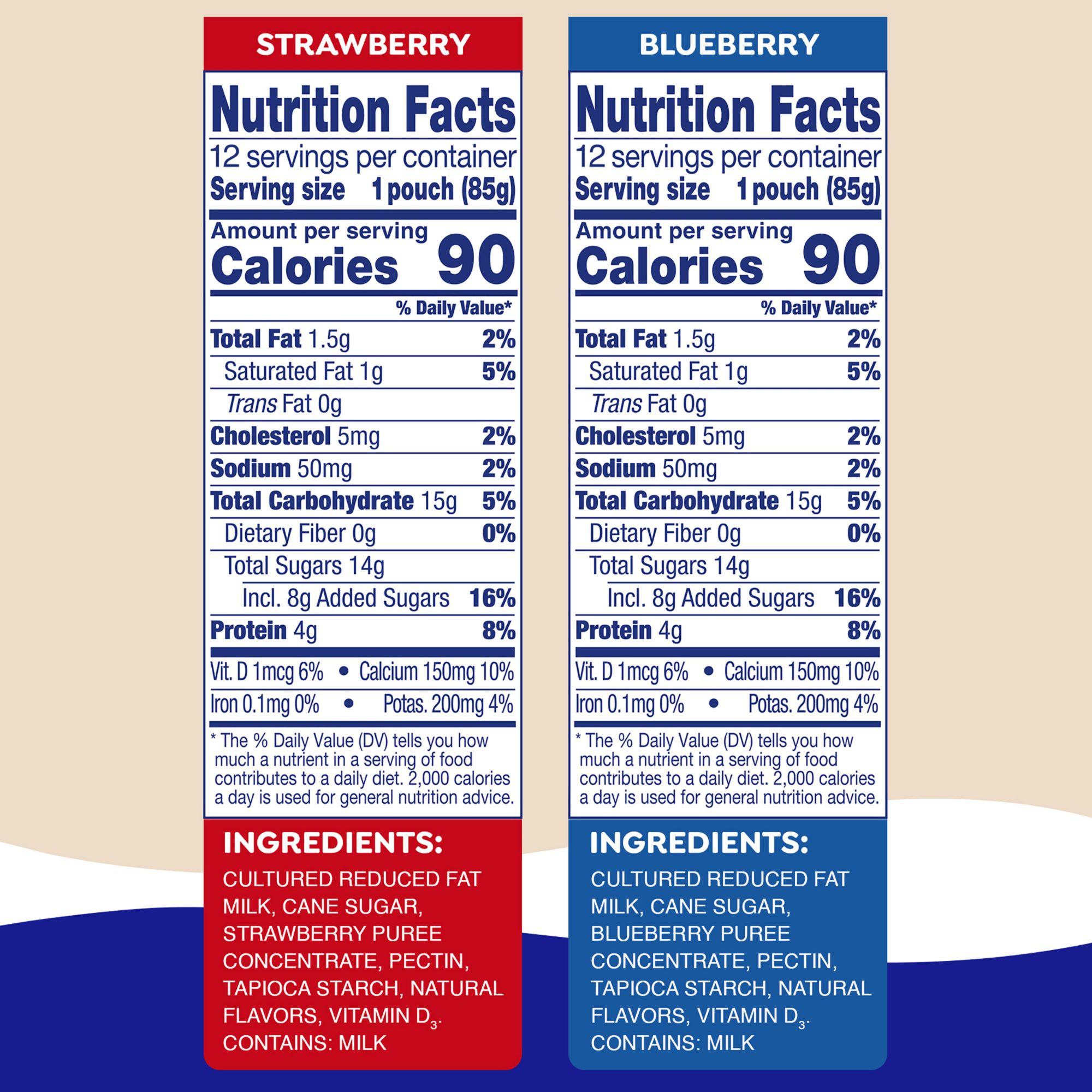 Includes 12-Strawberry Banana Yogurt pouches and 12-Blueberry Yogurt pouches
