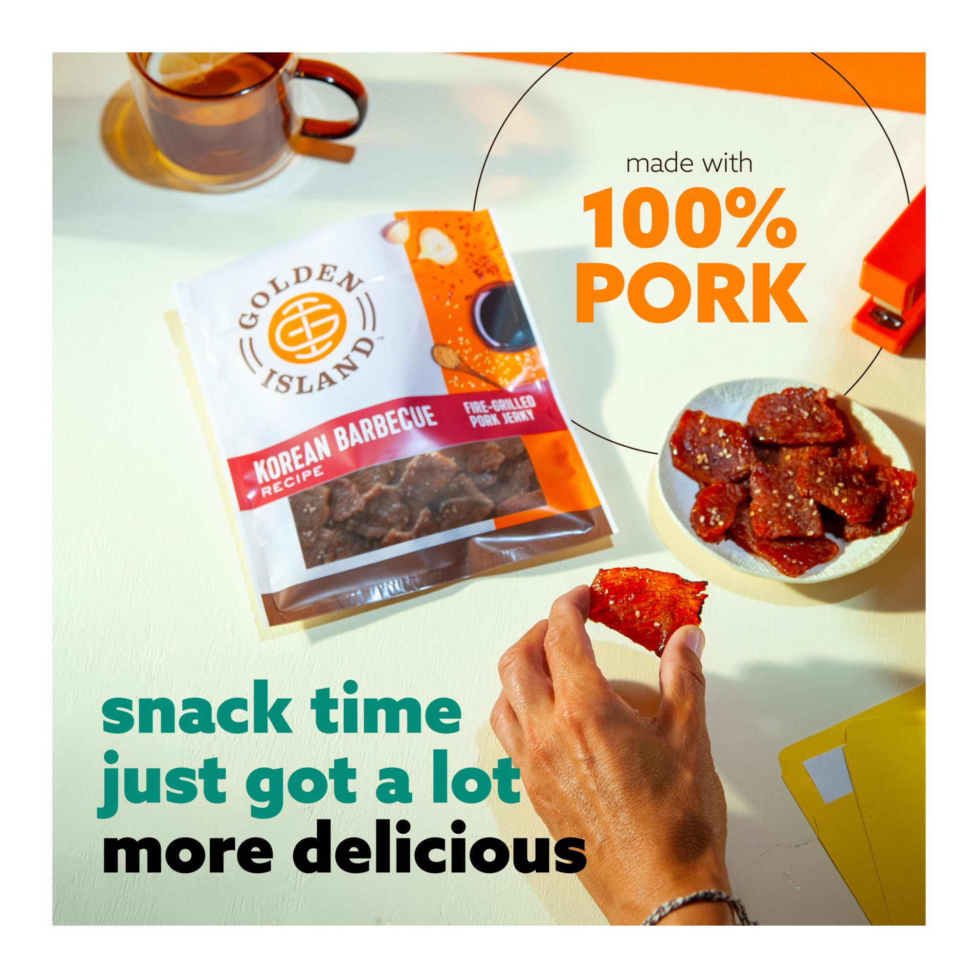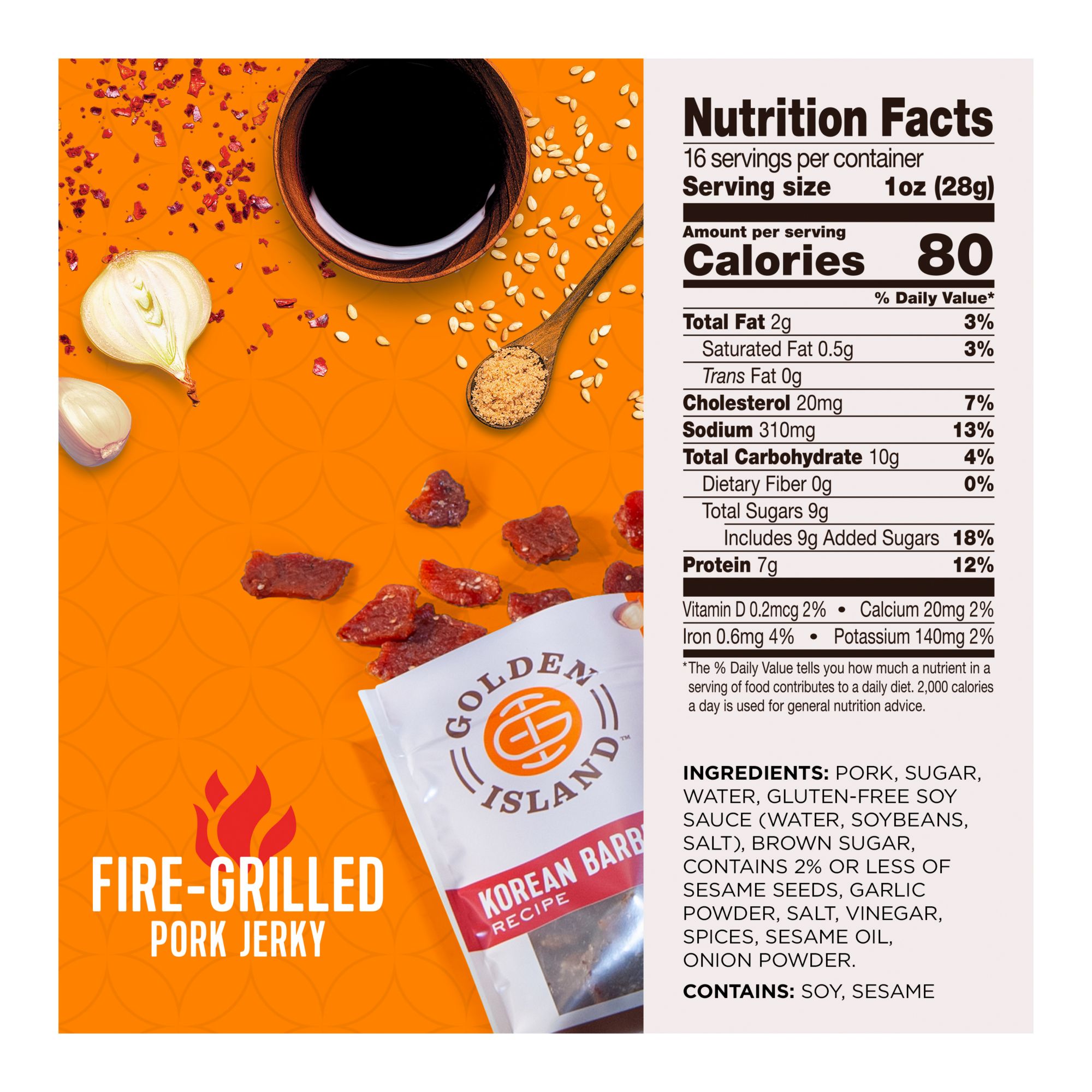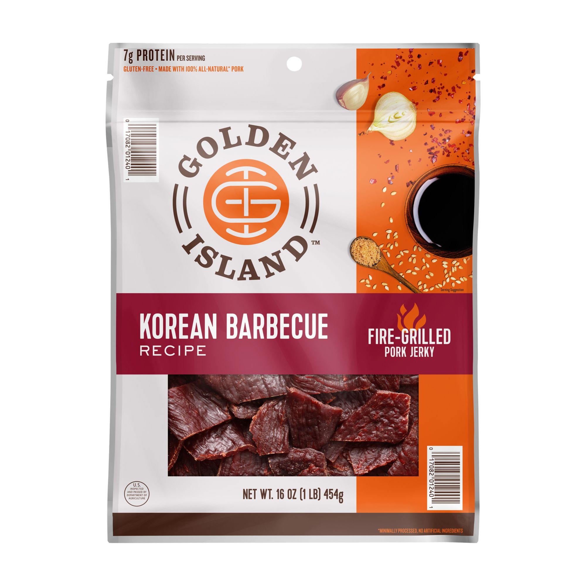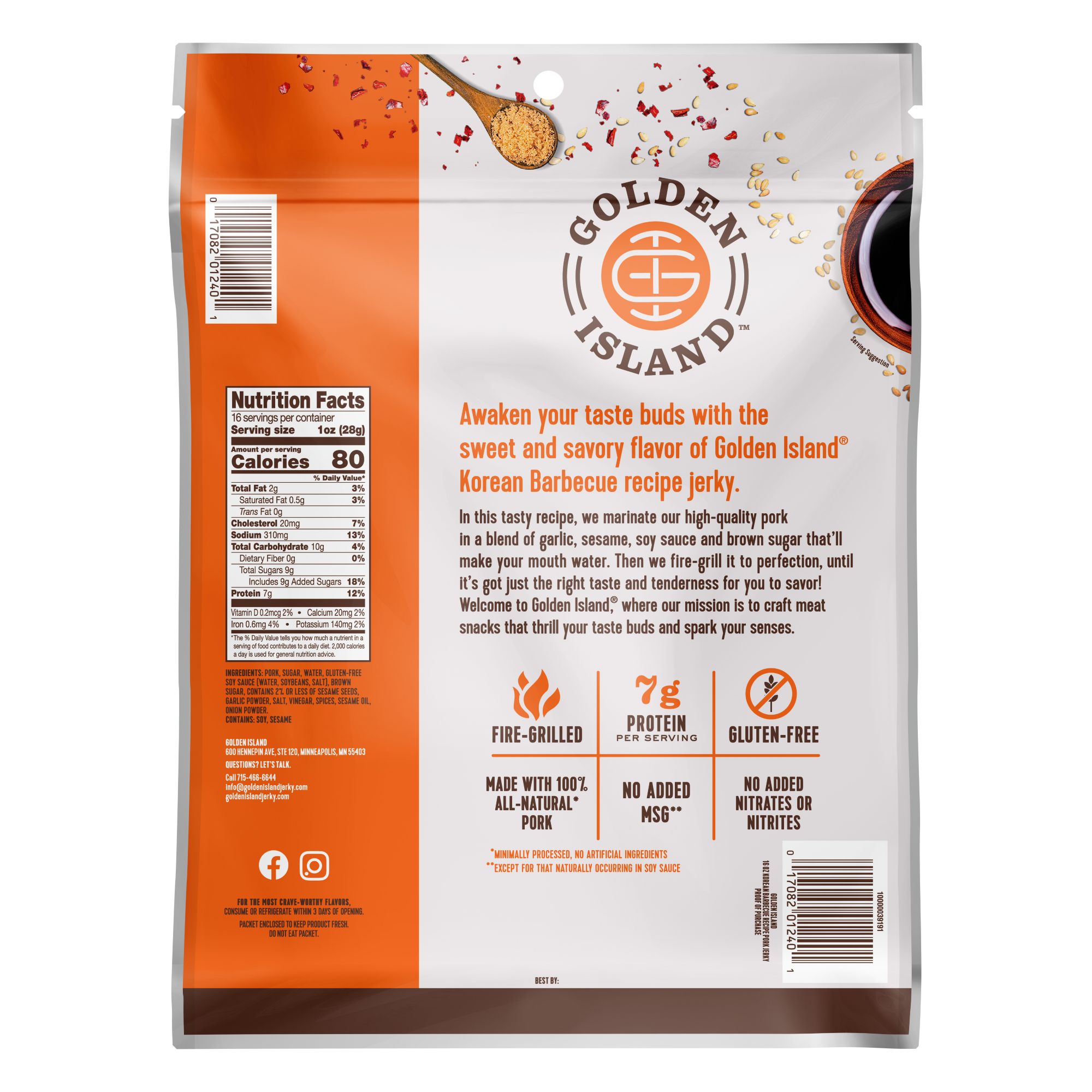 Golden Island Korean Barbecue Pork Jerky is coated with a signature sweet Korean barbecue glaze, which makes it a snack that never skips out on flavor. It's a flavor explosion that goes beyond the ordinary, allowing Golden Island to take your palate to new heights. At Golden Island, they make their Korean barbecue jerky with 100% pork that is marinated in a unique spice blend with ingredients like soy sauce and brown sugar. It's then fire-grilled to give it that caramelized appearance and then smoke-kissed to flavor perfection. Don't settle for an average snack, reach for something extraordinary that will take you on a flavorful journey with each bite!Each bag is fire-grilled, has 7g of protein per serving, is gluten-free, made with 100% all-natural* Pork, has no added MSG**, and no added nitrates or nitrites.
