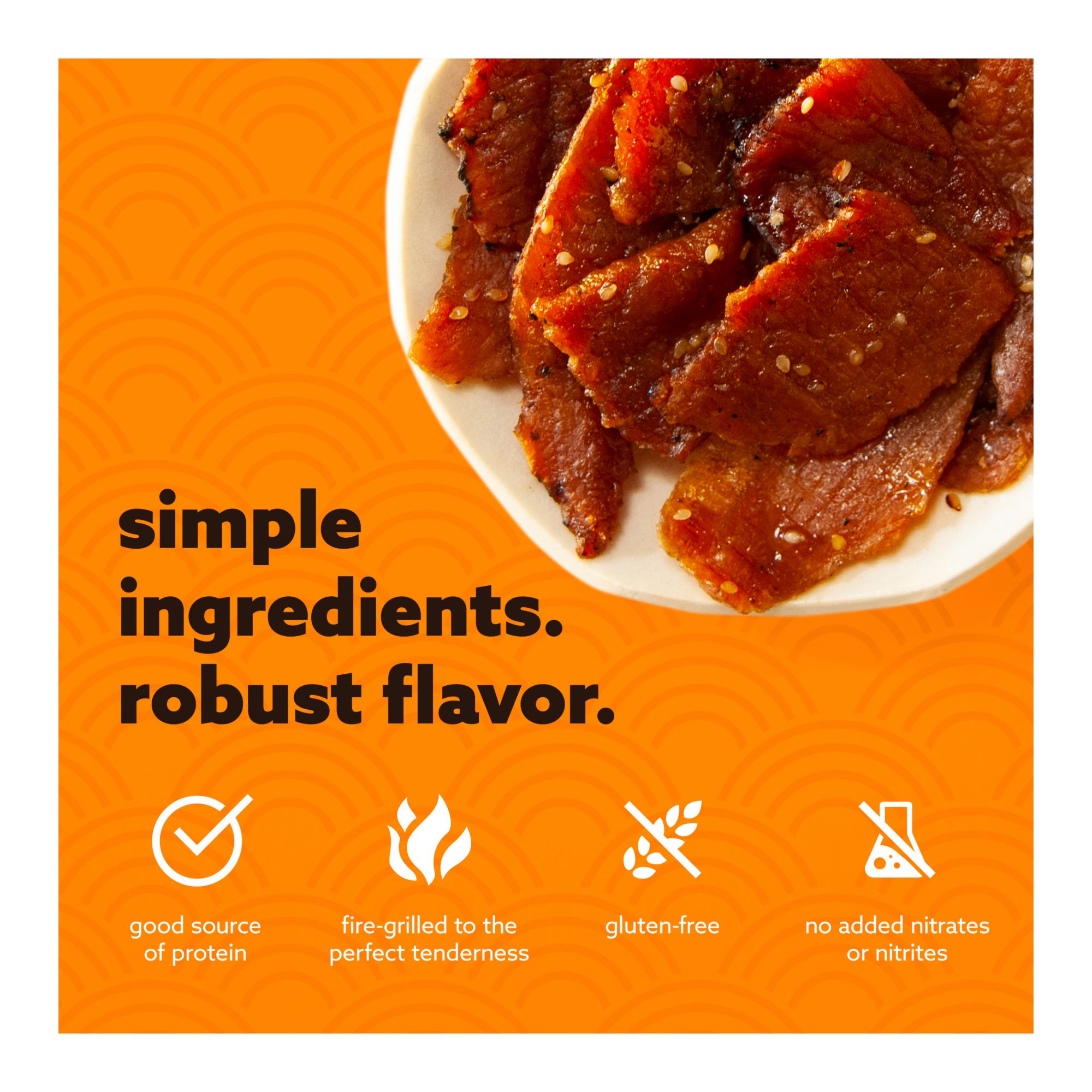 Ingredients: Pork, Sugar, Water, Gluten-free Soy Sauce (Water, Soybeans, Salt), Brown Sugar, Contains 2% Or Less Of Sesame Seeds, Garlic Powder, Salt, Vinegar, Spices, Sesame Oil, Onion Powder. Contains: Sesame, Soy.