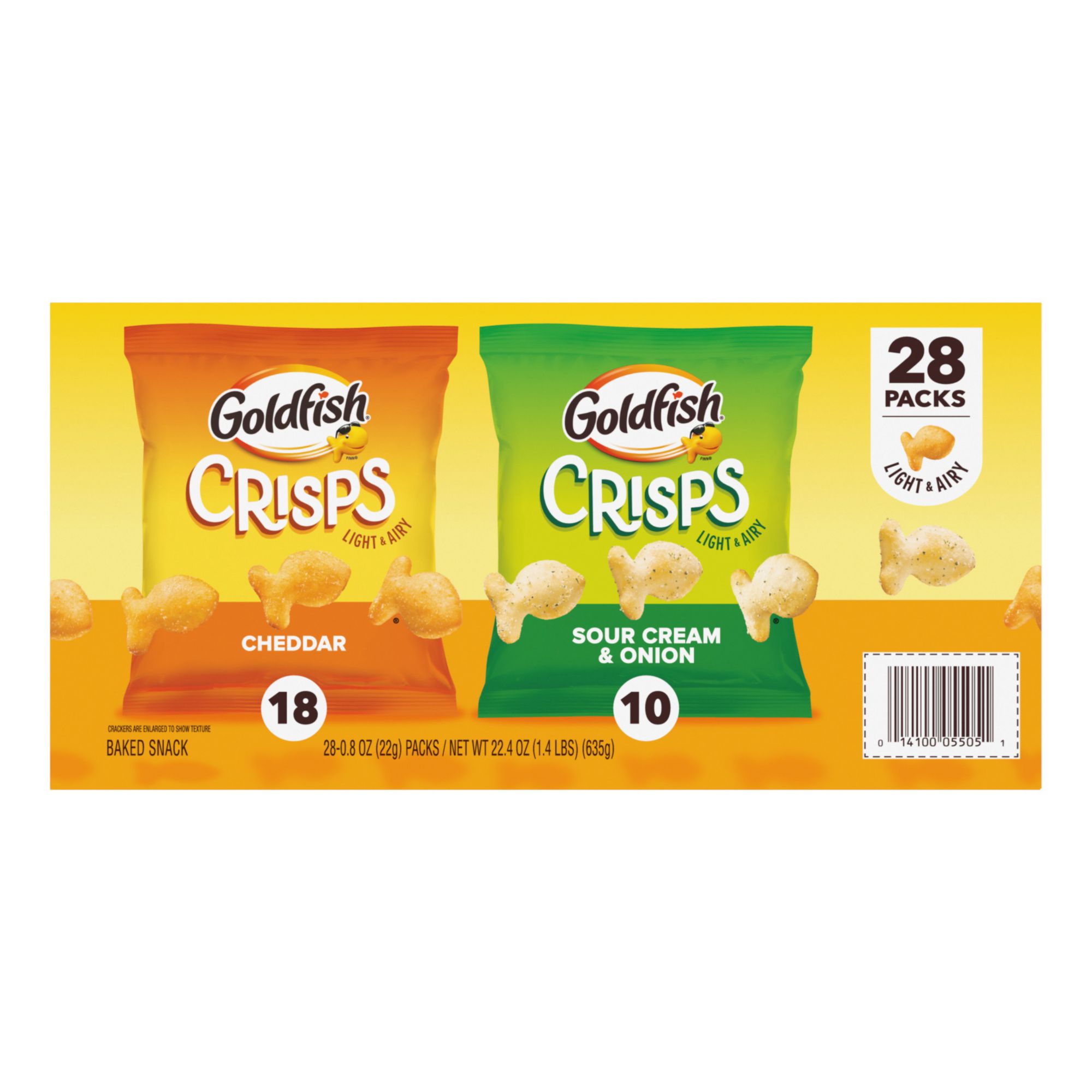Taste How Goldfish Does Chips! Experience new Goldfish Crisps, the irresistible Goldfish that are light and airy, always baked, and seasoned to perfection. New bite-sized Goldfish Crisps are the perfect chip-like snack, baked with potato and wheat! This variety pack includes two delicious flavors: 10 packs of Sour Cream & Onion and 18 packs of Cheddar. Sour Cream & Onion is a satisfying blend of rich sour cream and savory onion, while Cheddar delivers a bold cheddar flavor. Perfectly sized for on-the-go, take these Goldfish Crisps snack bags with you for solo snacking at any time. Stock up your pantry with two delicious flavors of these fish-shaped chip crackers.