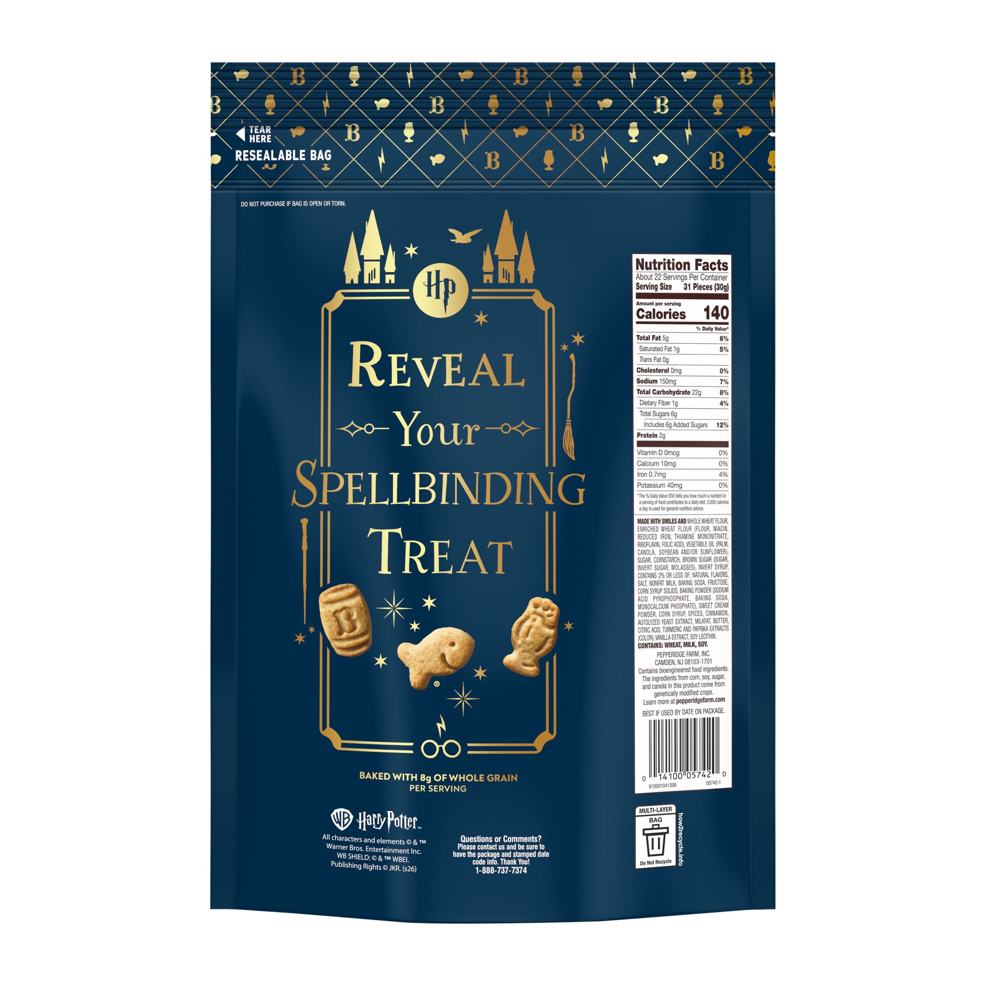 Includes one (1) 24 ounce bag of Goldfish Harry Potter Butterbeer Butterscotch Flavored Baked Grahams