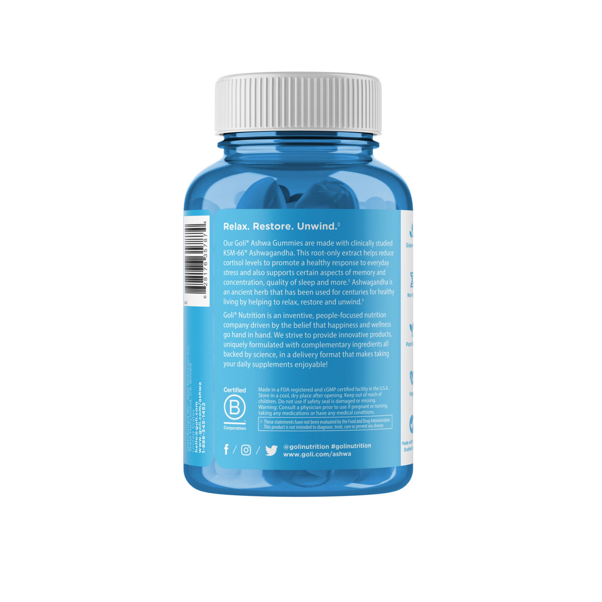 Introducing The World’s Most Powerful Ashwagandha Gummies by Goli Nutrition. Goli Nutrition combined science-backed and clinically proven super herb KSM-66 Ashwagandha with Vitamin D. Relax, Restore, and Unwind with these Ashwa Gummies. KSM-66 Ashwagandha has many clinically proven benefits :improved sleep, reduced stress, balance immune system, healthy weight management, sexual health, sports performance, supports a healthy mood and cognitive health. These Ashwa gummies are vegan, non-GMO, gluten-free, and gelatin-free. Ashwagandha gummies are vegan, gluten-free, non-GMO, Kosher, and contain no preservatives, chemicals, or artificial ingredients.