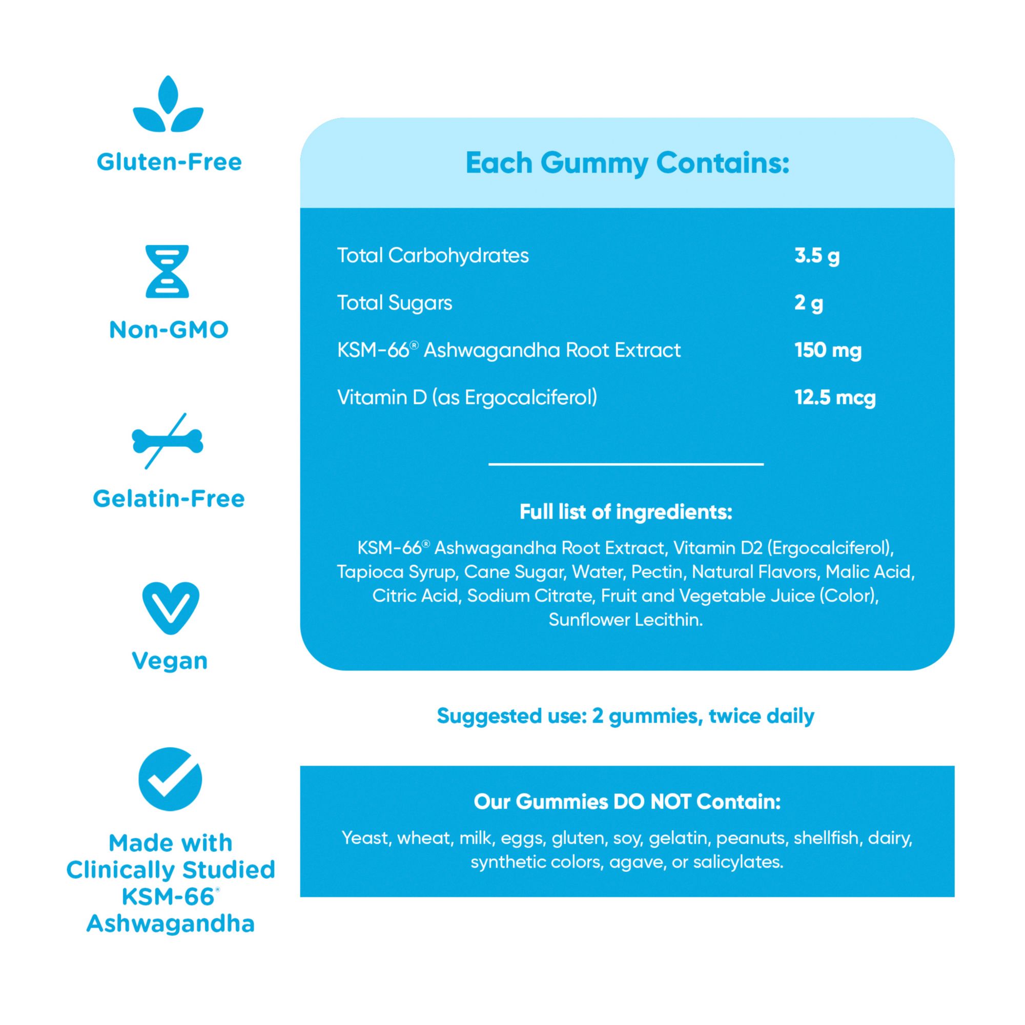 Ashwagandha gummies are vegan, gluten-free, Non-GMO, Kosher, and contain no preservatives, chemicals, or artificial ingredients