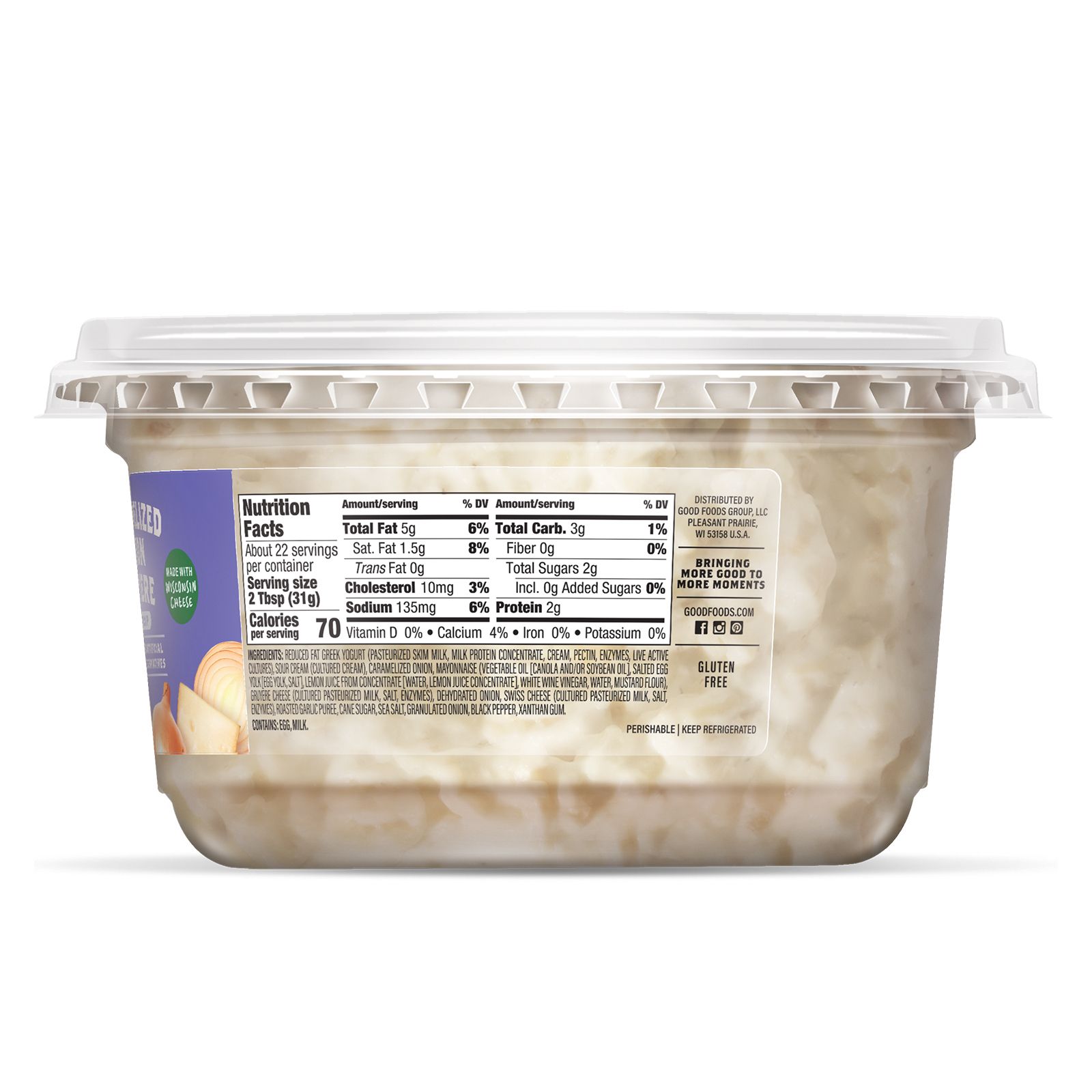 Ingredients: Reduced Fat Greek Yogurt (Pasteurized Skim Milk, Milk Protein Concentrate, Cream, Pectin, Enzymes, Live Active Cultures), Sour Cream (Cultured Cream), Caramelized Onion, Mayonnaise (Vegetable Oil [Canola Oil and/or Soybean Oil], Salted Egg Yoke [Egg Yolk, Salt], Lemon Juice from Concentrate [Water, Lemon Juice Concentrate], White Wine Vinegar, Water, Mustard Flour), Gruyere Cheese (Cultured Pasteurized Milk, Salt, Enzymes), Dehydrated Onion, Swiss Cheese (Cultured Pasteurized Milk, Salt, Enzymes), Roasted Garlic Puree, Cane Sugar, Sea Salt, Granulated Onion, Black Pepper, Xanthan Gum. Contains: Egg, Milk.