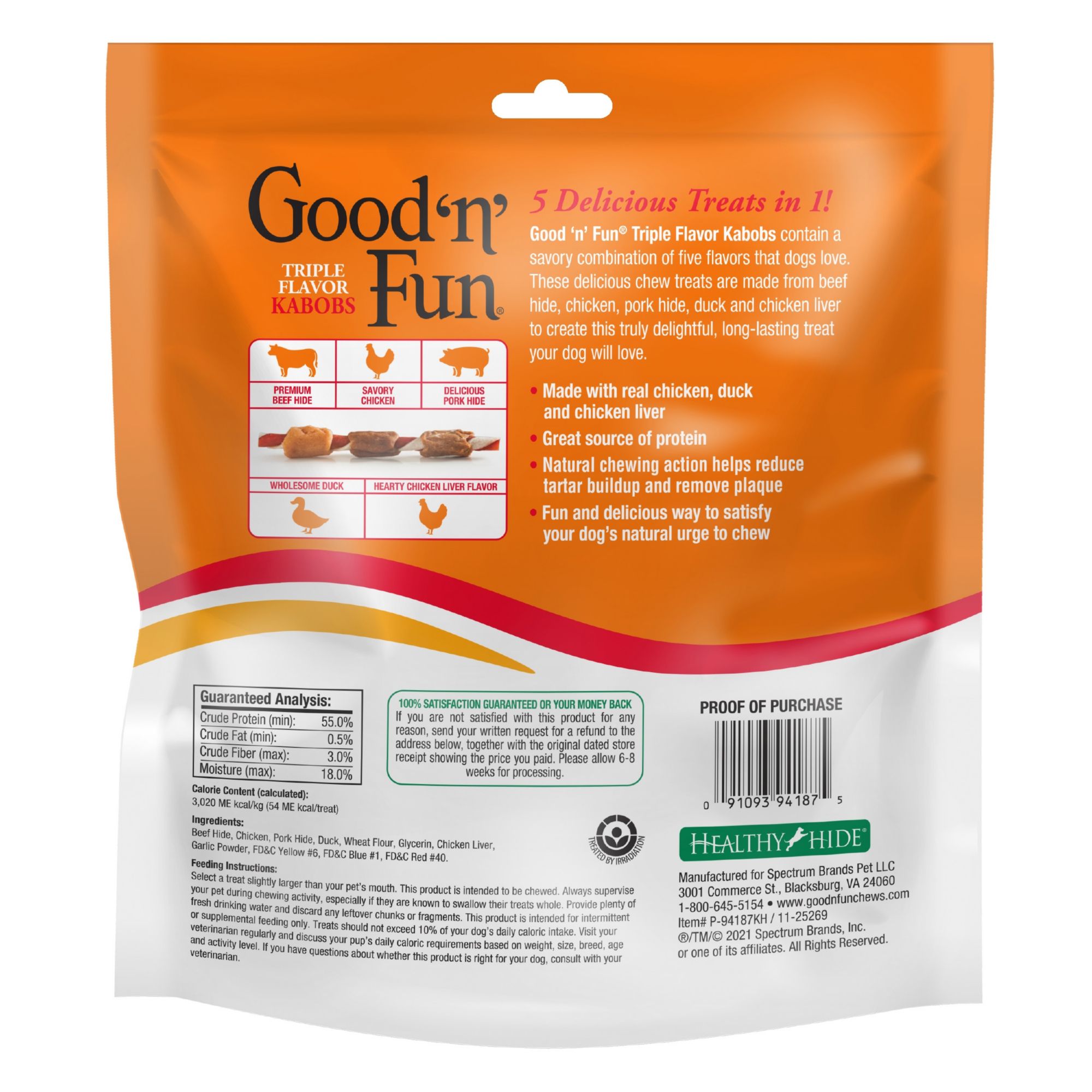 Good 'n' Fun brand offers a tasty smorgasbord of flavors that dogs love. These delicious chews are made from the finest ingredients, including real beef hide and real chicken, to create truly delightful, long-lasting treats your dog will love. Tails will be wagging for flavor-packed Good 'n' Fun Triple Flavor Kabobs, made with a savory combination of five flavors that dogs love most. These delicious chew treats are made from beef hide and pork hide, then wrapped with real, savory chicken, wholesome duck and hearty chicken liver flavor to create a truly delightful, long-lasting rawhide treat your dog will love. A great source of protein, Good 'n' Fun Triple Flavor Kabobs are a healthy and delicious way to satisfy your dog's natural urge to chew. The natural action of chewing also helps reduce tartar buildup and remove plaque.