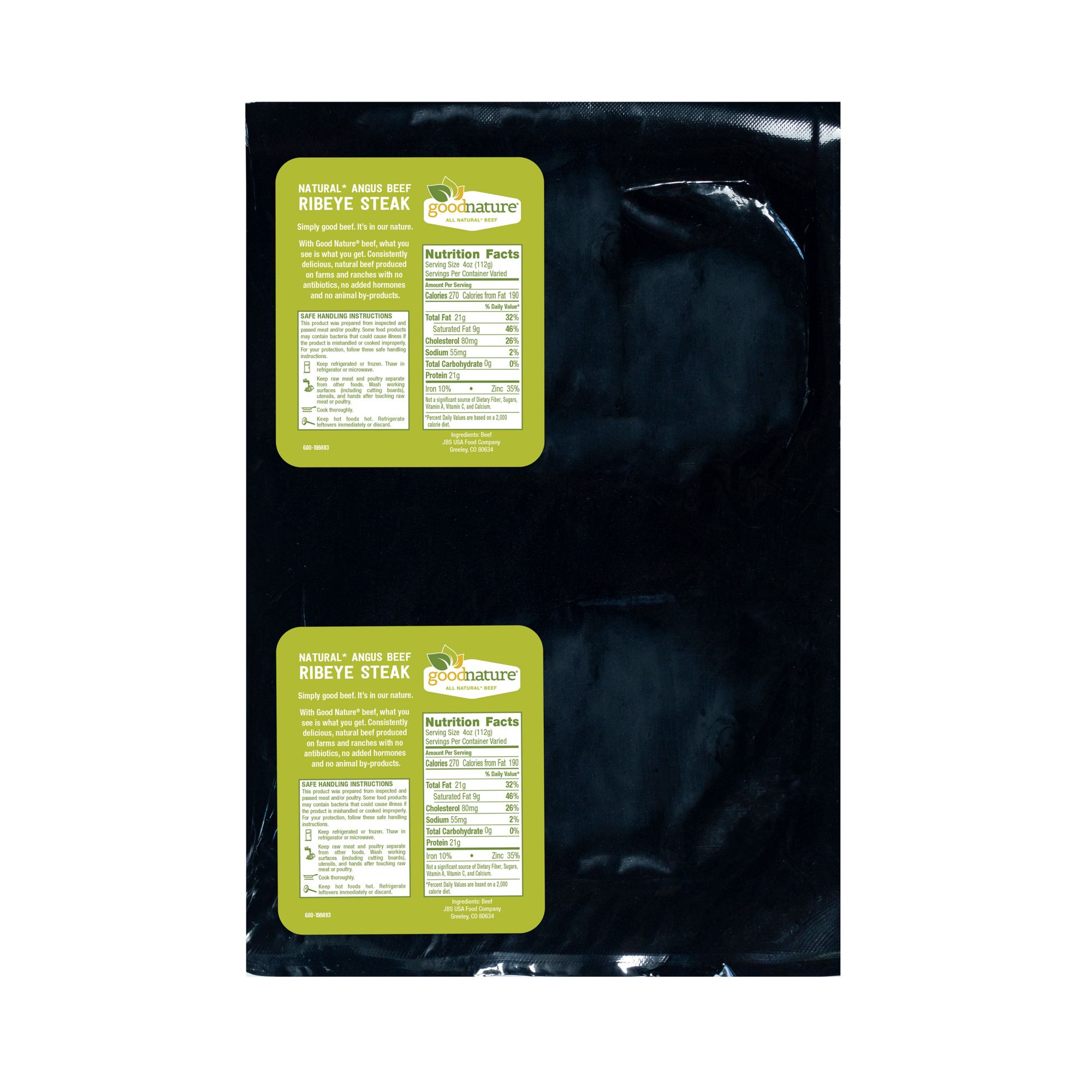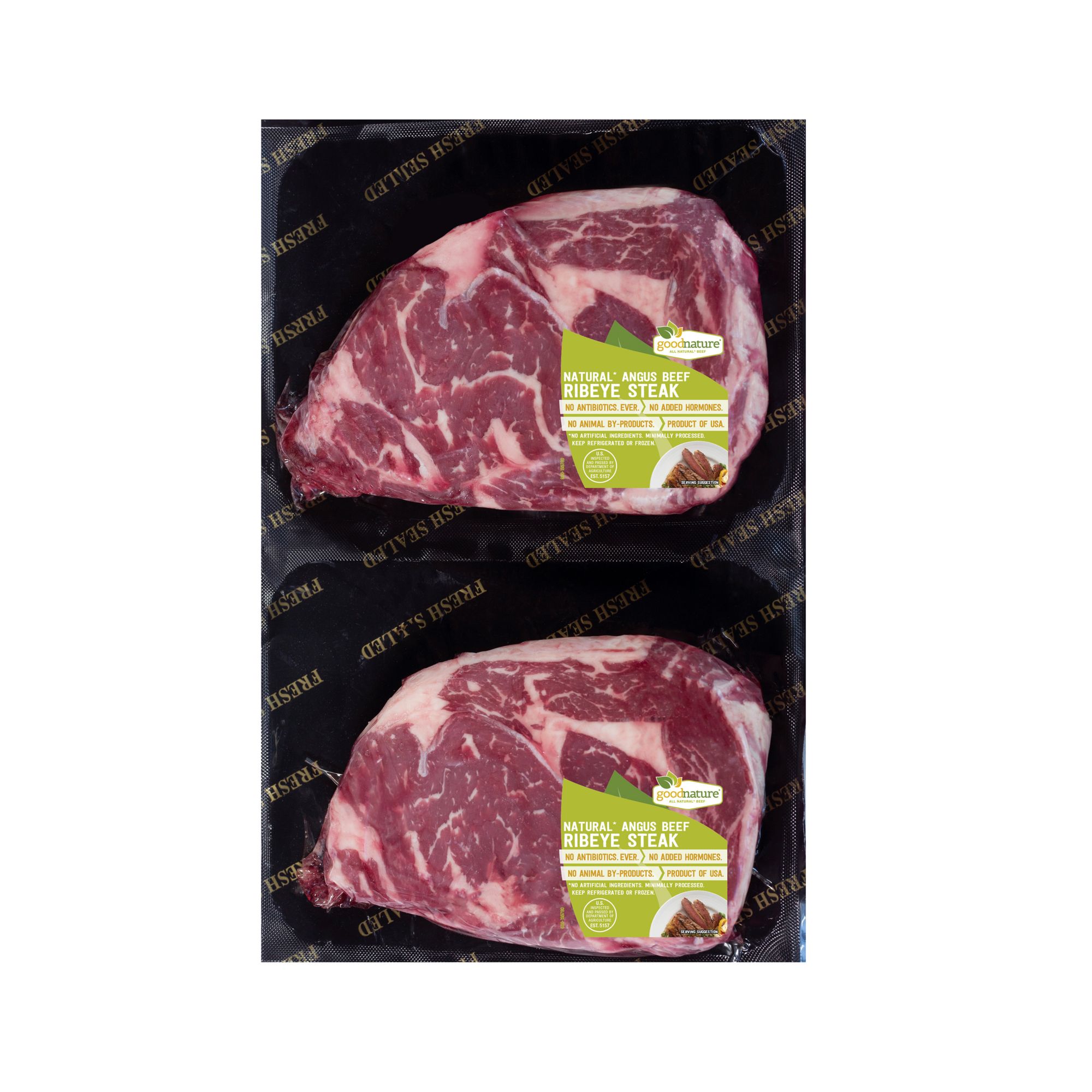 Good Nature ribeye boneless steak is natural with no added growth-promoting hormone ever. It has never given any antibiotic and always fed 100% vegetarian diet with no by-product. USDA choice or higher.