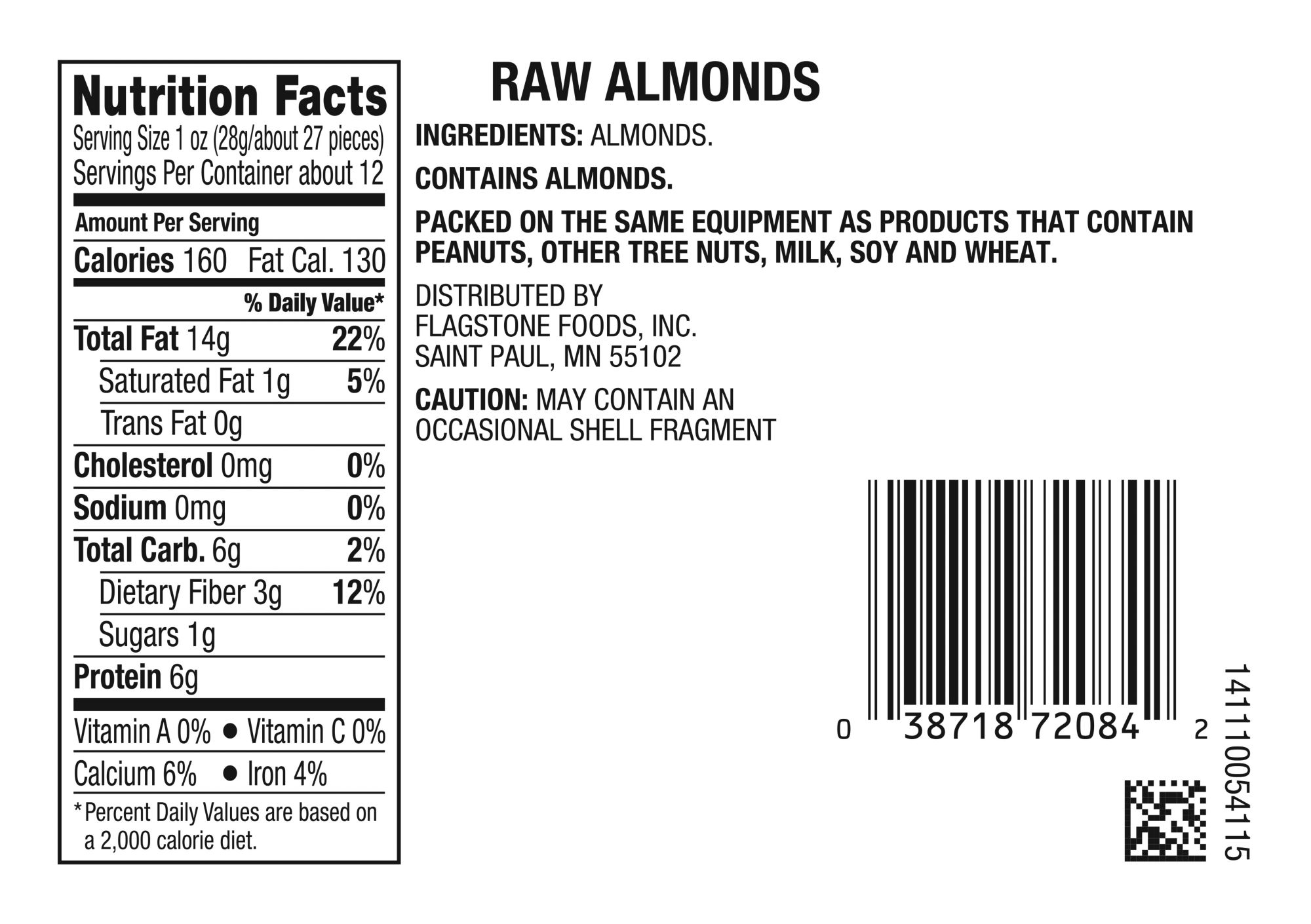 Unroasted and unsalted raw almonds in a clamshell tub Contains 6g of protein in every serving Kosher Includes 11.5 oz. of almonds