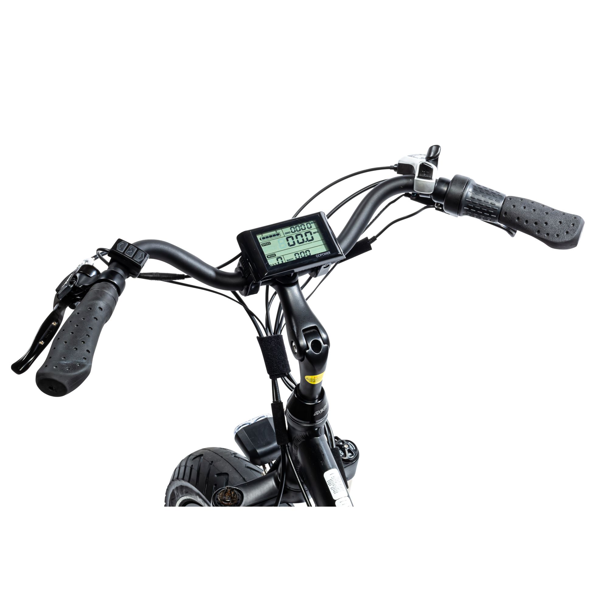 Motor: 750W motor Battery: 48V10-Ah Lithium battery (4 hours charge time) Four Modes: pedal assist, electric, manual, or walk mode Durable, 6061 aluminum alloy frame and folding pedals Display: LCD with speedometer, odometer, pedal assist level, battery gauge and USB charging Weight Capacity: 300 lbs. Safety Features: front and rear LED headlight front and rear disc brakes Motor safety cut-off Front shock suspension Fat tires: 20"L x 4"W Includes electric bike