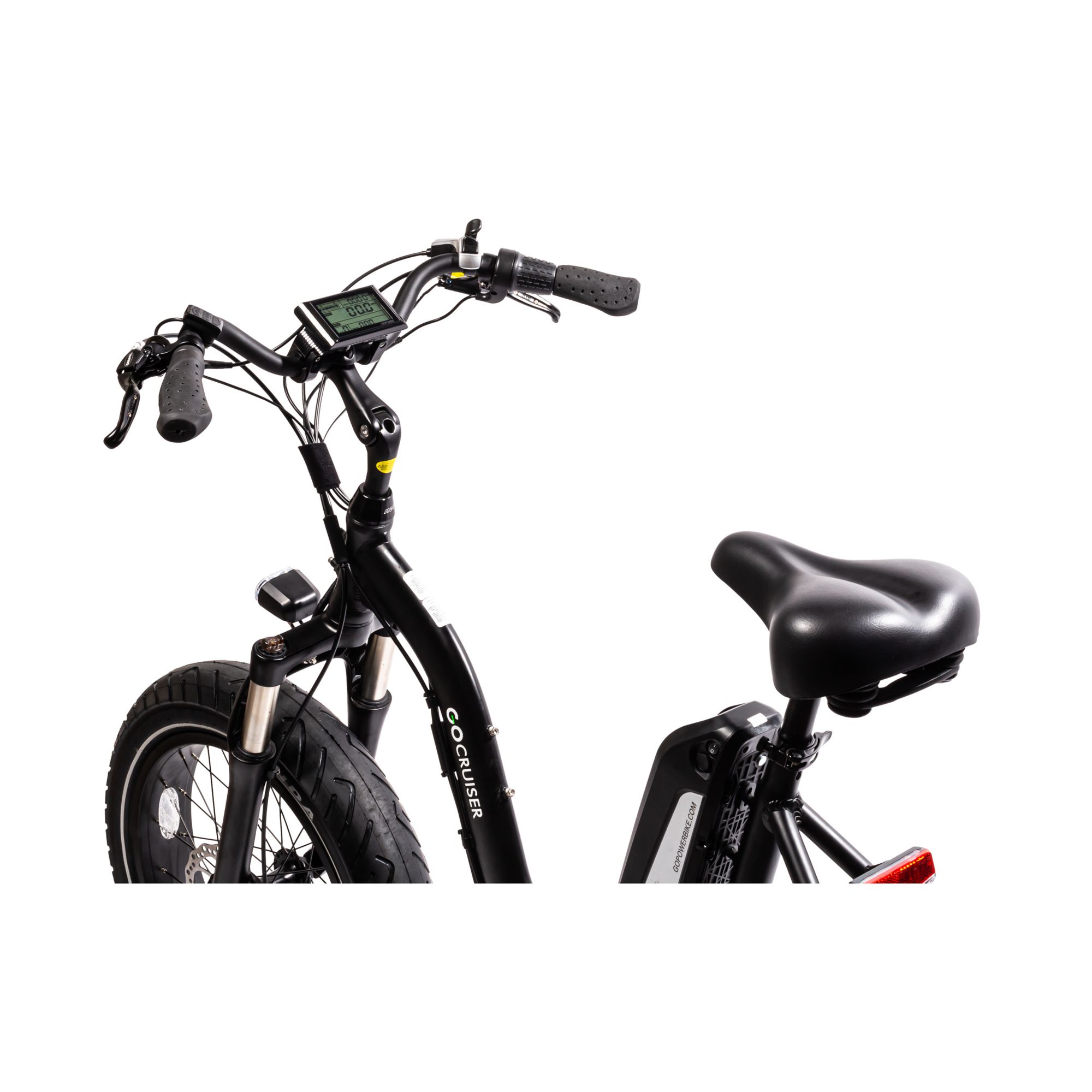 The GoCruiser is an ideal source for all your travels and getaway cruise. Designed to be comfortable and to get on easily, the step-thru frame made of a 6061 aluminum alloy is the lowest height model, this e-bike is extremely versatile with different modes to select from such as pedal assist, and electric throttle, manual pedal or walk mode. It includes fat tires with a top speed of 20mph and can go a distance range of 18 miles (electric) or 36 miles (pedal assist) on a single charge.
