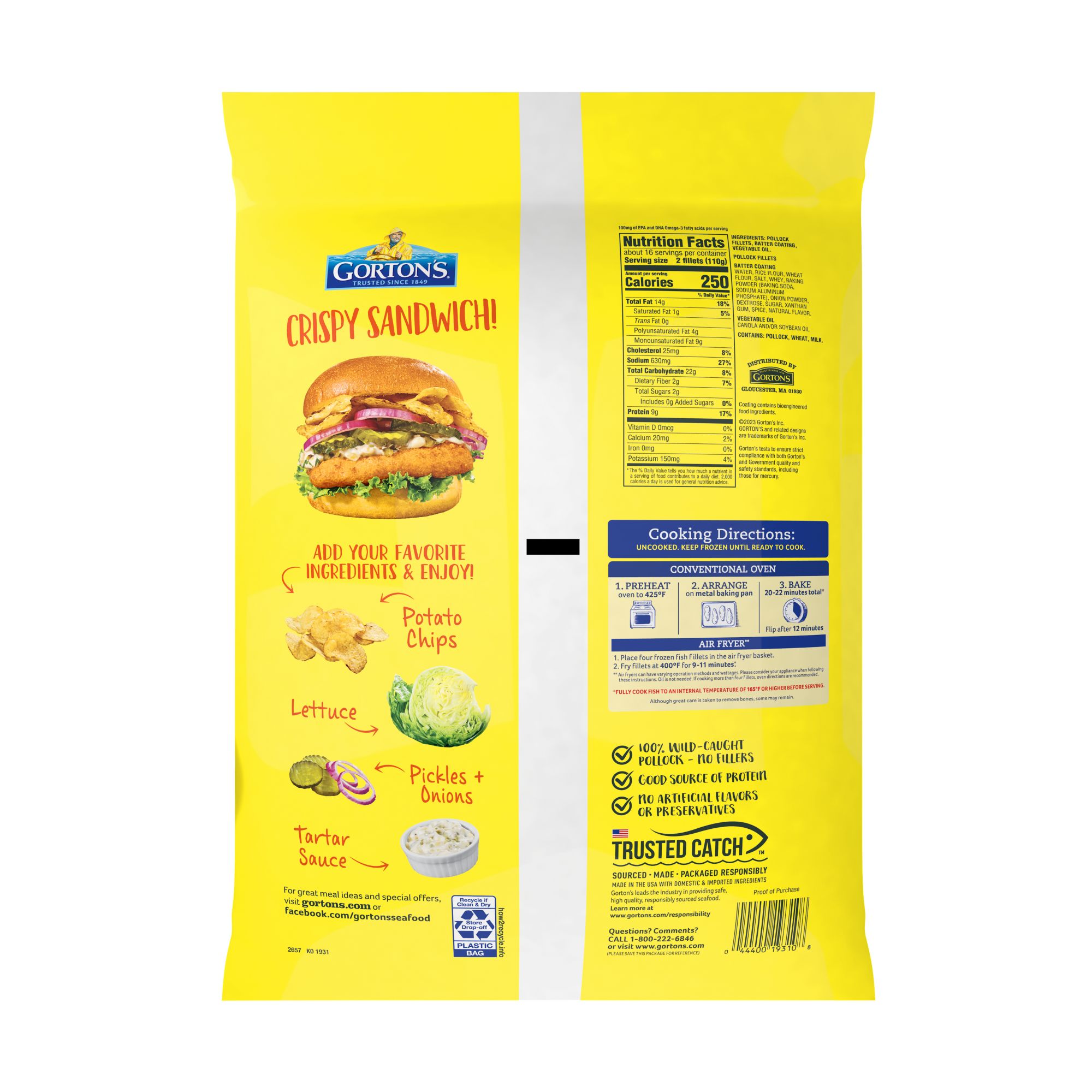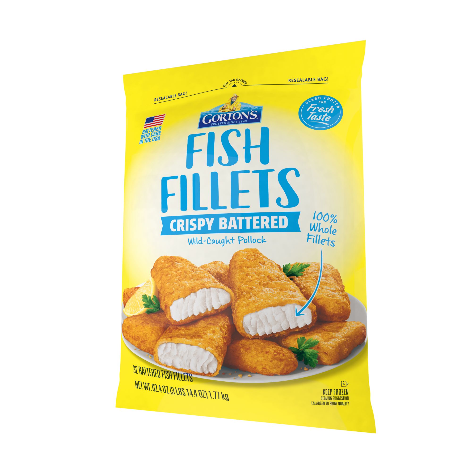 Bring home the classic taste of seafood with Gorton's family favorite, Crispy Battered Fish Fillets. Made from high-quality, wild-caught Pollock, these fillets are ideal for serving up a fresh-tasting, convenient meal. As masters of their craft, Gorton's skillfully prepares their seafood so it’s always full of delicious flavor and nutrition. These fillets are coated in a golden batter, making each bite flaky and crispy. These fillets are always prepared with no fillers, artificial colors or flavors, hydrogenated oils, or antibiotics. Plus, this fish is a natural source of natural Omega-3s and protein. Enjoy a deliciously fresh meal that is prep-free, mess-free, and stress-free! Simply heat fish in a conventional oven until fully cooked, or cook in an air fryer for a crunchier bite. Gorton's has served families great seafood for over 170 years because of their longstanding commitment to quality and to ocean preservation. Their Trusted Catch program ensures our seafood is responsibly sourced, made, and packaged*.