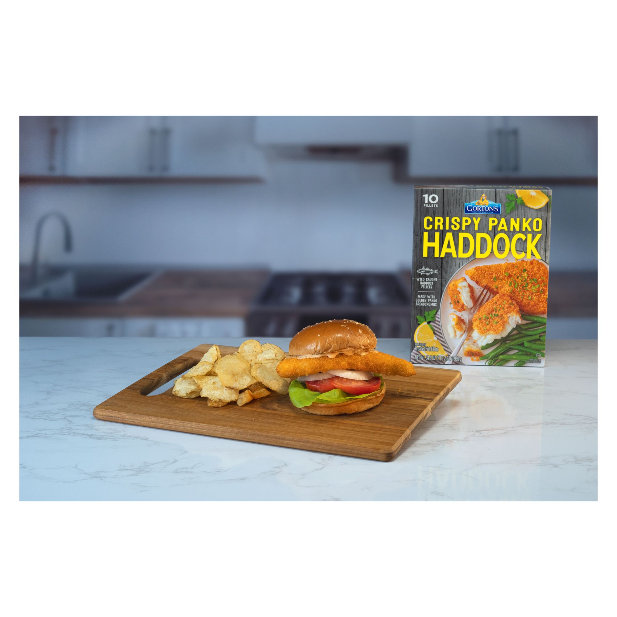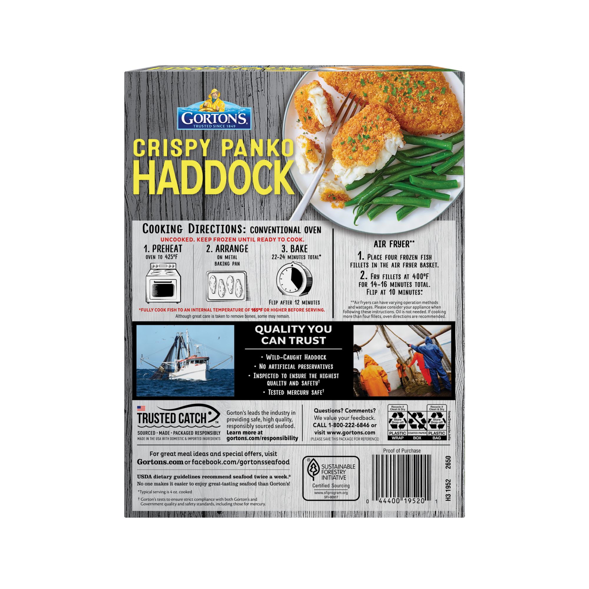 Bring home the classic taste of seafood with Gorton's family favorite, Crispy Panko Haddock Fillets. Made from high-quality, wild-caught Haddock, these fillets are ideal for serving up a fresh-tasting, convenient meal. As masters of their craft, Gorton's skillfully prepares their seafood so it’s always full of delicious flavor and nutrition. These fillets are also coated in golden panko breadcrumbs, making each bite flaky and crispy. These fillets are always prepared with no fillers, artificial colors or flavors, hydrogenated oils, or antibiotics. This fish is a natural source of natural Omega-3s and protein. Enjoy a deliciously fresh meal that is prep-free, mess-free, and stress-free! Simply heat fish in a conventional oven until fully cooked, or cook in an air fryer for a crunchier bite. Gorton's has served families great seafood for over 170 years because of their longstanding commitment to quality and to ocean preservation. Gorton's Trusted Catch program ensures their seafood is responsibly sourced, made, and packaged.