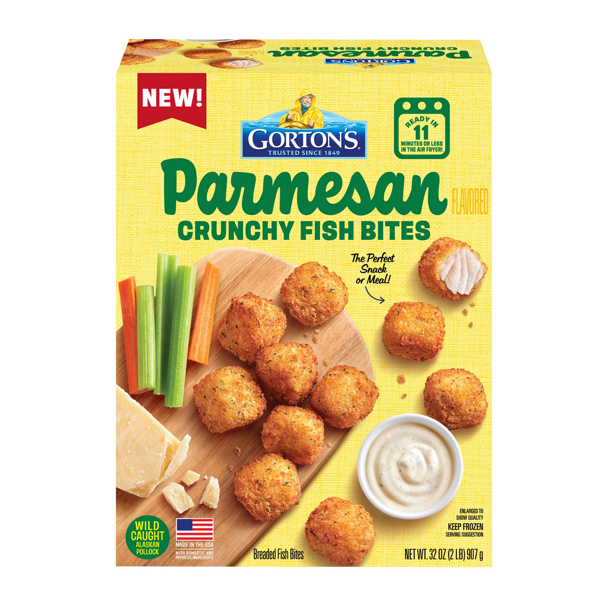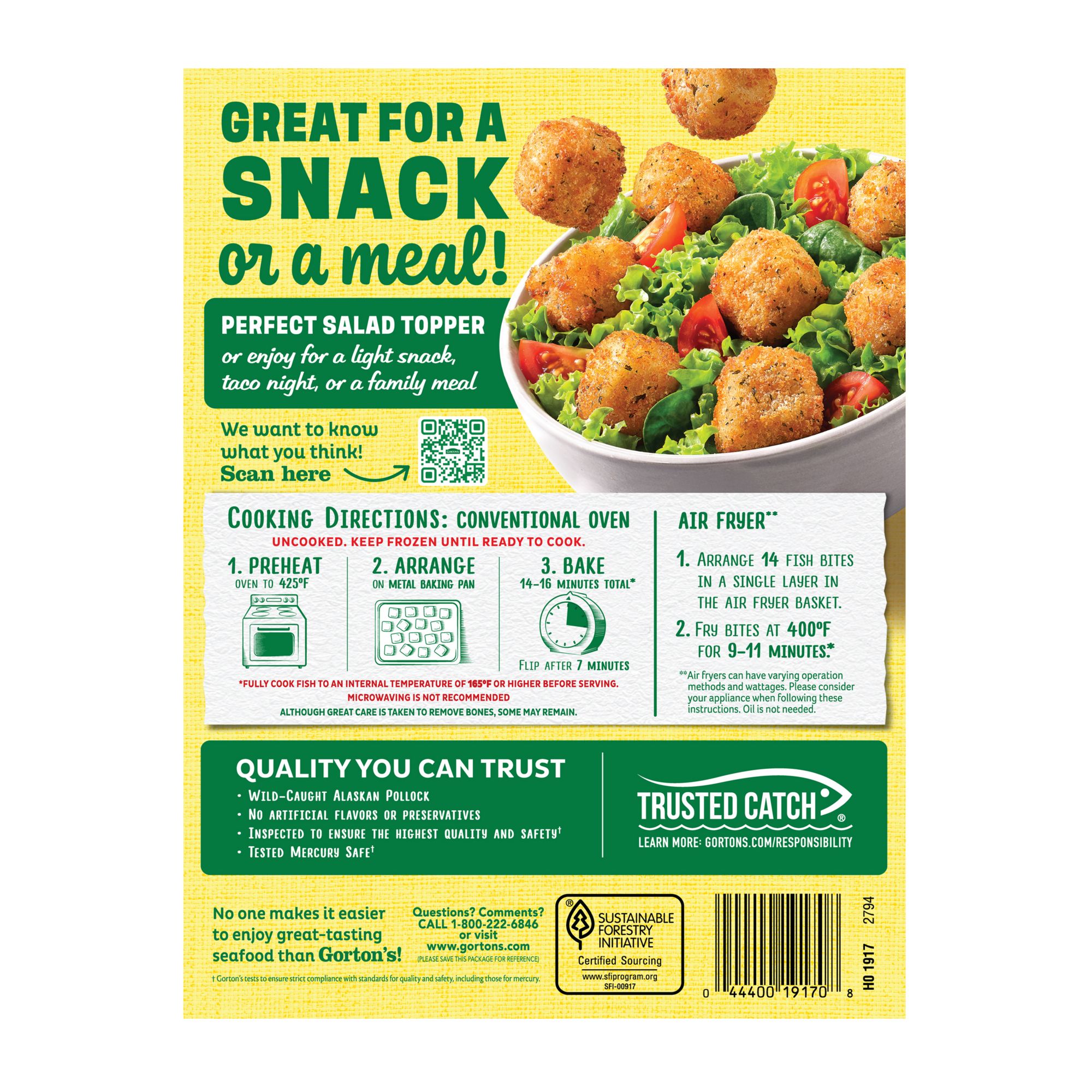 Bring home a delicious taste of seafood with Gorton's Parmesan Crunchy Fish Bites. Made from wild-caught Alaskan Pollock, these crunchy fish bites are ideal for a convenient meal, snack, or appetizer. As masters of their craft, Gorton's skillfully prepares their seafood so it’s always full of delicious flavor and nutrition. These fish bites are also coated in crunchy breadcrumbs, making each bite flaky and crispy. These fish bites are always prepared with no fillers, artificial colors, artificial flavors, or hydrogenated oils. This fish naturally contains Omega-3s and is a good source of protein. Enjoy a deliciously flavorful meal that is prep-free, mess-free, and stress-free! Simply heat fish in a conventional oven or cook in an air fryer for a crunchier bite. Gorton's has served families great seafood for over 175 years because of their longstanding commitment to quality and to ocean preservation.