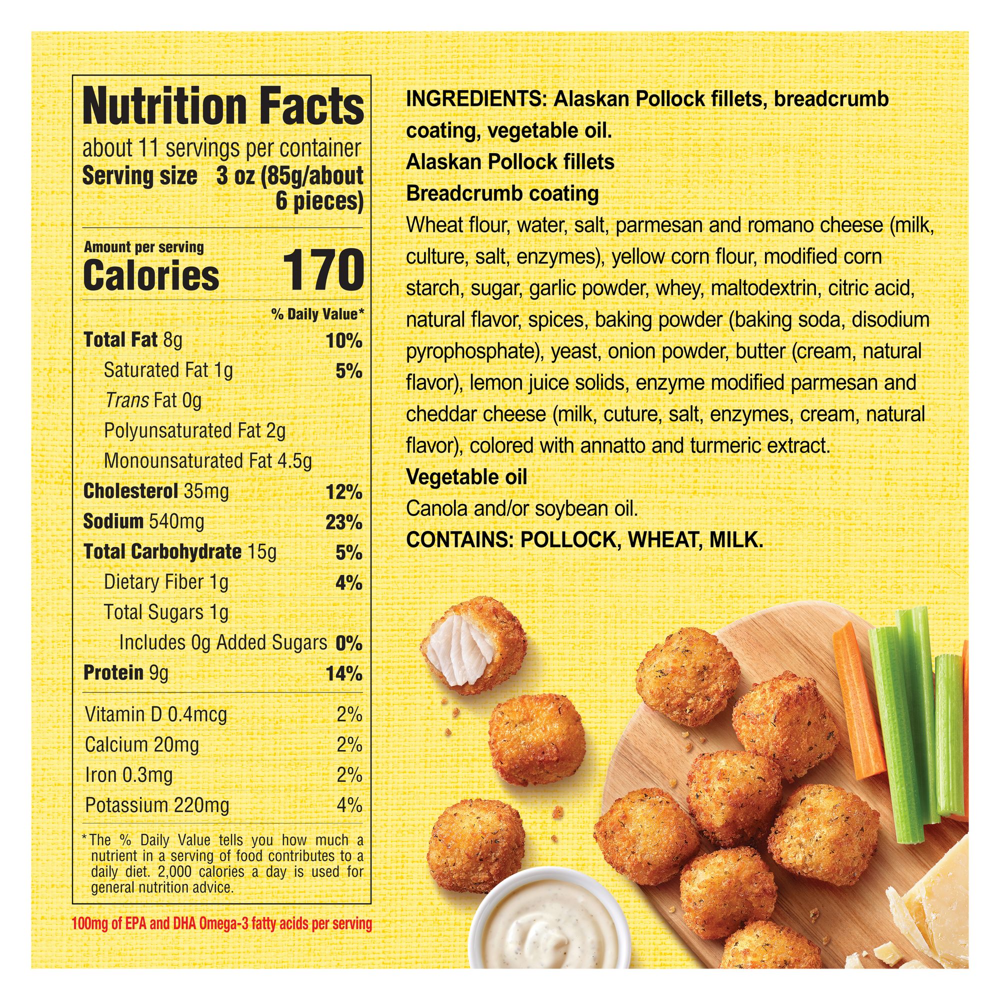 Ingredients: Alaskan Pollock Fillets, Breadcrumb Coating (Wheat Flour, Water, Salt, Parmesan And Romano Cheese (Milk, Culture, Salt, Enzymes), Yellow Corn Flour, Modified Corn Starch, Sugar, Garlic Powder, Whey, Maltodextrin, Citric Acid, Natural Flavor, Spices, Baking Powder (Baking Soda, Disodium Pyrophosphate), Yeast, Onion Powder, Butter (Cream, Natural Flavor), Lemon Juice Solids, Enzyme Modified Parmesan And Cheddar Cheese (Milk, Culture, Salt, Enzymes, Cream, Natural Flavor), Colored With Annatto And Turmeric Extract.), Vegetable Oil (Canola And/or Soybean Oil)