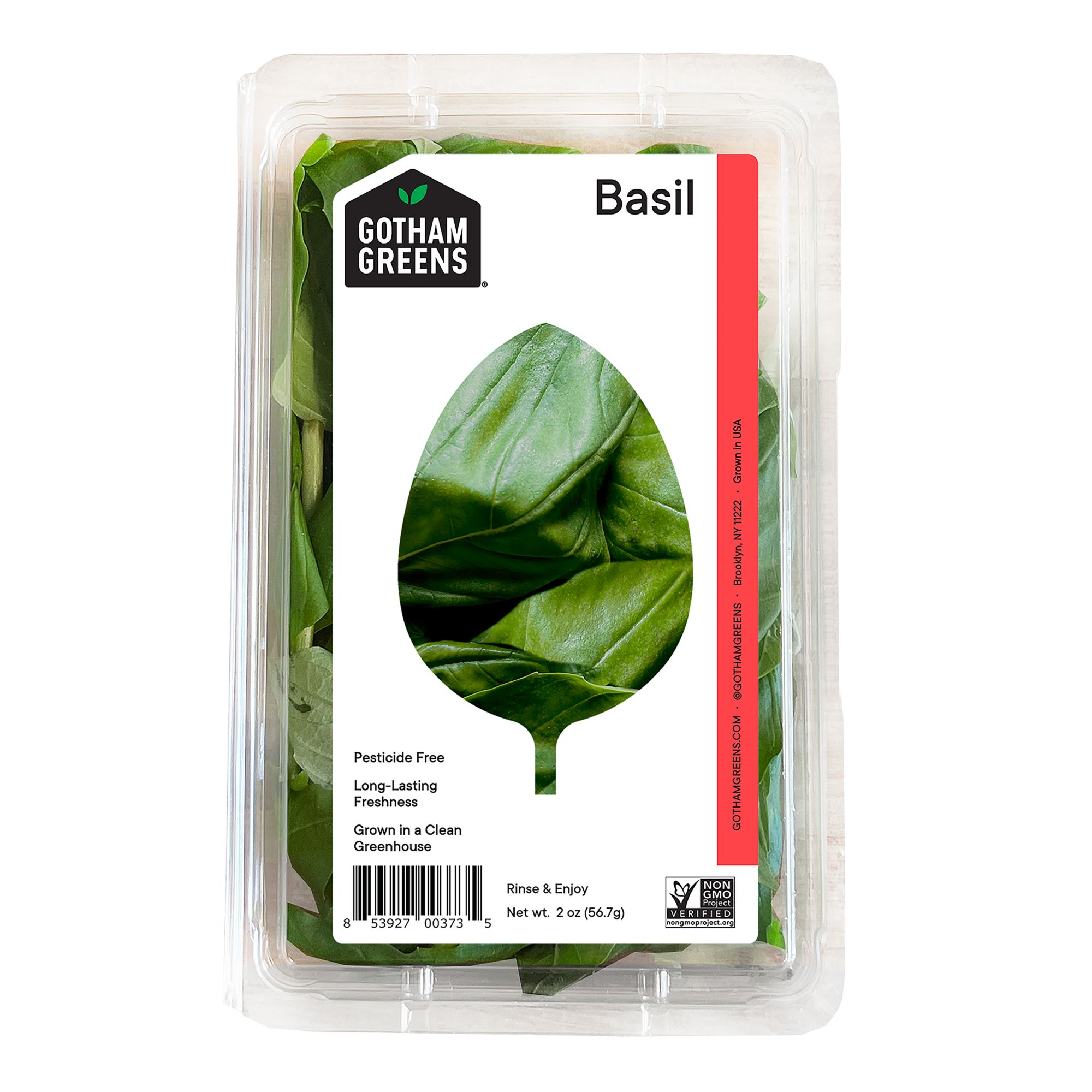 Gotham Greens Genovese Basil is a fragrant addition to salads, pizzas and pastas. Sustainably grown without pesticides, this basil is harvested and hand packed in a Gotham Greens greenhouse and grown close to you for long-lasting freshness. New York-based Gotham Greens is on a mission to transform how and where fresh food is grown. They grow incredibly fresh salad greens and herbs all year round, regardless of the season and temperature outside. As a pioneer in the indoor farming industry, Gotham Greens has been bringing fresh, sustainably grown produce to cities across America for more than a decade. By using hydroponic systems in renewable energy-powered greenhouses, their high-tech farms use fewer natural resources compared to conventional farming. Do not refrigerate.
