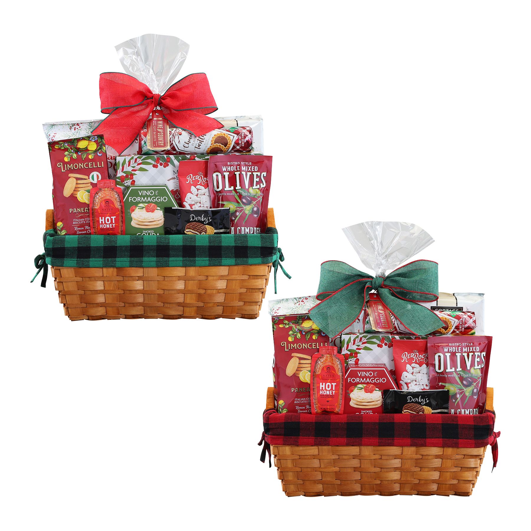 This traditional chip wood basket with a cozy fabric liner makes a great gift for a favorite client, friend or family member. It is packed with a generous mix of sweet and savory treats that are perfect for snacking and sharing during the holiday. Start with classic cream crackers, topped with gouda spread and a drizzle of Nate's Hot Honey and round it out with whole mixed olives. For those with the sweet tooth, this basket includes crunchy caramel corn, tartlets, Limoncello cookies and the irresistible Red Rocker Rocking Chair Mix. Beautifully packaged and ready to impress this basket is a classic gesture or appreciation and holiday cheer.