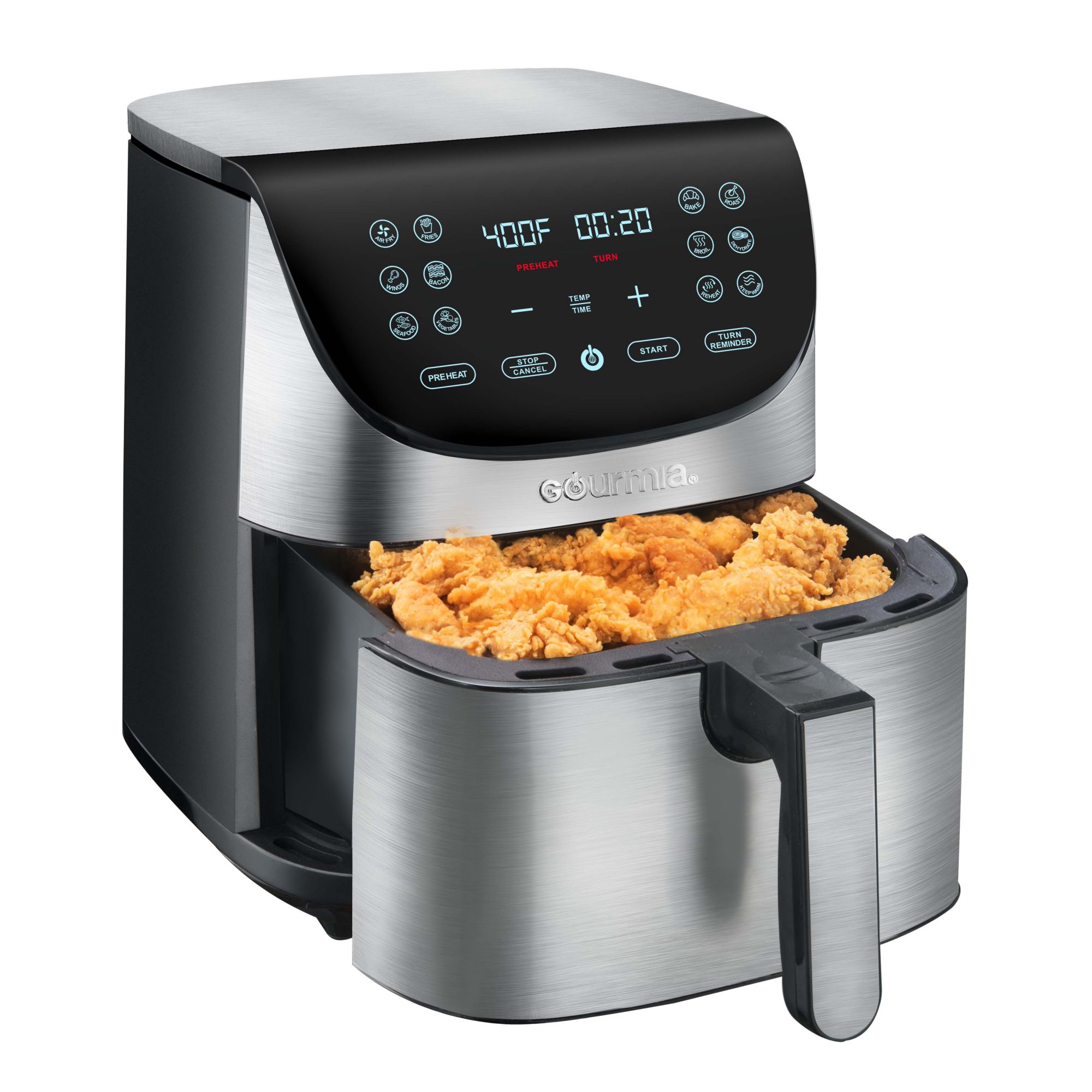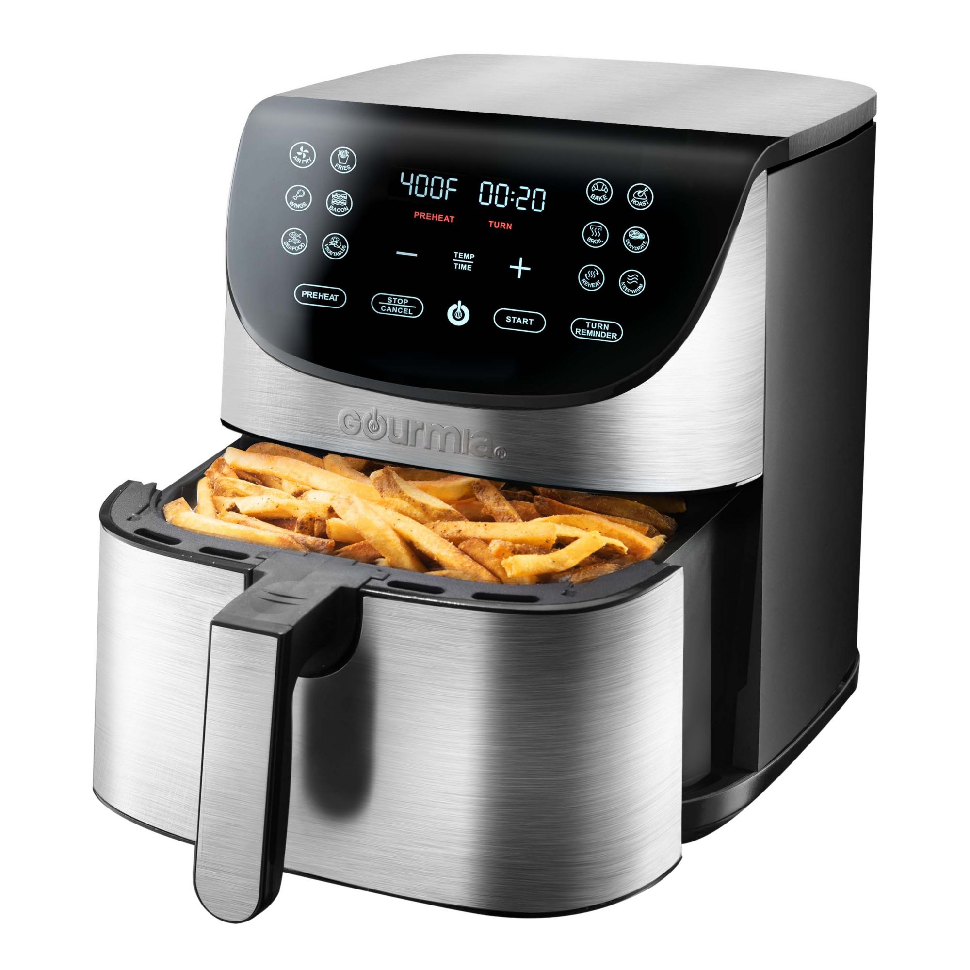 Enjoy healthy meals and slash away those greasy calories with this 7-quart Digital Air Fryer from Gourmia. Fry Force 360° Technology cooks food quickly and evenly with little to no oil and 12 One-Touch Cooking Functions allow you to air fry, bake, dehydrate and more - with just a tap. Adjust settings on the easy-to-read angled display, that offers Guided Cooking Prompts, notifying you when to add food after preheating, and turn food during cooking. The non-stick pan and crisper tray are easy-to-clean and dishwasher safe, for hassle-free cleanup.