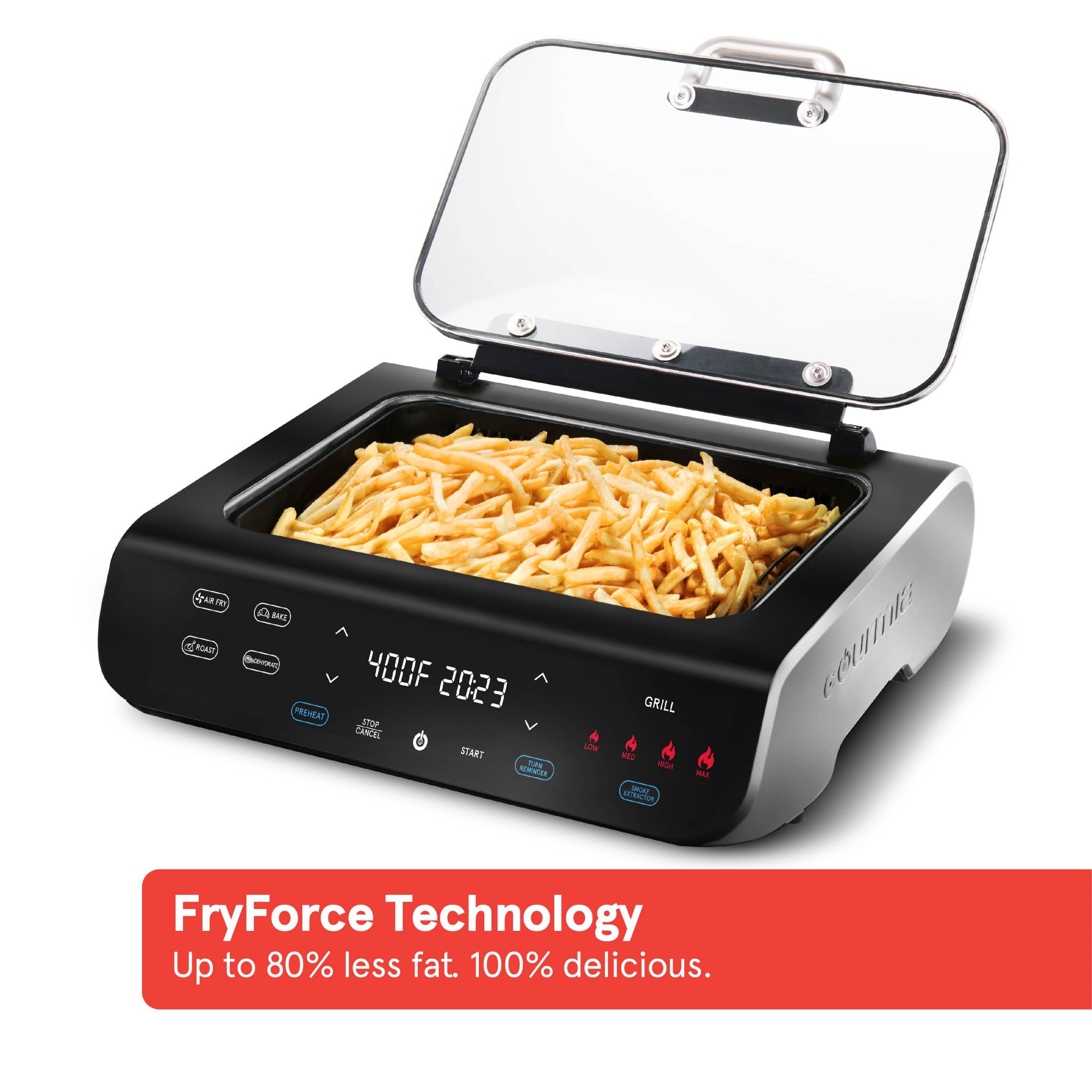 FryForce 360° Technology circulates powerful hot air that fries without oil, eliminating up to 80% of fat