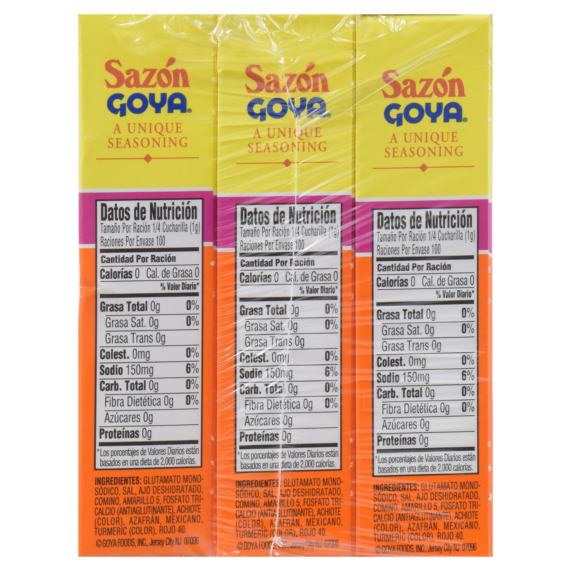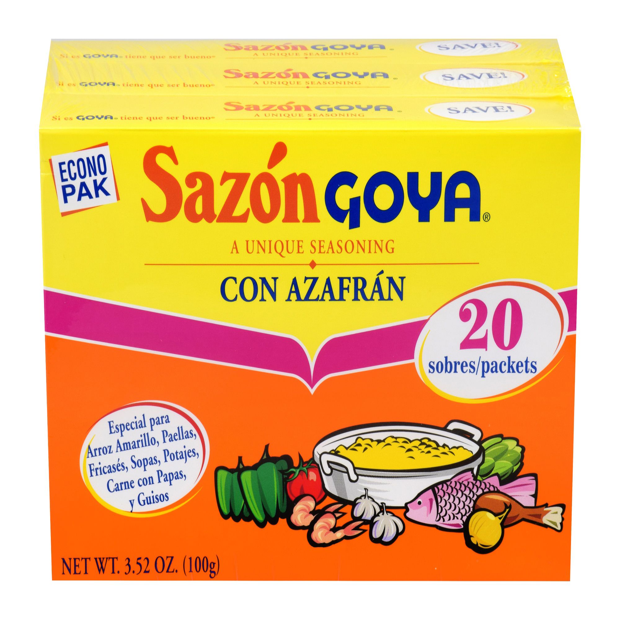 Latin spice Contains black pepper, salt, garlic power Sazon means Spanish Includes three 3.52 oz. Goya Sazon Con Azaf shakers
