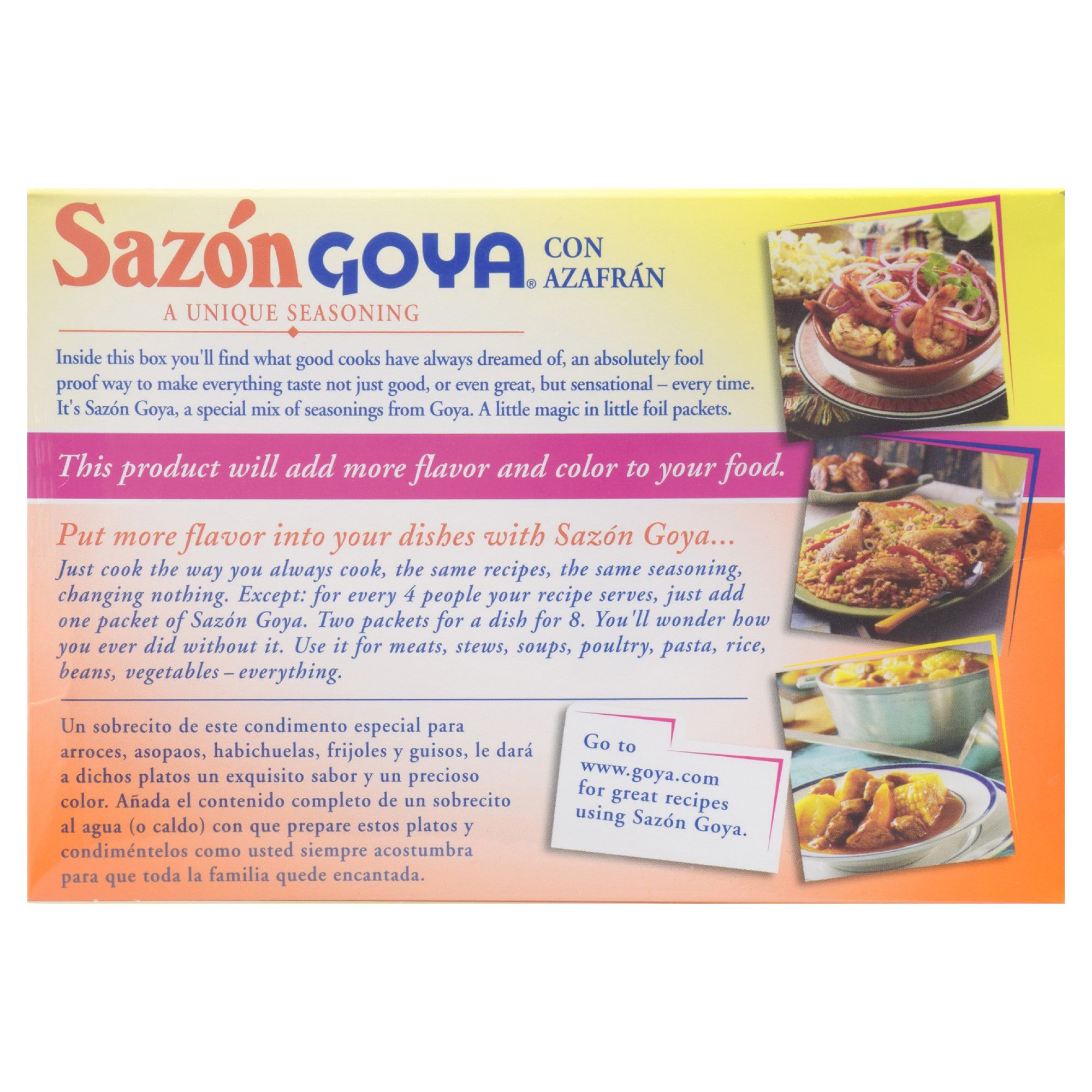 Packing a powerful punch of coriander, garlic, cumin and annatto, Sazón GOYA with Coriander & Annatto instantly makes dishes more delicious by quickly adding an appealing flavor and vibrant color.