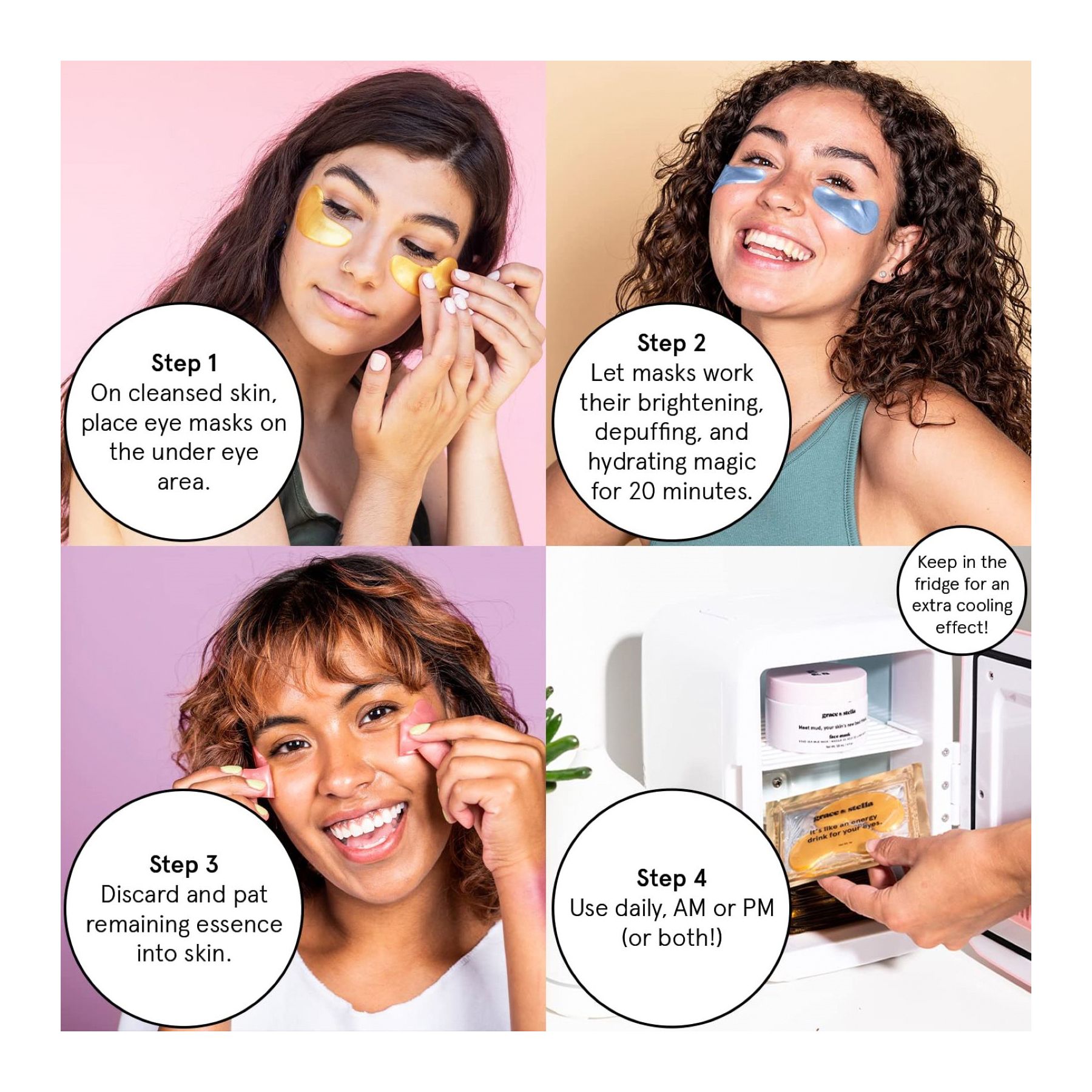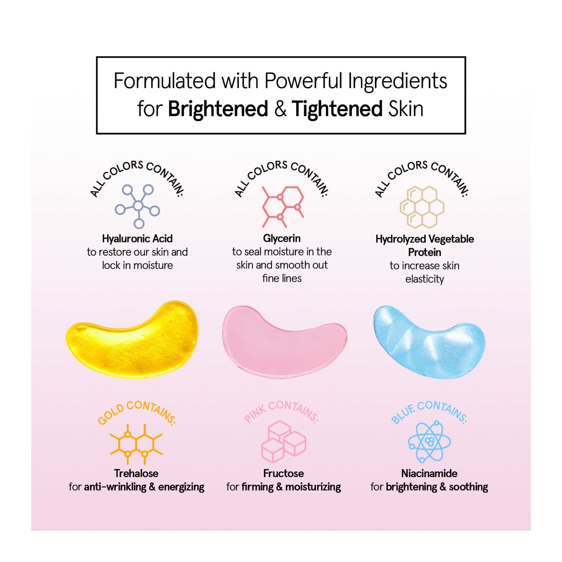 Eight gold (energizing) under eye masks, eight pink (moisturizing) under eye masks, eight blue (illuminating) under eye masks