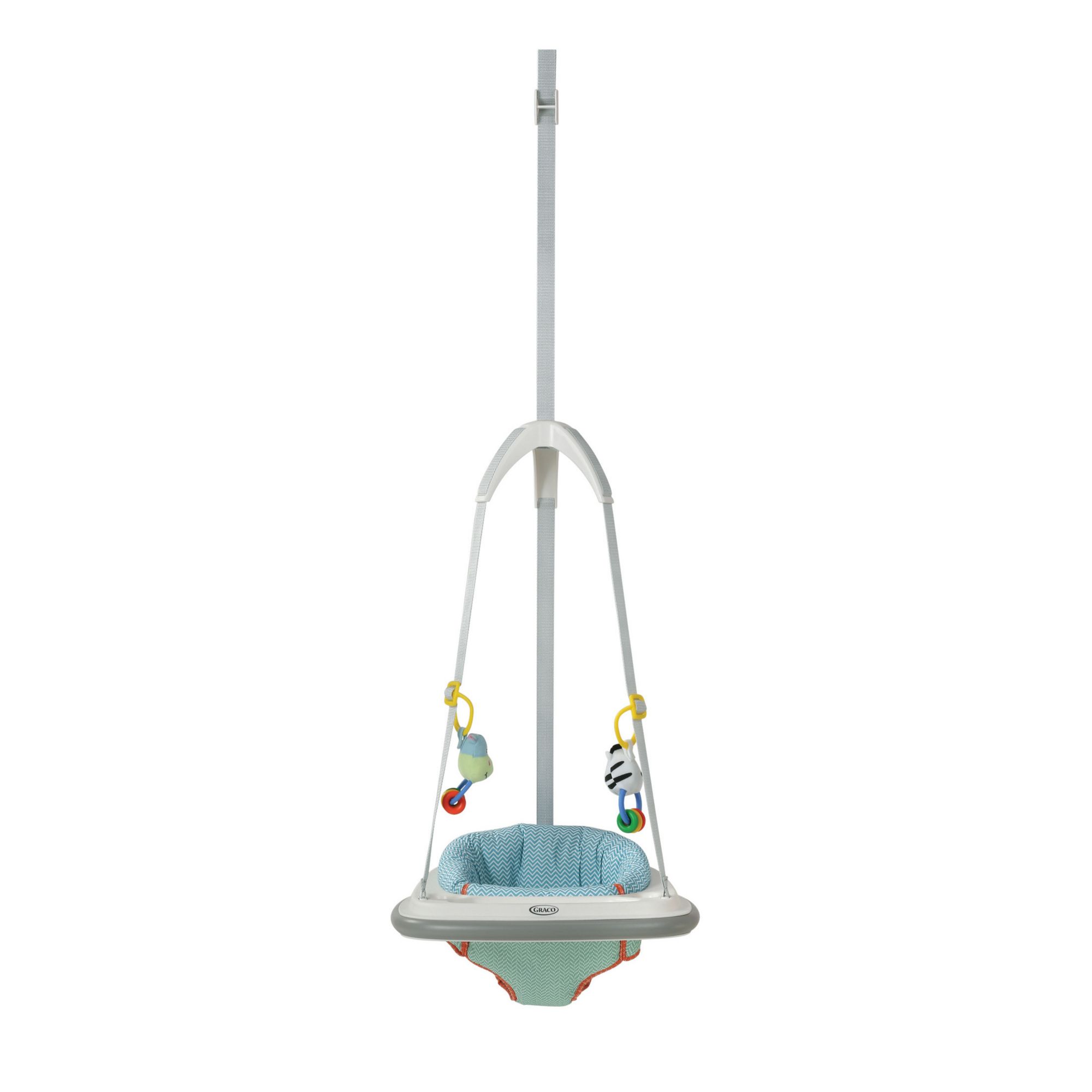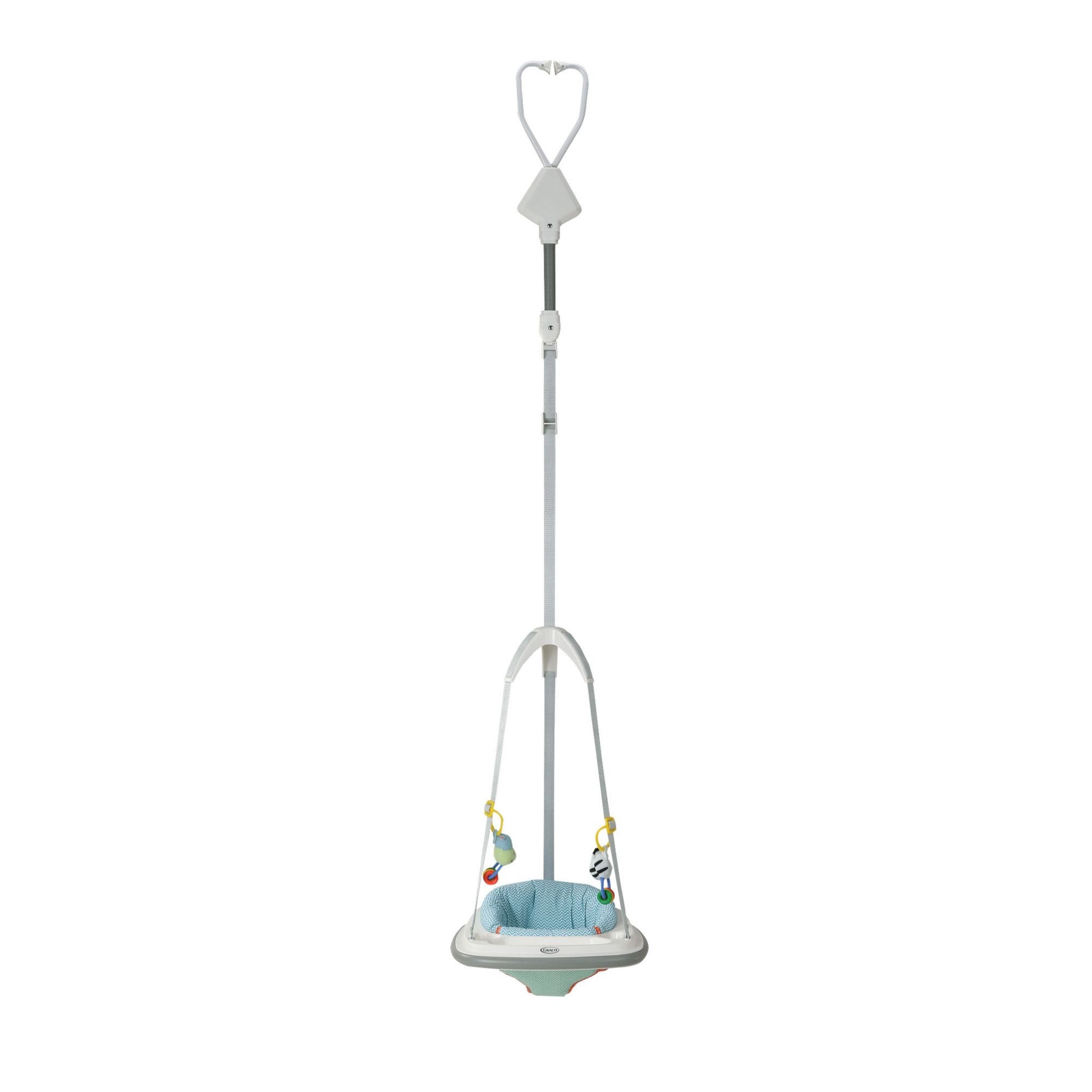 Height is easily adjusted so it can grow as fast as your baby does Play tray keeps toys within reach to keep baby entertained Two soft, removable, interactive toys attach to adjustable play rings Weight limit: 5.5 lbs. to 25 lbs. Sturdy bounce spring with hidden safety cord for nonstop little leg action and jumping joy Keep doorways mark free with our no-mark clamp Easily attaches to doorframe and transports from room to room for fun throughout the home Highback nylon seat pad is easily machine washable, or wiped clean, to save you time Non-twist straps and plastic dome allow for quick, easy in and out Includes two interactive toys and removable nylon seat pad