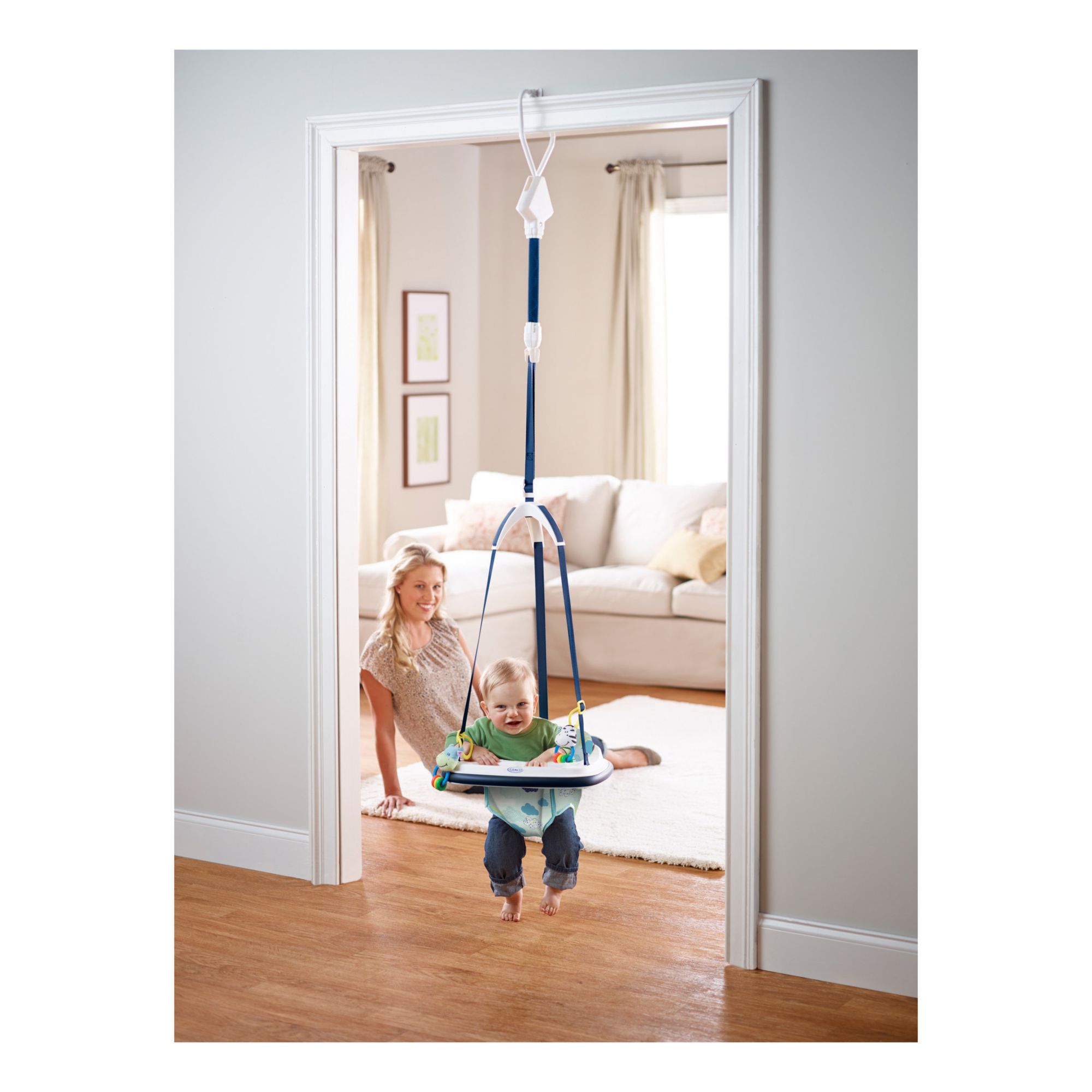 Keep baby giggling for hours with the Graco Bumper Jumper doorway jumper! Easy to transport, with a no-mark doorframe clamp, this action-packed entertainer allows you to take baby from room to room so you can keep baby by your side. The nylon seat pad is easily removed and tossed into the washer to make cleaning a breeze.
