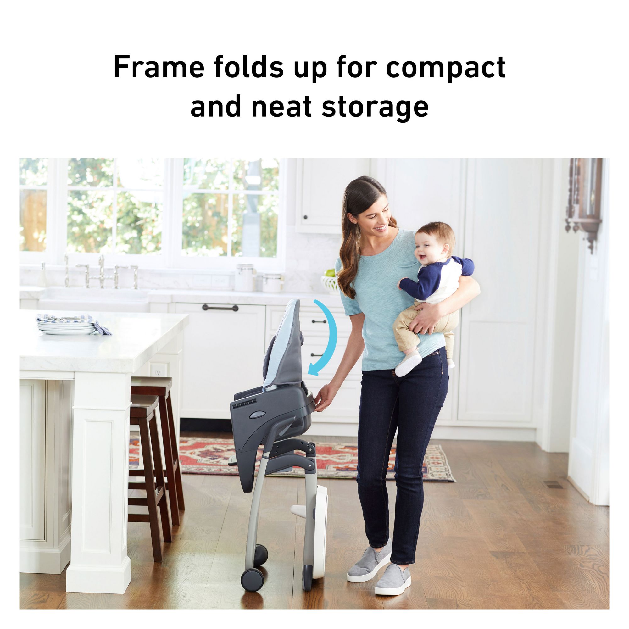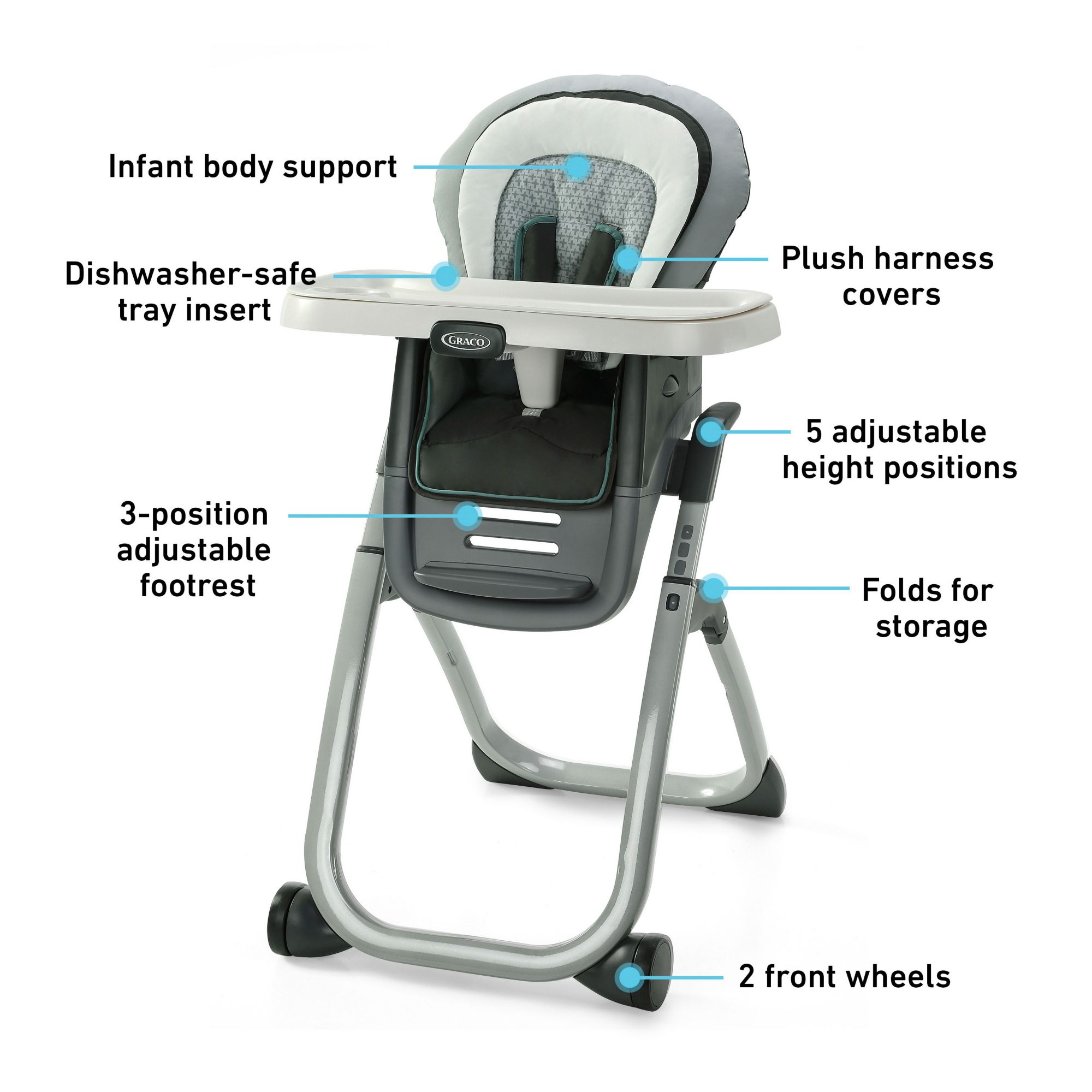 Plush body support, harness covers, highchair frame, tray, tray insert, and seat pad Offers 6 modes of use from infant highchair to youth stool, to seating 2 kids at once (infant booster and youth stool options) Self-standing fold for compact and neat storage 5-position height adjust to best fit your table 3-position footrest adjusts as your child grows Plush infant body support and harness covers keep baby comfortable One-hand removable tray with dishwasher-safe, removable insert Includes (1) highchair
