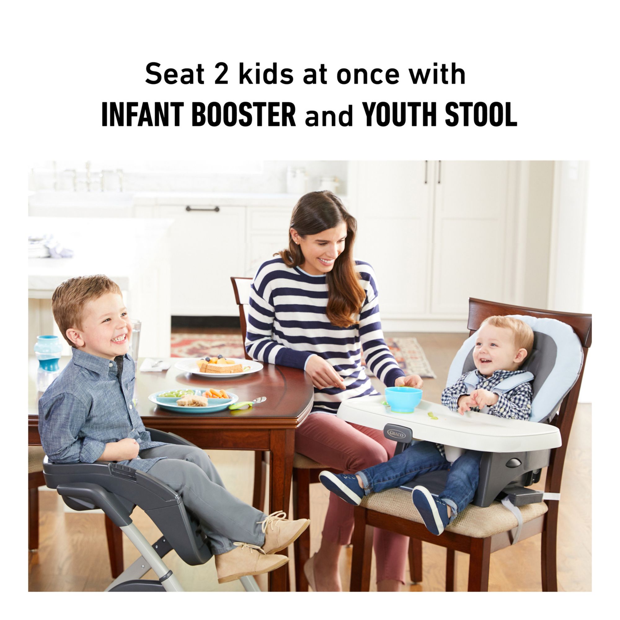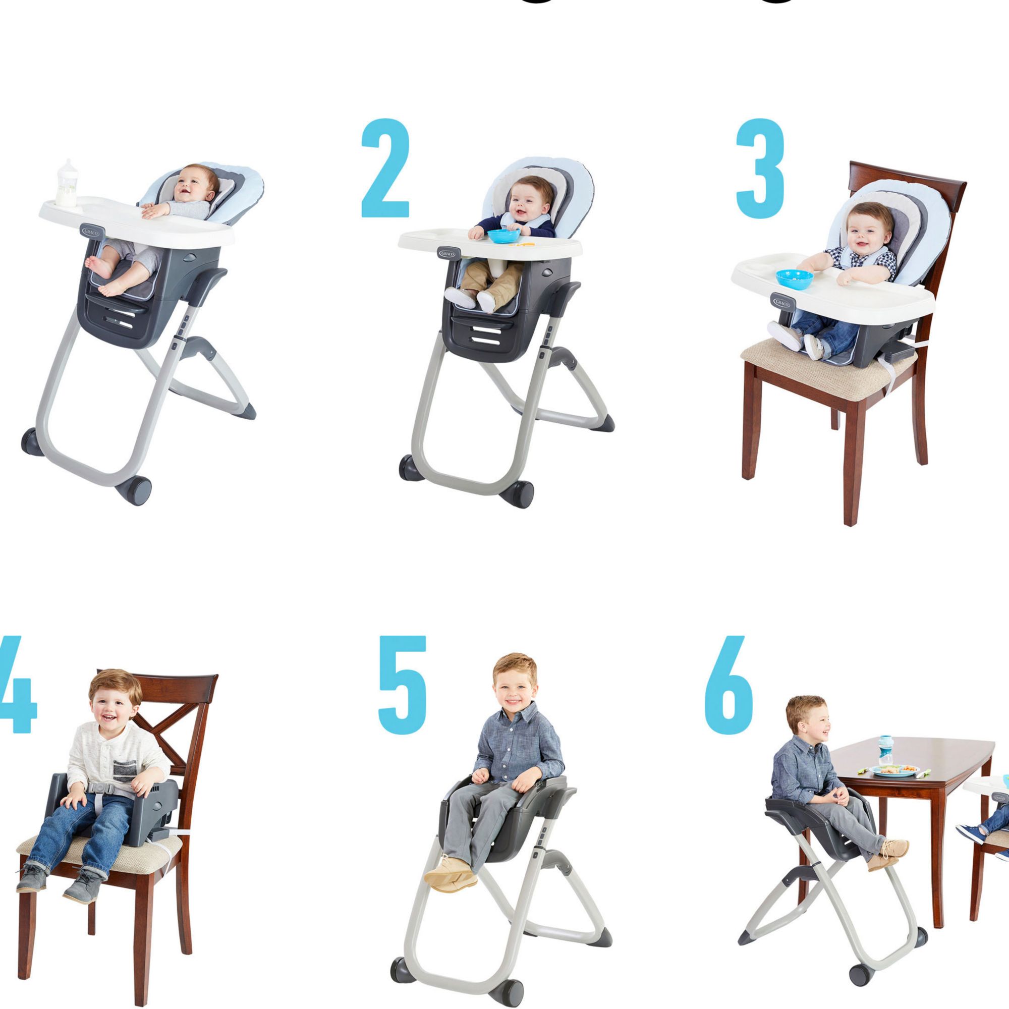 The Graco DuoDiner DLX 6-in-1 Highchair offers 6 growing stages from infant highchair to seating two kids at once. The highchair features infant body support and 3 recline positions for early comfort and is fully featured with a self-standing fold and 5 height positions to match dining table height. When baby is ready to join the family at the table, use the infant or toddler booster on a dining room chair. Then, convert to an elevated youth stool to give your older child their own seat at the table. This highchair can even seat two kids at once to grow with your family!