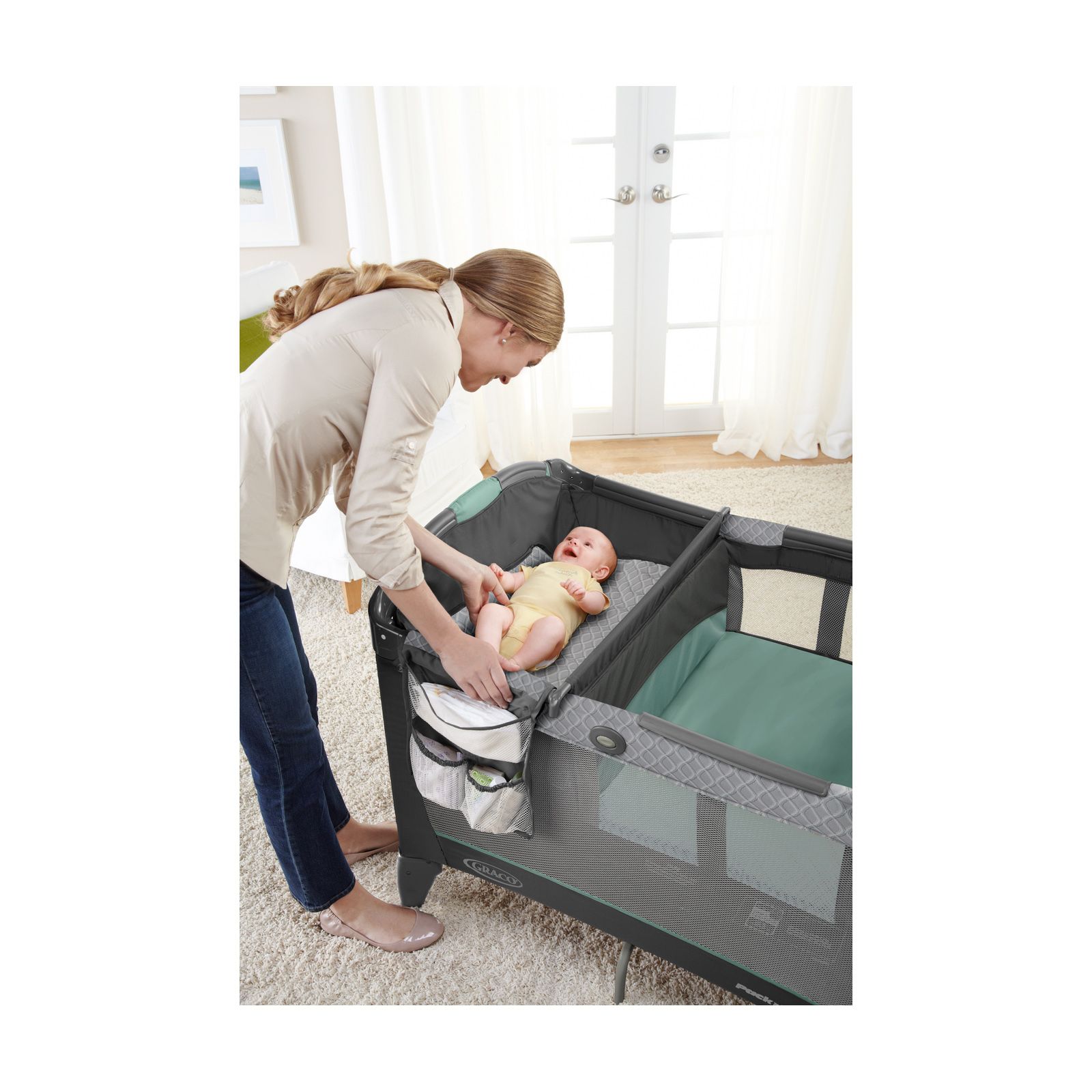 With the Graco Pack 'n Play Playard with Change 'n Carry portable changing pad, keeping your little one fresh just got easier! You can use the convenient pad in the play yard changer or on its own, for diaper changes wherever you are. Then, fold it into a go-anywhere travel pouch and use storage pockets to keep essentials close. Your precious baby will rest easy in the comfy nest bassinet, which later converts to a full-sized playpen to suit your toddler. The toy mobile, wipe-clean changer fabric, simple push-button fold and a convenient carry bag round out this playard's terrific features.