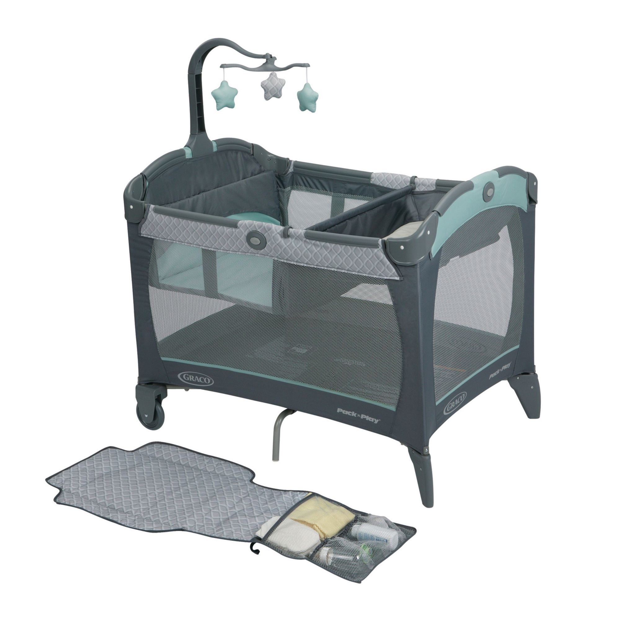 Mobile with three soft toys awakens baby's imagination, keeping her happy and entertained Easily converts to a portable toddler playpen for rest and fun wherever you are Signature Graco push-button fold makes closing your playard quick and hassle-free Convenient carrying bag for no-fuss travel and storage Airy mesh on all sides provides maximum ventilation Includes portable changing pad and storage, next bassinet, changing station, three soft toys, playard with wheels