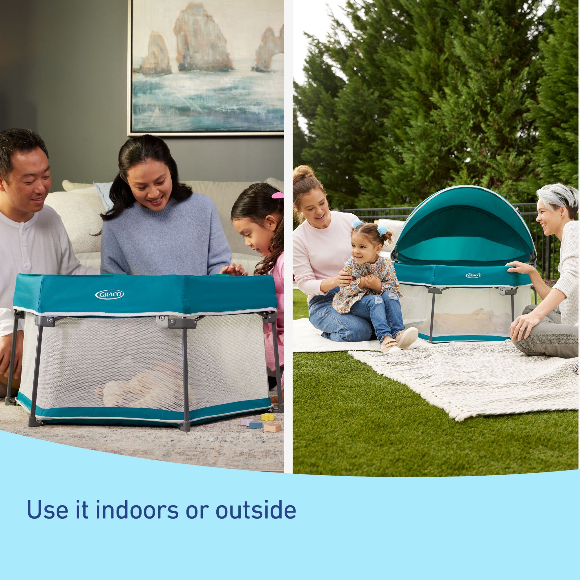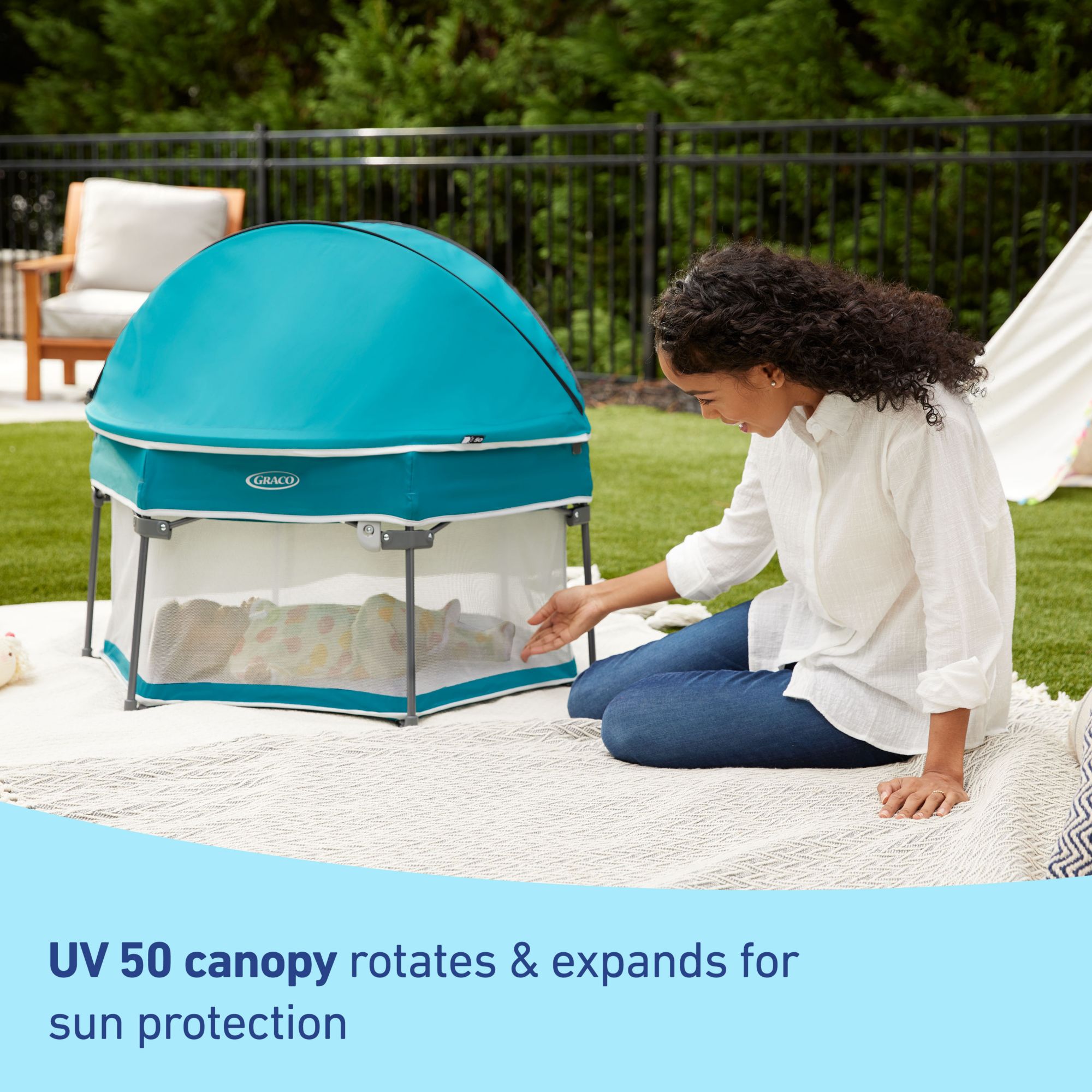 Removable UV 50 canopy rotates and expands to provide versatile sun protection for outdoor play