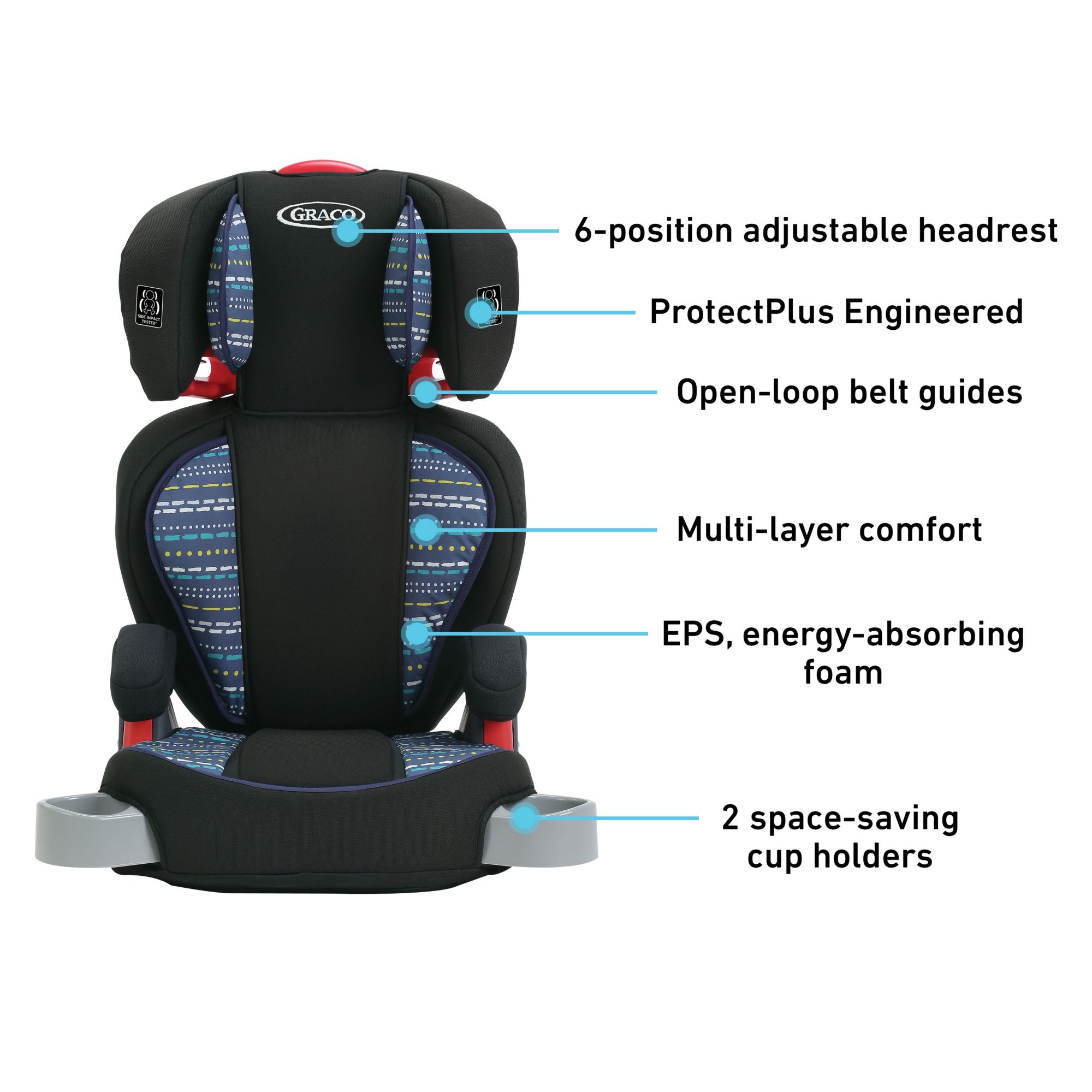 Hideaway cup holders keep drinks and snacks within reach Graco ProtectPlus Engineered features a combination of the most rigorous crash tests that helps to protect your little one in frontal, side, rear ad rollover crashes, and additional testing based on the New Car Assessment Program and for extreme car interior temperatures Open-loop belt guides help you correctly position your vehicle’s seat belt Rigorously crash tested to meet or exceed US safety standards Padded, height-adjustable armrests and hide-away cup holders will help keep your child content on the road Includes booster seat