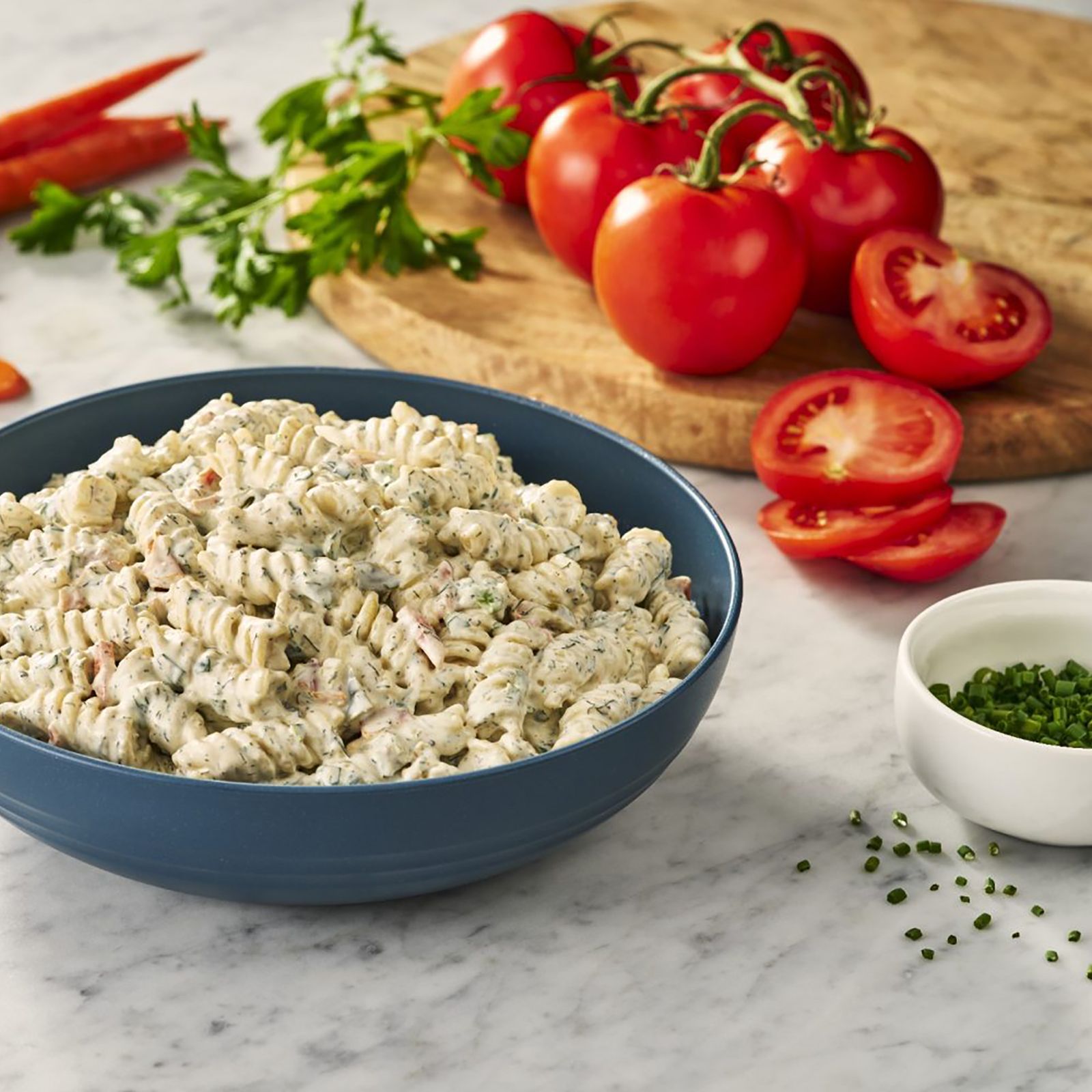 The Sandridge Family believes that good food is the foundation of genuine happiness. That lasting memories are created with good friends, and perhaps most-importantly, great food. Their family is committed to continuing the traditions that help bring your family together. Grandma's Kitchen homestyle ranch pasta salad is a classic dish with a twist. Diced tomato, green pepper, and carrots are mixed together in Grandma’s creamy dressing and topped with chives and parsley. Enjoy life, it’s delicious.
