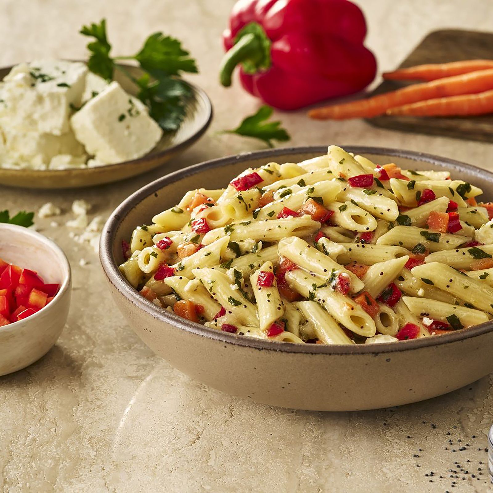 A delicious blend of red pepper, carrots, and feta lightly tossed in vinaigrette dressing.