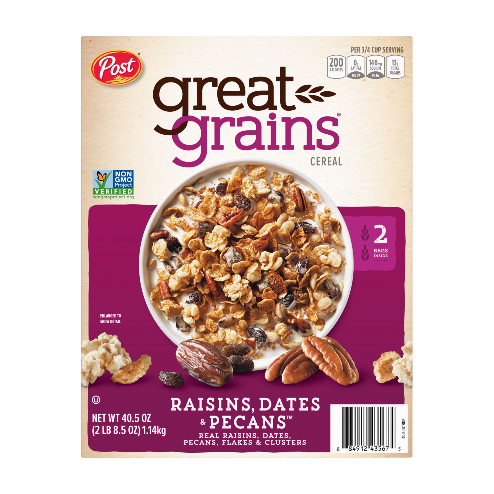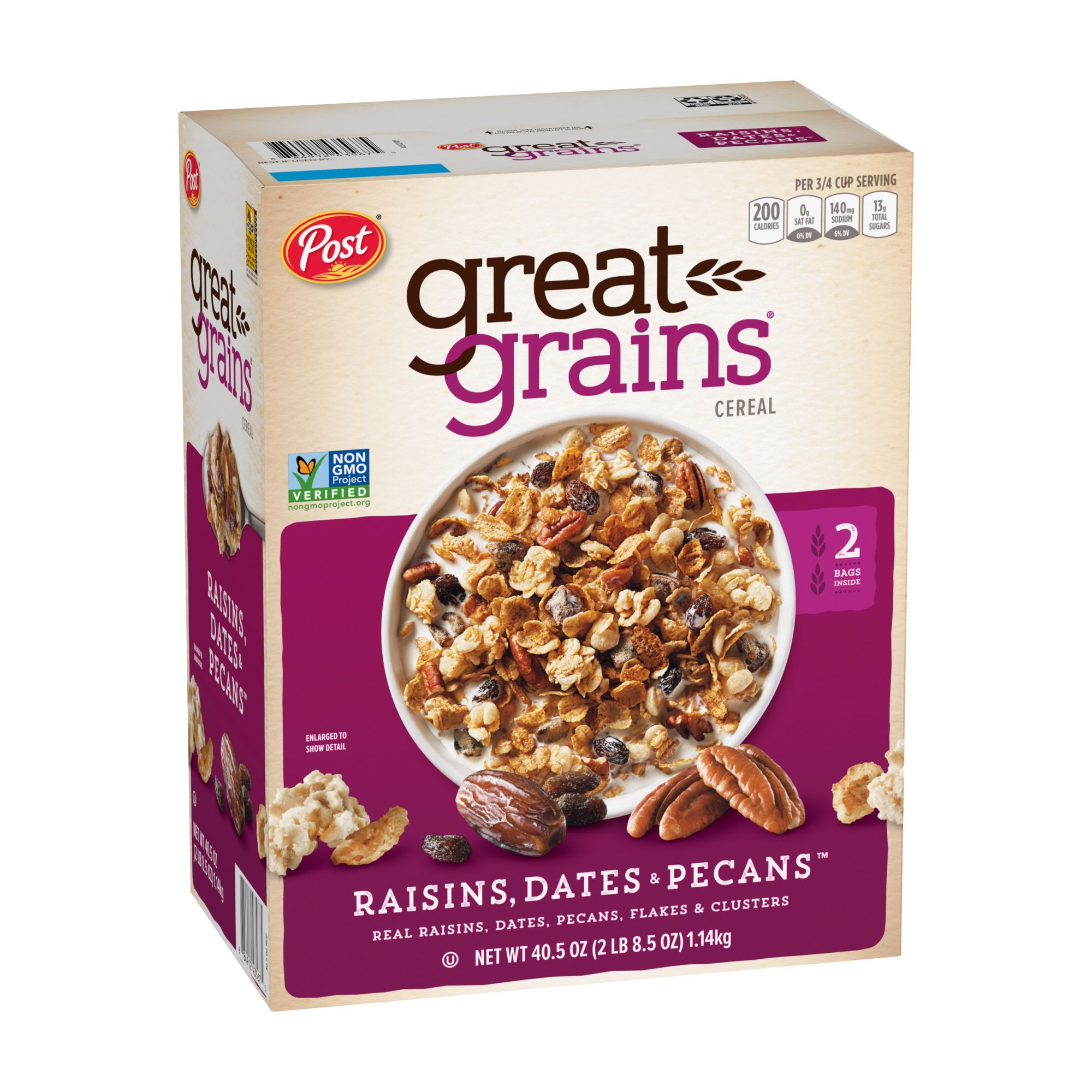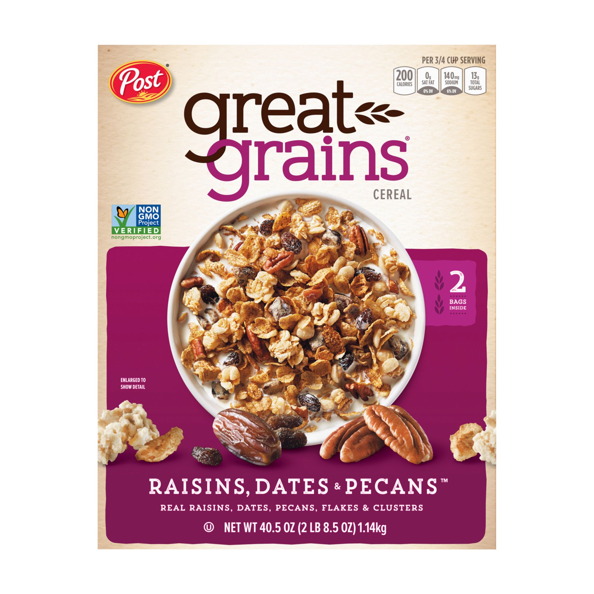 One box containing two bags of 20.25 oz. Great Grains Raisn Date Pecan cereal