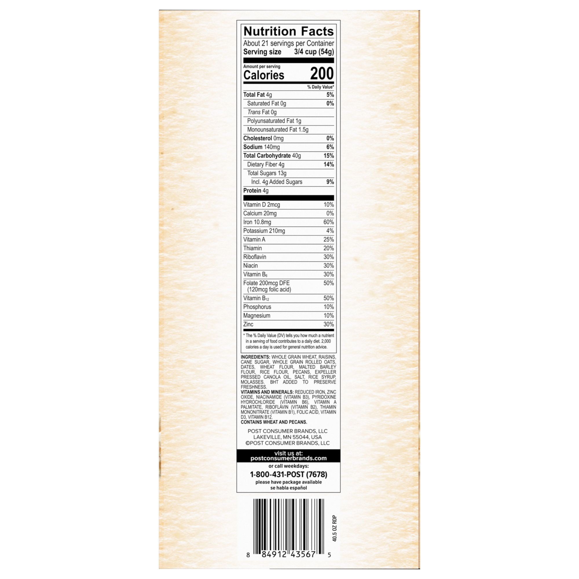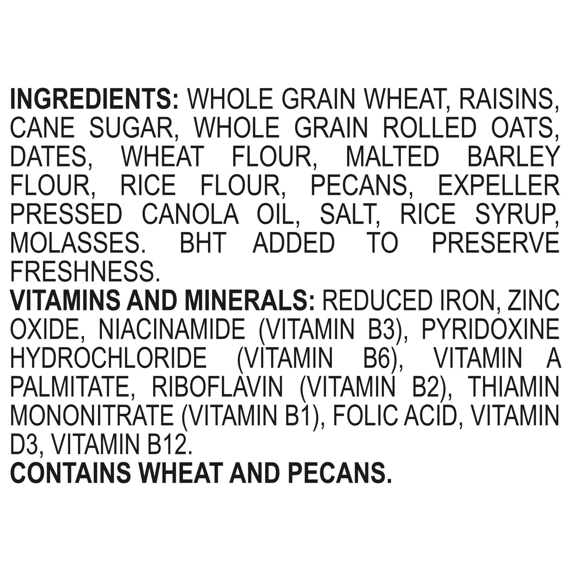 Ingredients: Whole Grain Wheat, Raisins, Can Sugar, Whole Grain Rolled Oats, Wheat Flour, Malted Barley Flour, Rice Flour, Pecans, Expeller Processed Canola Oil, Salt, Rice Syrup, Molasses.