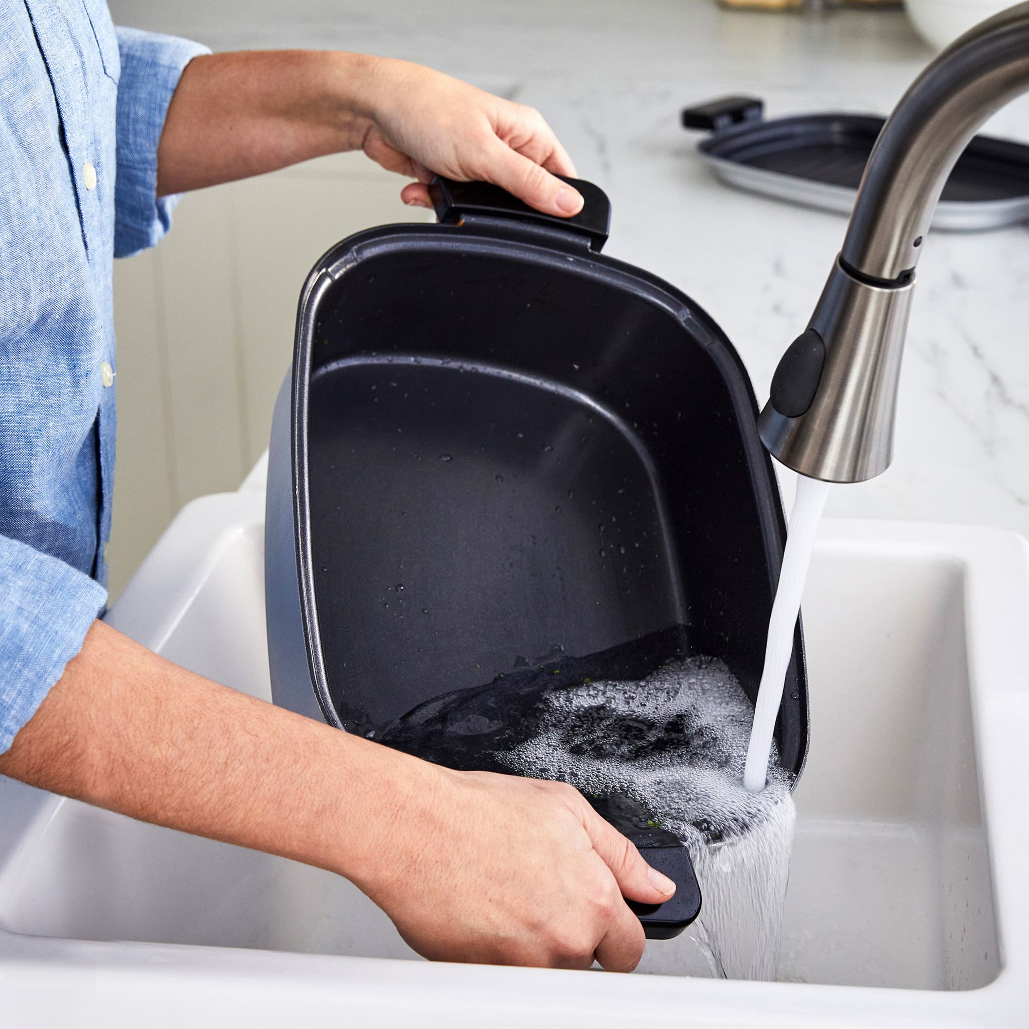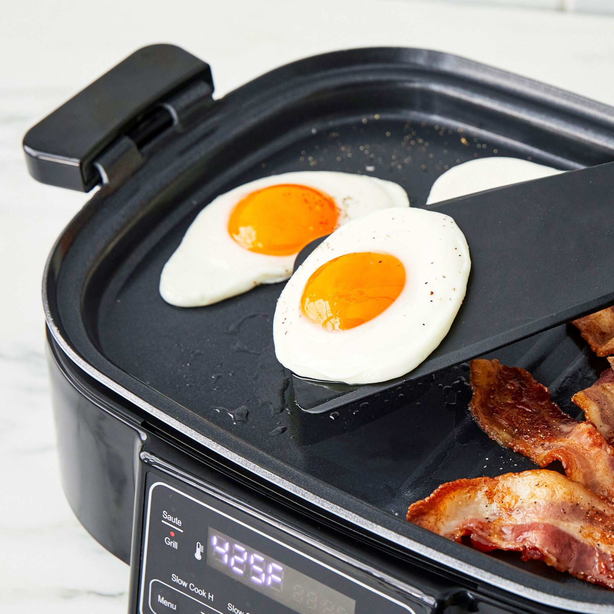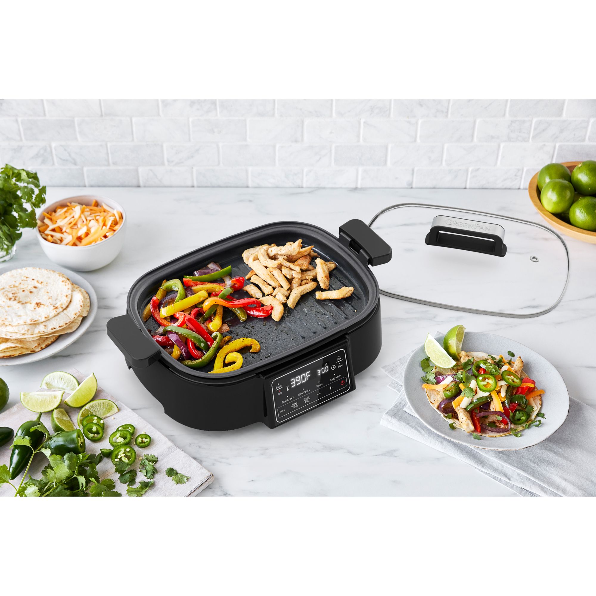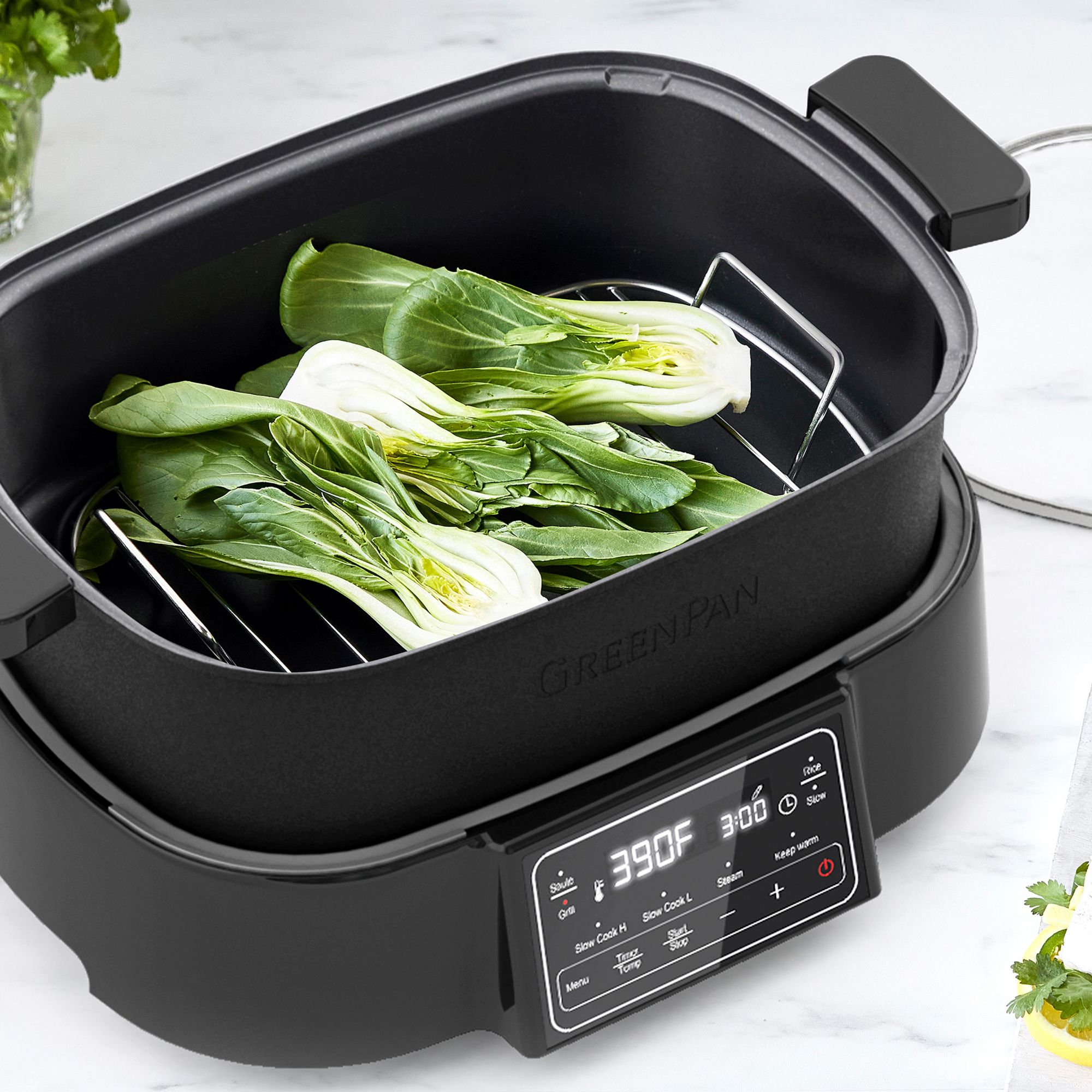 Build a full kitchen on your counter with the Bistro Noir Multi Skillet Deluxe. The spacious 6.5 qt. bowl is perfect for family meals, and the slow-cook options give your meal the time it needs for flavor. Plus, a versatile grill and griddle plate take the work out of steak and eggs. The Bistro Noir Multi Skillet Deluxe also features our PFAS-free ceramic nonstick coating, so every meal you make will be healthier. Specially designed to withstand the strain of modern appliances, our diamond-infused ceramic nonstick doesn’t break down like traditional coatings, and it’s free of PFAS, PFOA, lead, and cadmium. No matter what your meal demands, the Multi Skillet Deluxe has, you covered: steam, sauté, stir-fry, grill, rice, stew, slow cook, and keep warm. You’ll always be ready to take on the next meal.