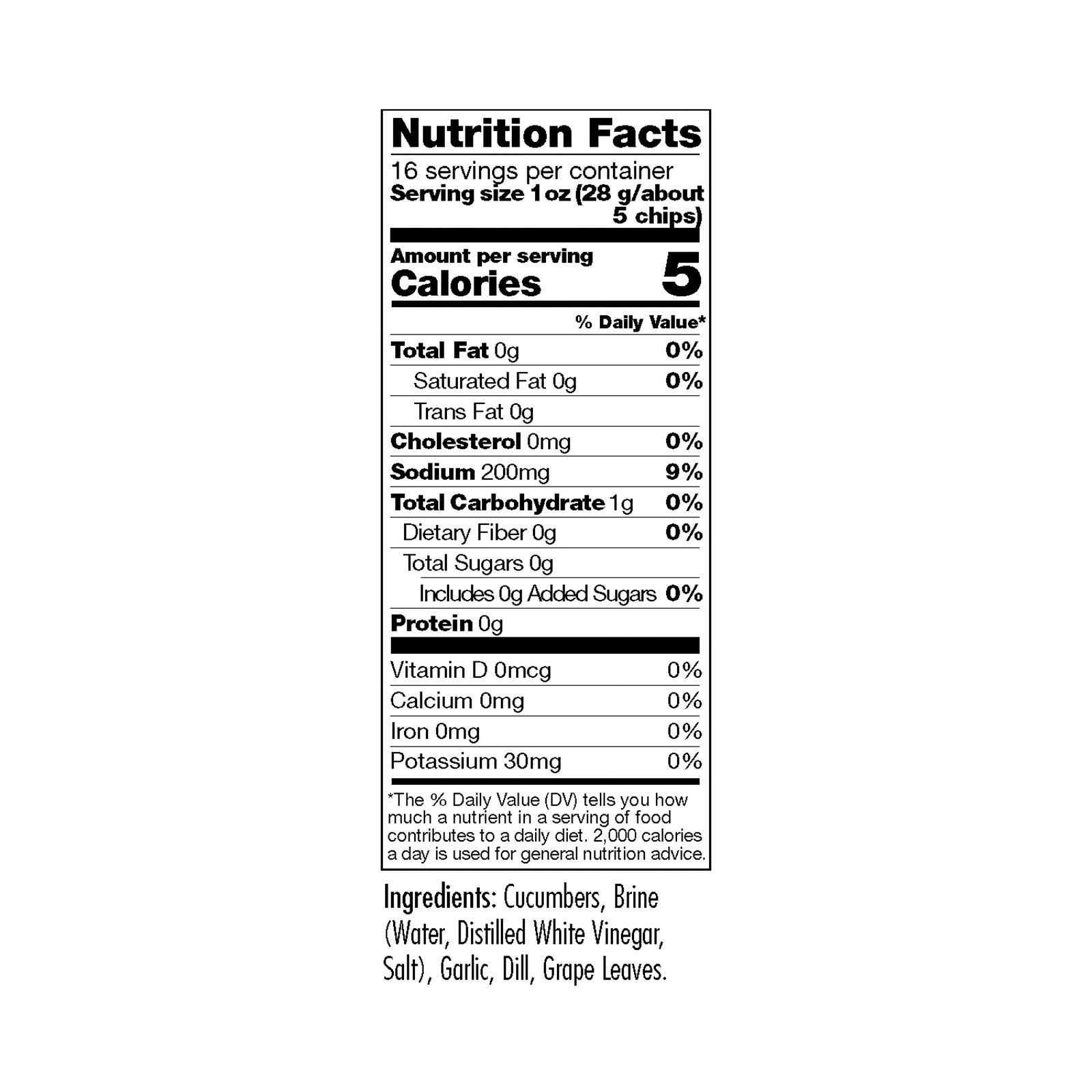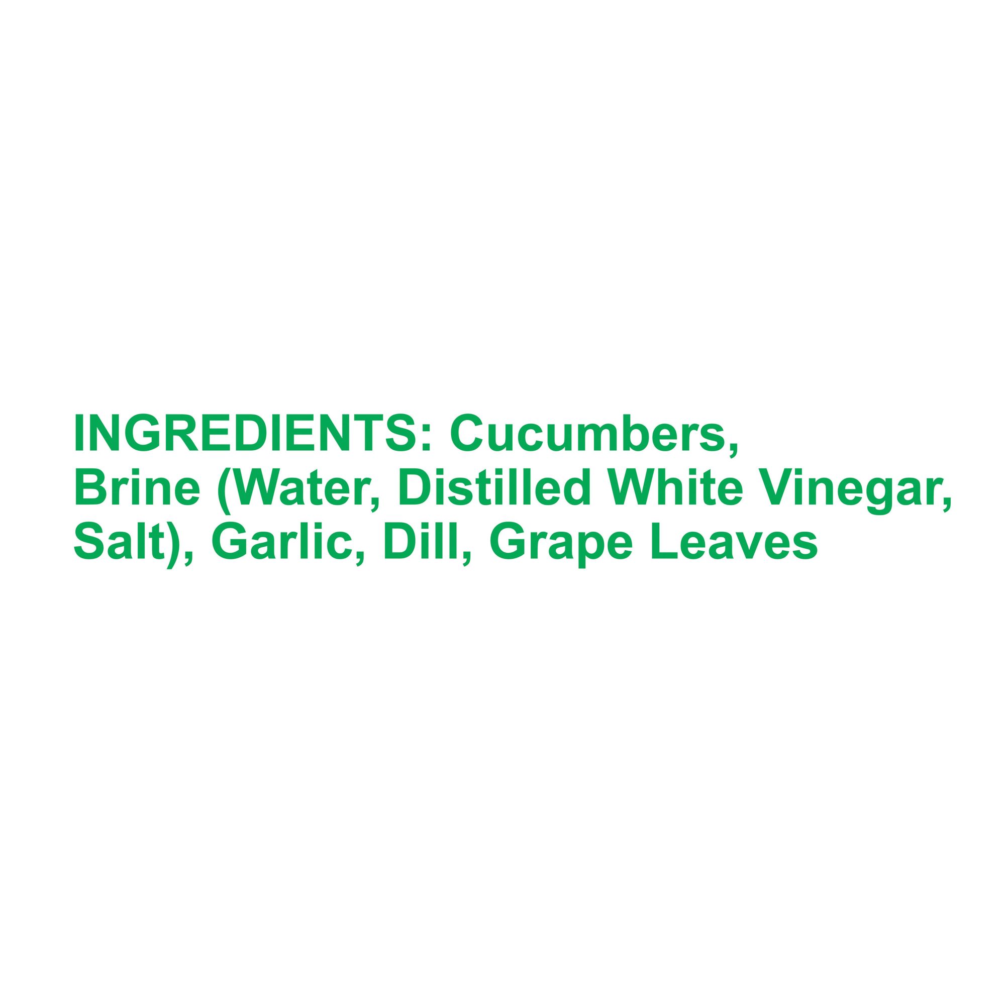 Ingredients: Cucumbers, Brine (Water, Distilled White Vinegar, Salt), Garlic, Dill, Grape Leaves