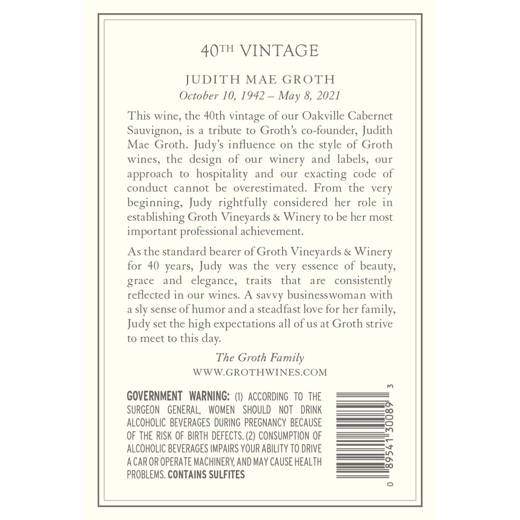 To celebrate our 40th vintage in the wine business, the original 1982 inaugural label graces the front of our limited edition 2021 vintage bottles of Cabernet Sauvignon. The 40th vintage of our Cabernet Sauvignon is a tribute to Groth's co-founder, Judith Mae Groth. Judy's influence on the style of Groth wines, the design of our winery and labels, our approach to hospitality and our exacting code of conduct cannot be overestimated. As the standard bearer of Groth Vineyards & Winery for 40 years, Judy was the very essence of beauty, grace and elegance, traits that are consistently reflected in our wines.