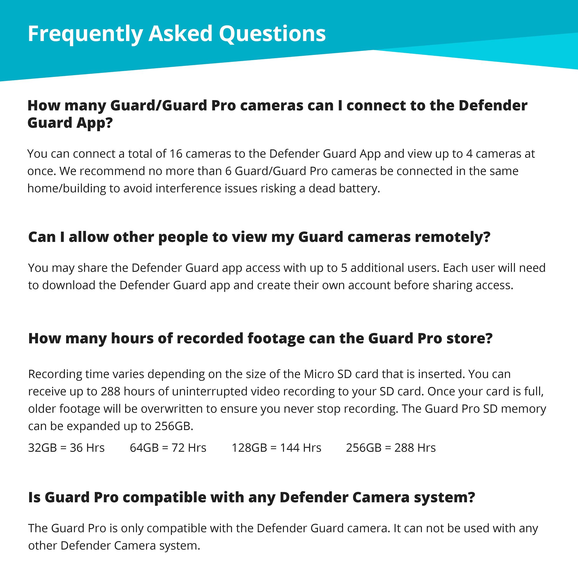 Includes three Guard Pro color night vision 2K Wi-Fi smart outdoor cameras with pre-installed 32GB SD card, three mounting hardware sets, three camera power supplies (10'), three extension cable (25'), three window warning stickers (3" x 2"), three Ethernet waterproof cable shields, one drilling template, one quick start guide, and one lifetime live chat support Warranty: 1 year