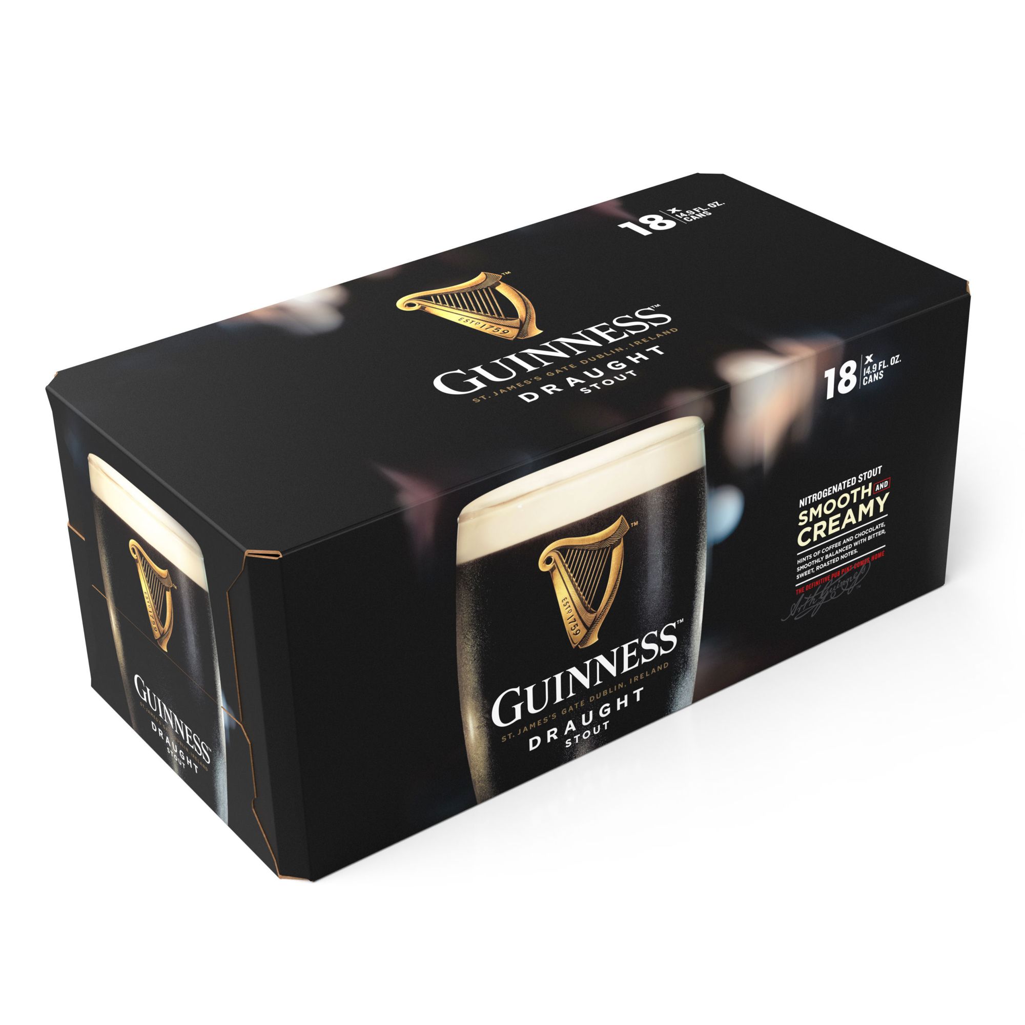 Hints of coffee and chocolate, smoothly balanced with bitter, sweet, roasted notes. St. James's Gate Dublin, Ireland. The definitive pint comes home. Savor a pint of the world's first and America's favorite nitrogenated beer. Upon opening each can, the famous widget jets nitrogen through the beer, creating that characteristic creamy head and iconic surge that's so distinctively Guinness. www.guinness.com. drinkiQ.com. Please recycle. Brewed in Ireland.