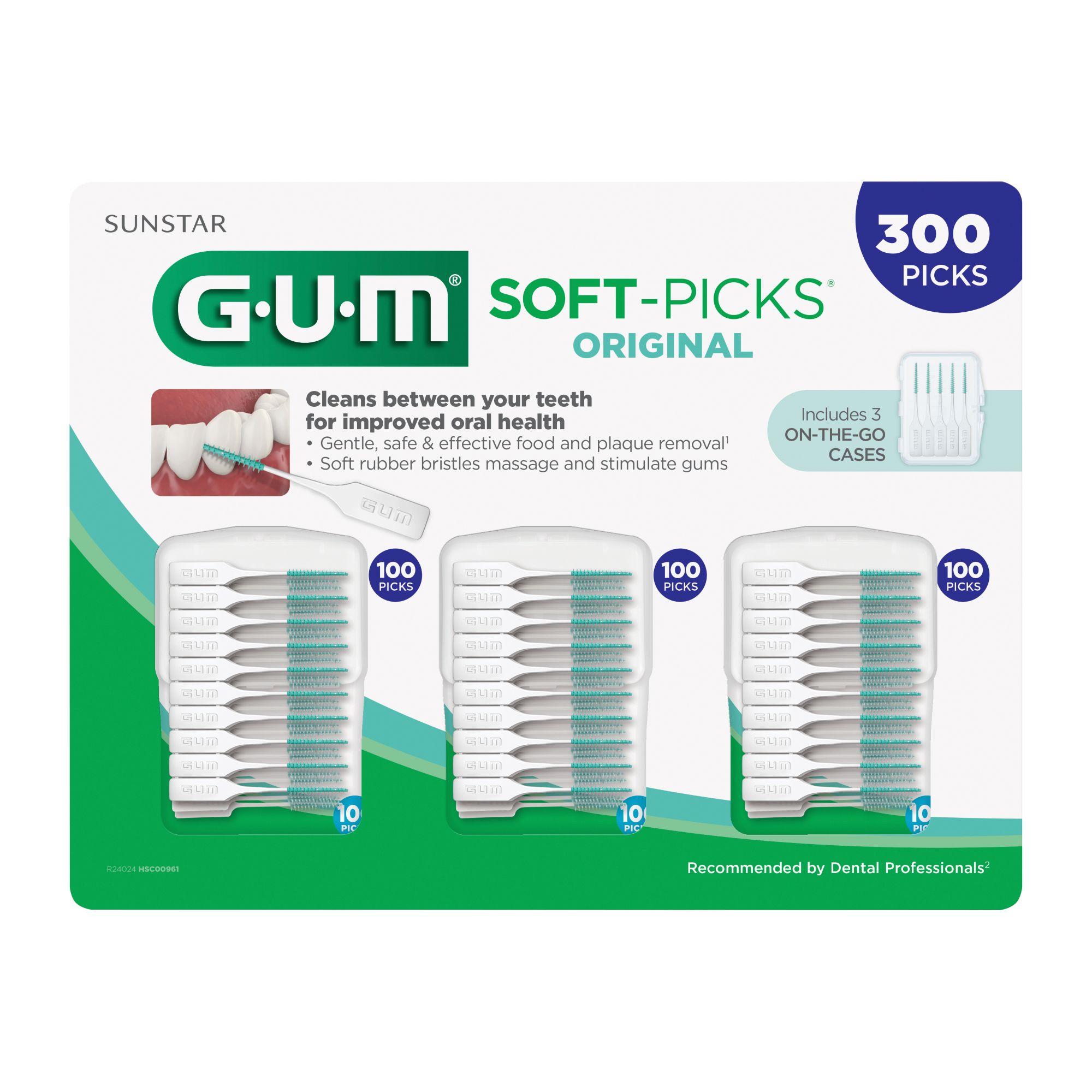 Gum Original Soft Picks easily remove plaque and food between teeth. The picks feature soft rubber bristles that also safely massage and stimulate the gums. The pack contains 3 x 100 count picks which is a value to the member. Each 100 count pack contains its own carrying cases. The individual packs can be shared among family members. Soft Picks Original are highly recommended by dentists to maintain healthy gums. Soft Picks Original are easy to use and dispose of after each use.