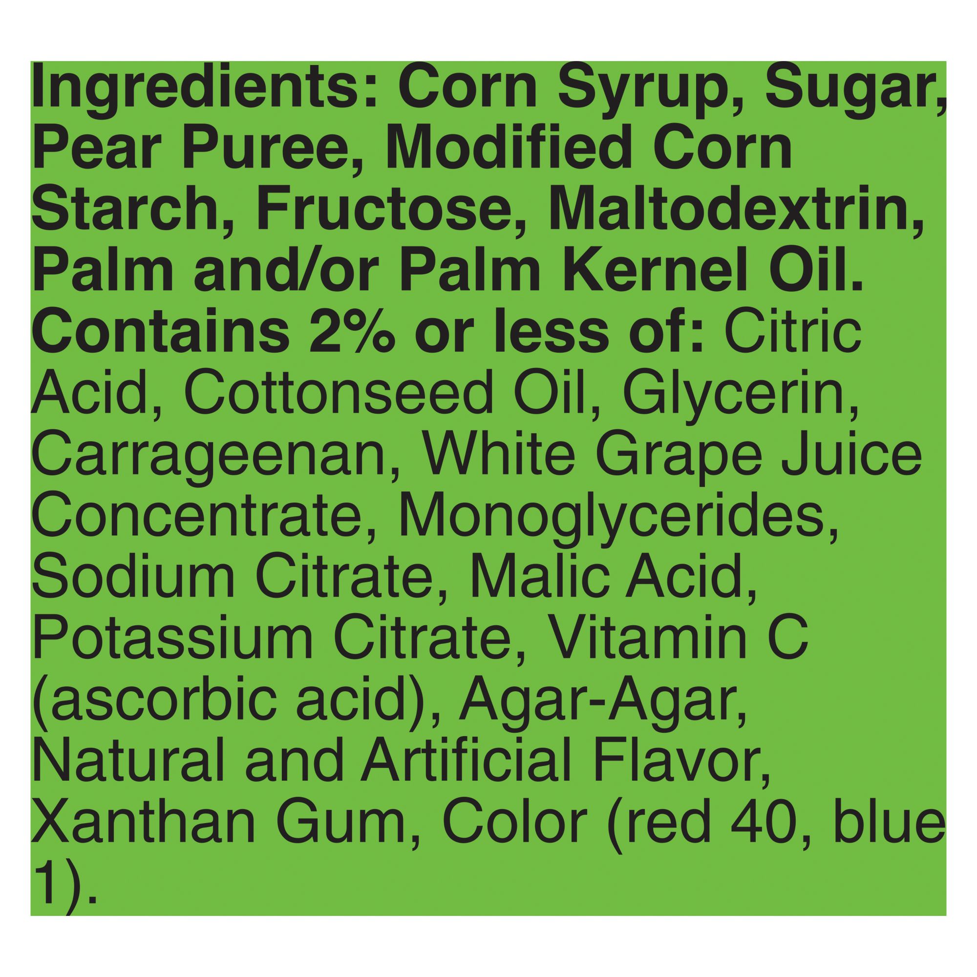 Ingredients: Sugar, Corn Syrup, Dried Corn Syrup, Pear Puree Concentrate, Modified Corn Starch, Fructose, Maltodextrin, Palm Oil. Contains 2% or less of: Citric Acid, Cottonseed Oil, Glycerin, Carrageenan, White Grape Juice Concentrate, Monoglycerides, Sodium Citrate, Malic Acid, Potassium Citrate, Vitamin C (ascorbic acid), Agar-Agar, Natural Flavor, Xanthan Gum, Color (red 40, blue 1).