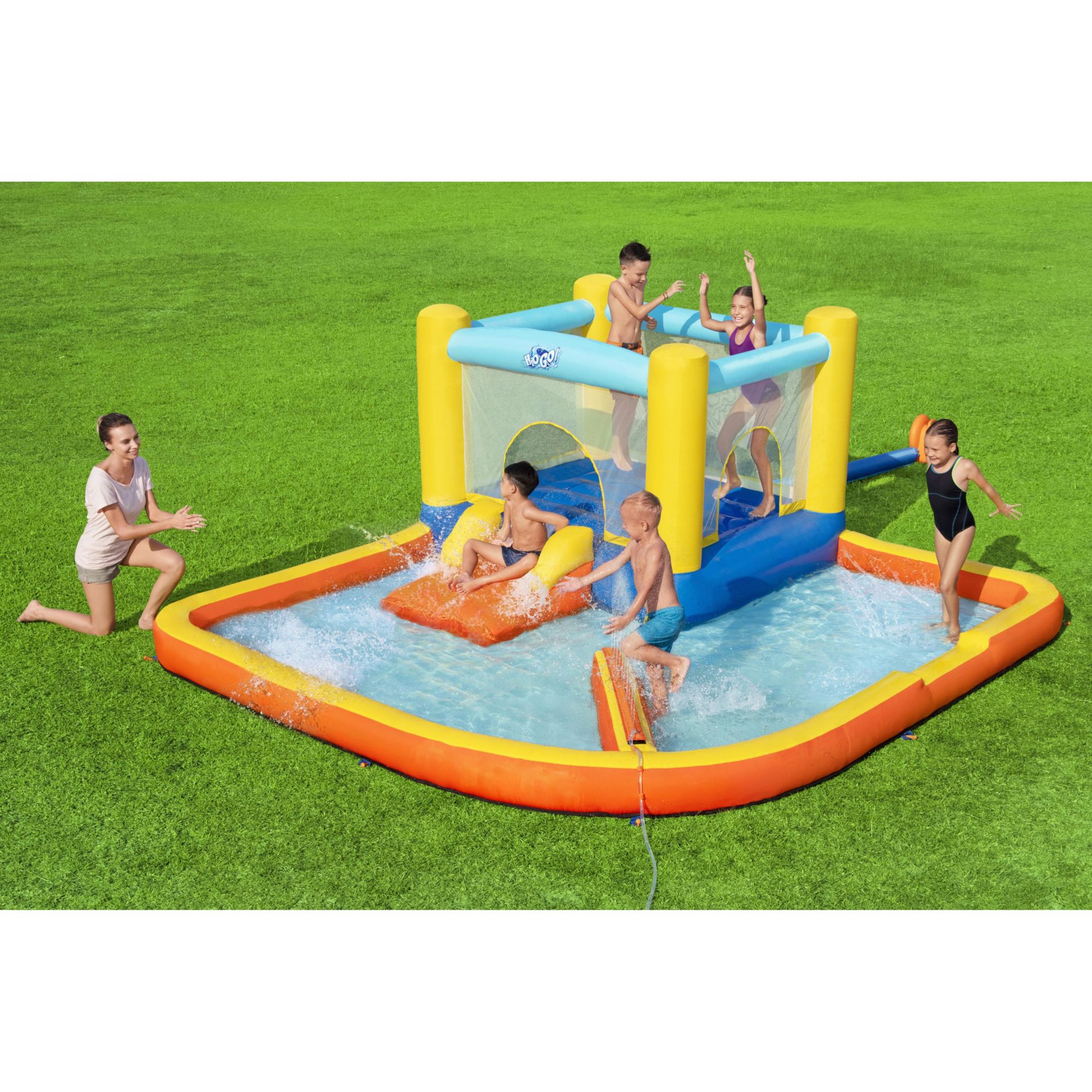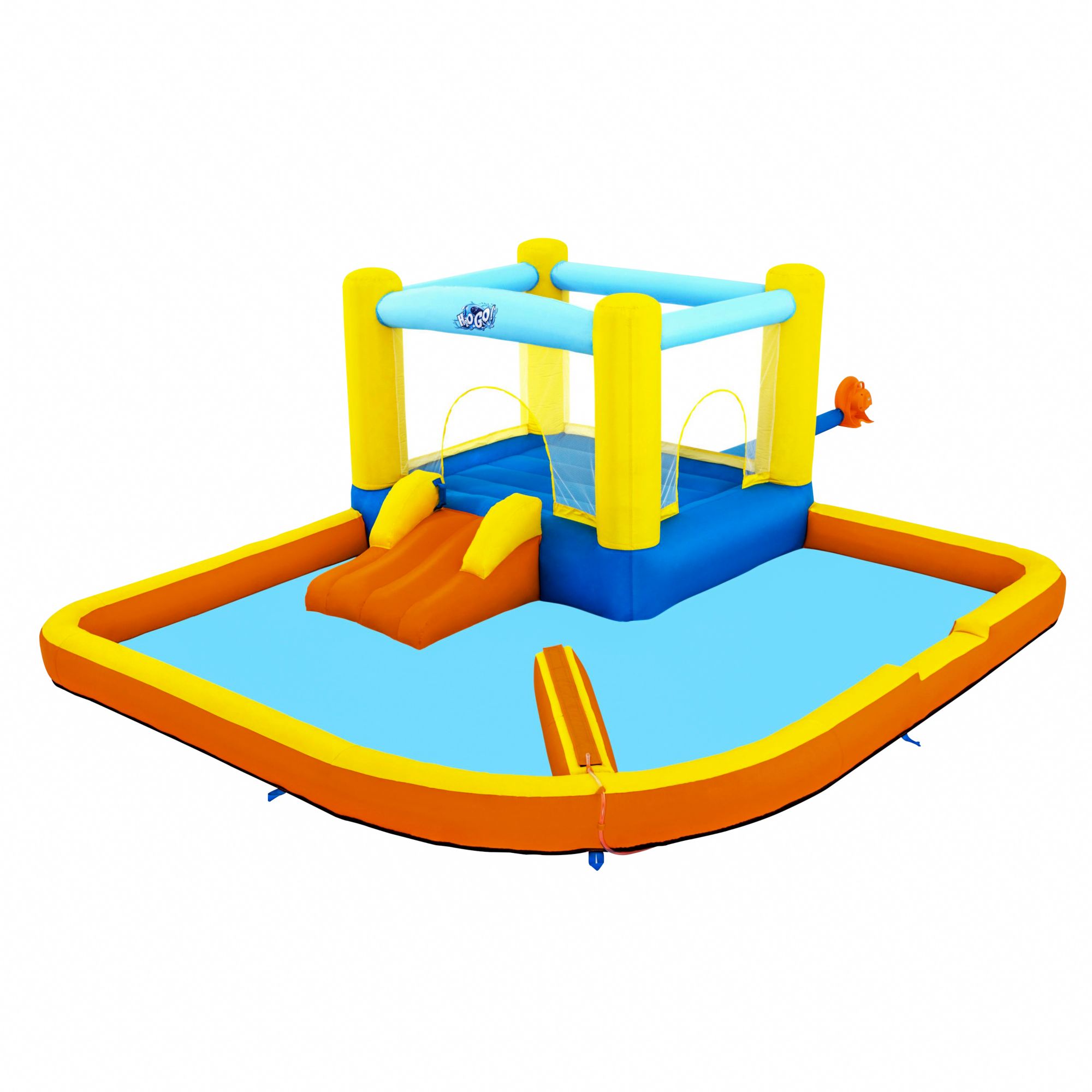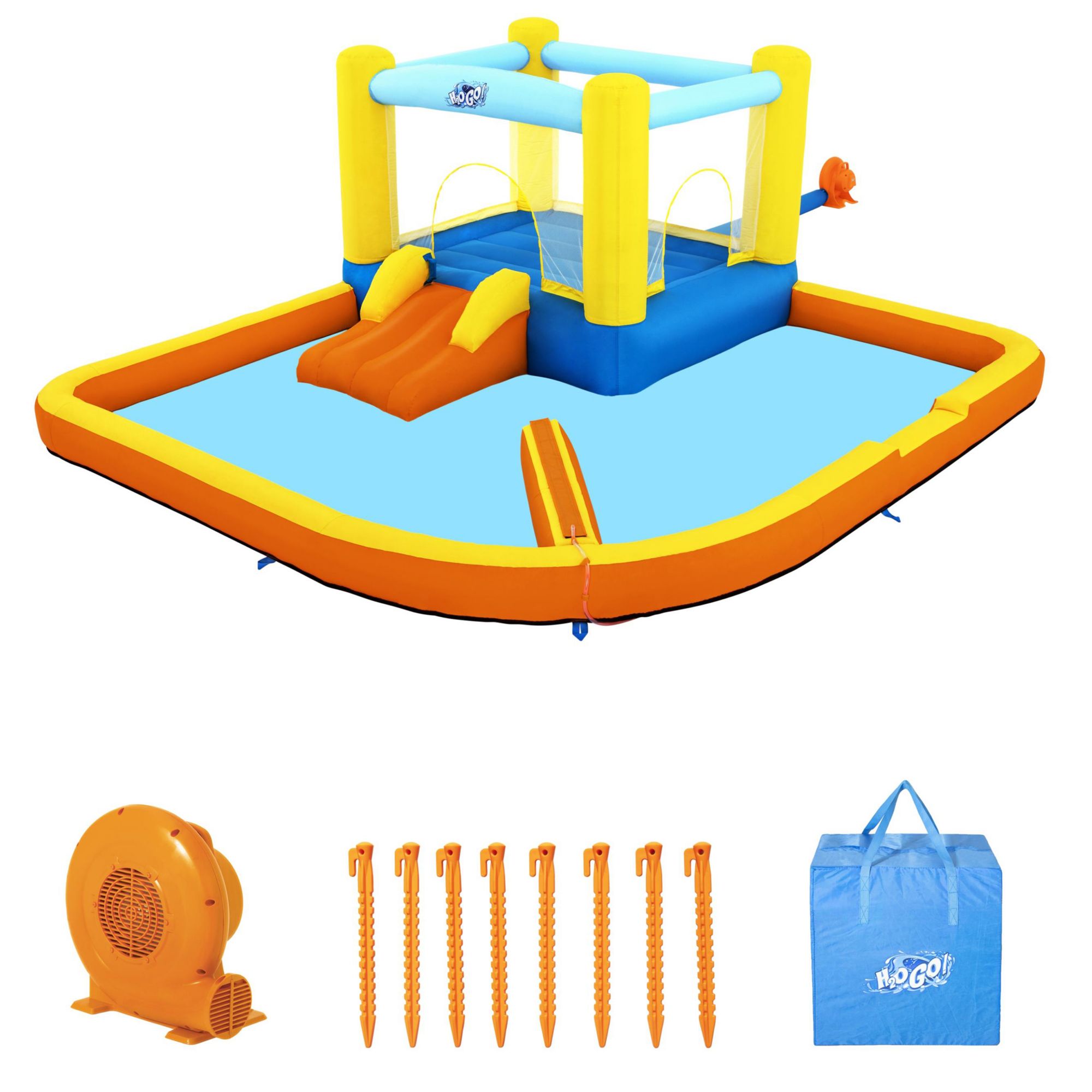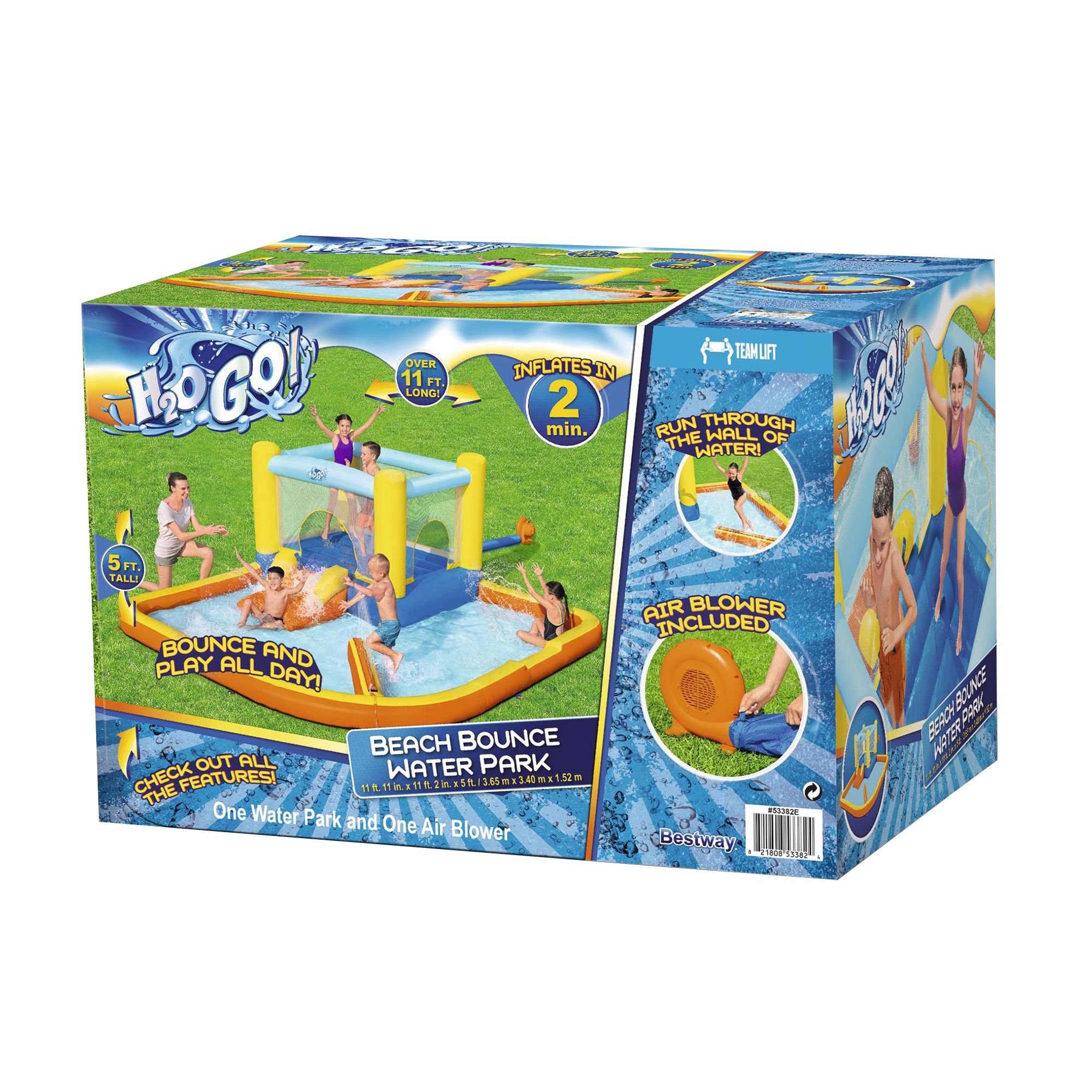 Bring bouncy fun right to your own backyard with the H20GO! Beach Bounce Inflatable Water Park. This fun park will be the talk of the entire neighborhood especially since it inflates in less than two minutes using the included blower. The giant bouncer with mesh safety walls is perfect for energy-filled kids to jump and play in the great outdoors. Featuring a slide that leads into the giant splash pool, and a sprinkler that creates a wall of water for kids to run and jump through. Your little ones will have so much fun that they'll ask to go outside and play every day. Double-stitched for increased durability, the H20GO! Beach Bounce Inflatable Water Park is perfect for parties, get-togethers and hot summer days year after year.